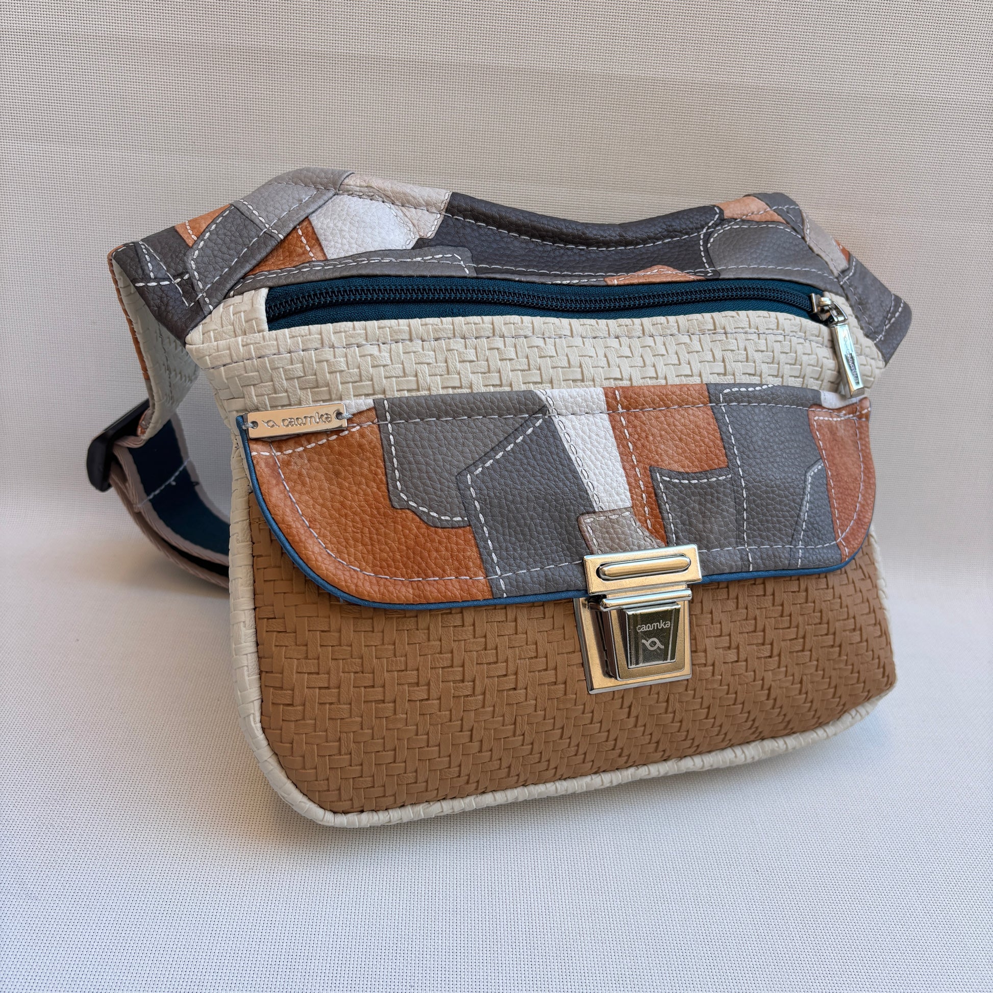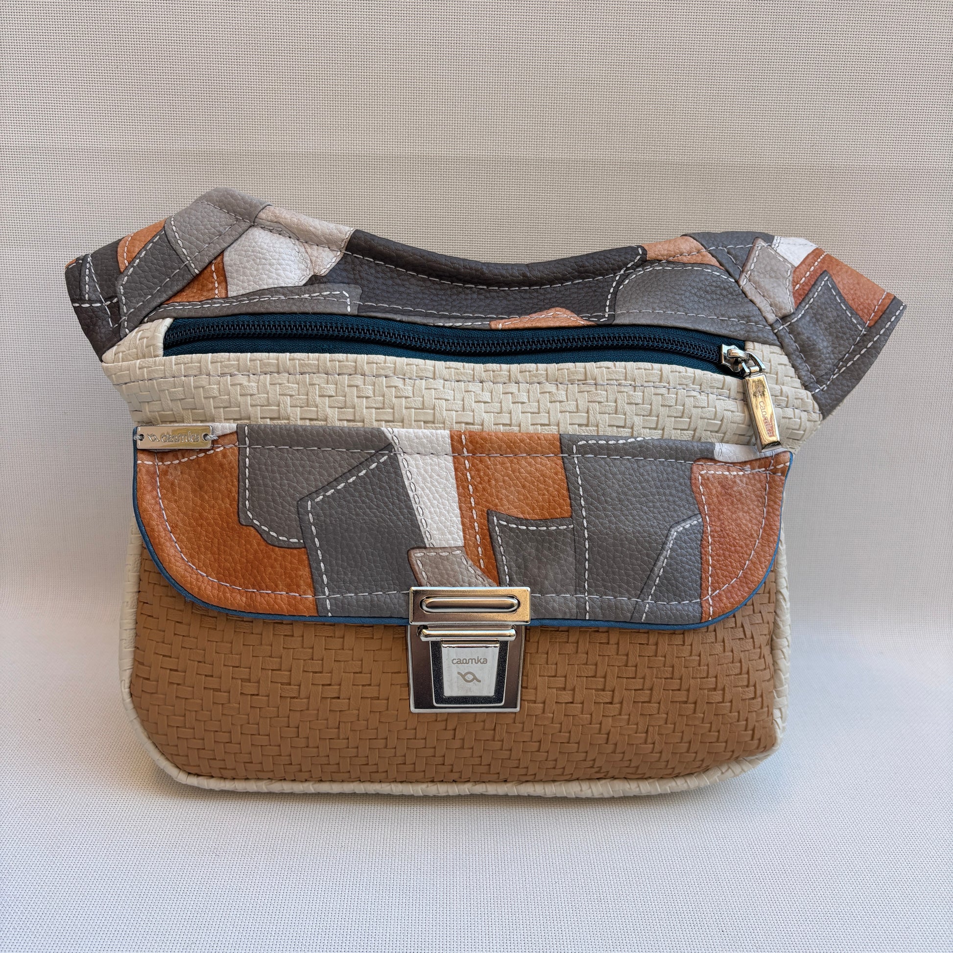 Solapa en patchwork geométrico de polipiel en tonos gris, cuero y teja.