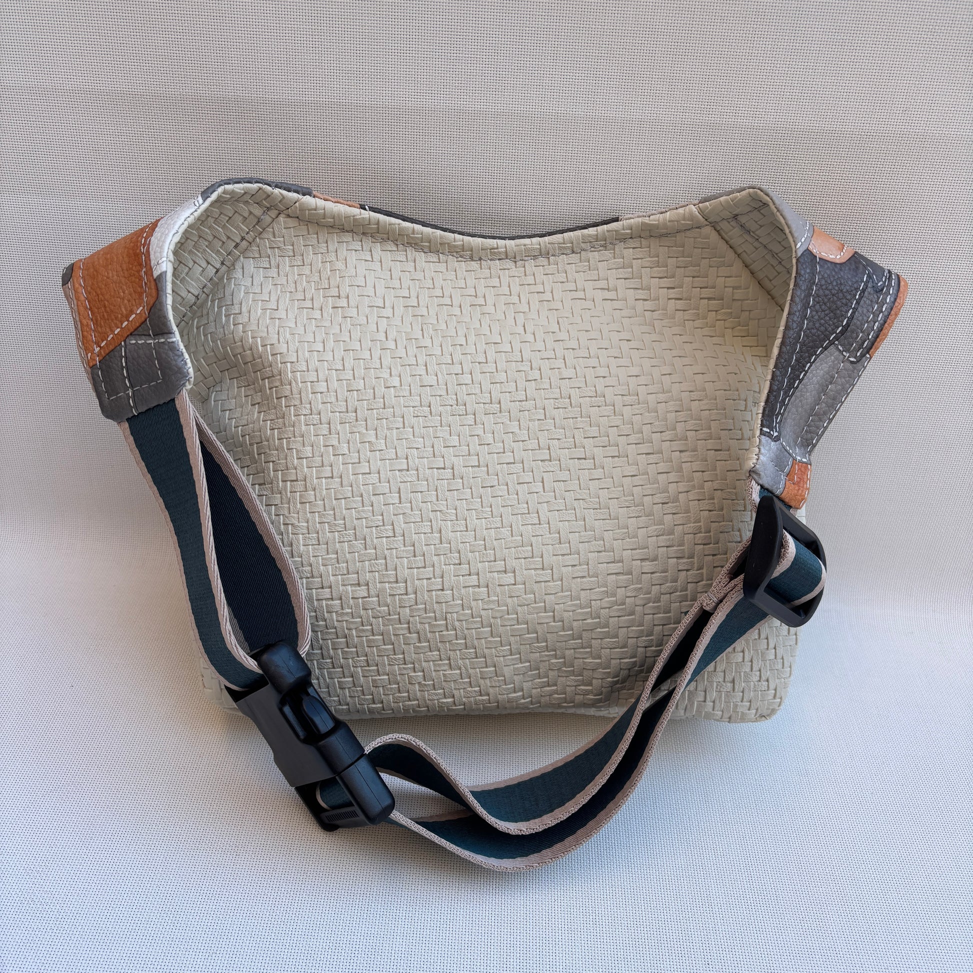 La Elegant Patchwork Top 18469 es una riñonera fresca y equilibrada, confeccionada en polipiel texturizada efecto trenzado en tono marfil combinada con base en camel cálido.