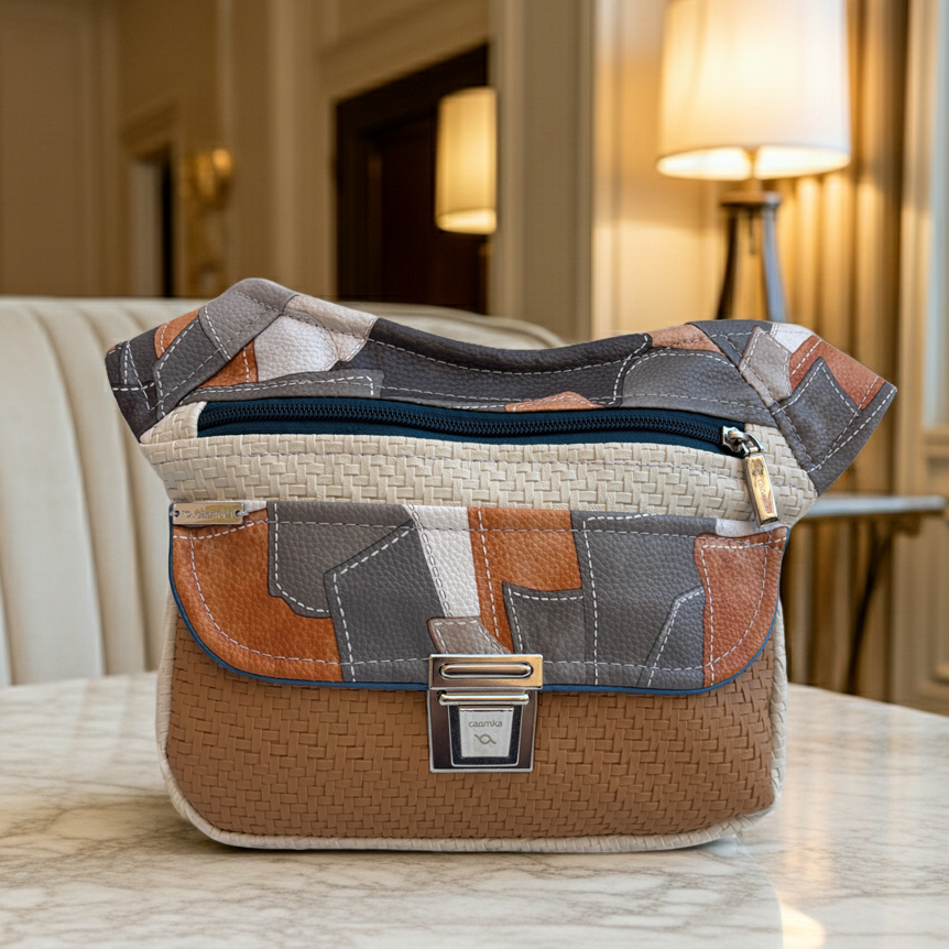 Su solapa en patchwork geométrico mezcla tonos gris, cuero y teja, creando un juego visual dinámico y armónico.