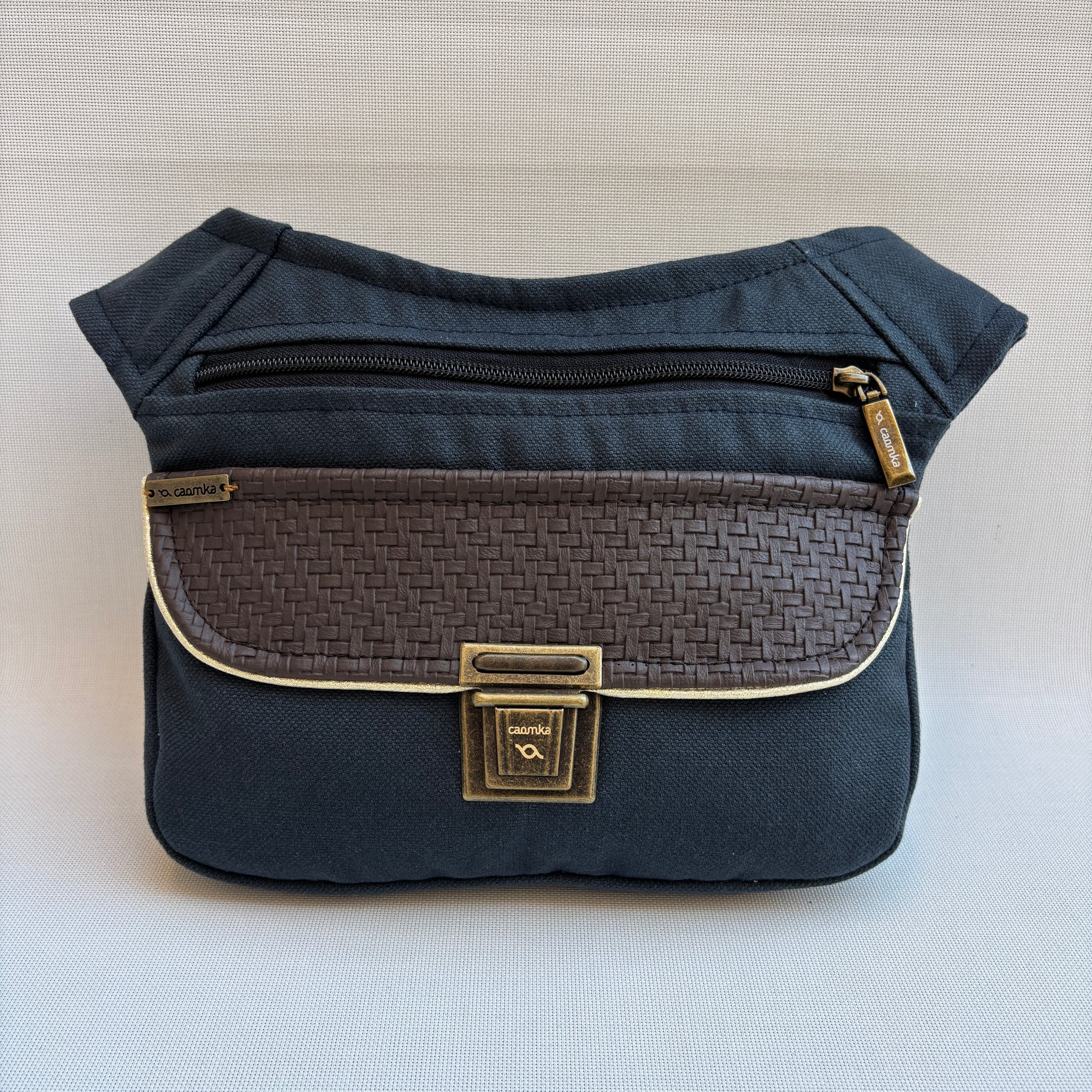 Su base en tejido azul marino aporta profundidad y sobriedad, mientras la solapa en polipiel especial trenzada marrón se convierte en el foco visual de la pieza, aportando textura y carácter