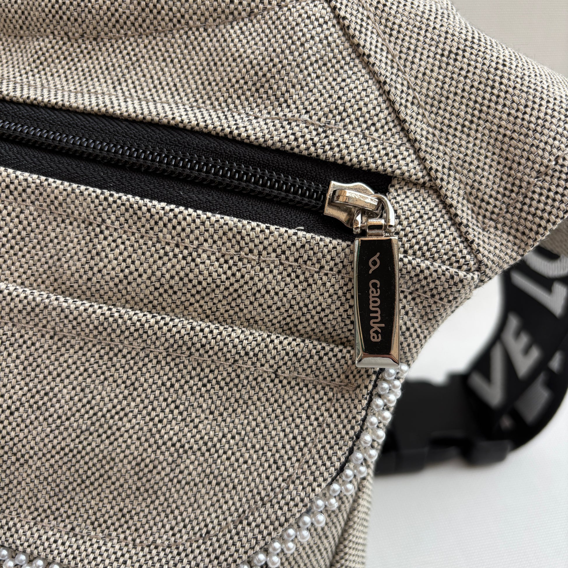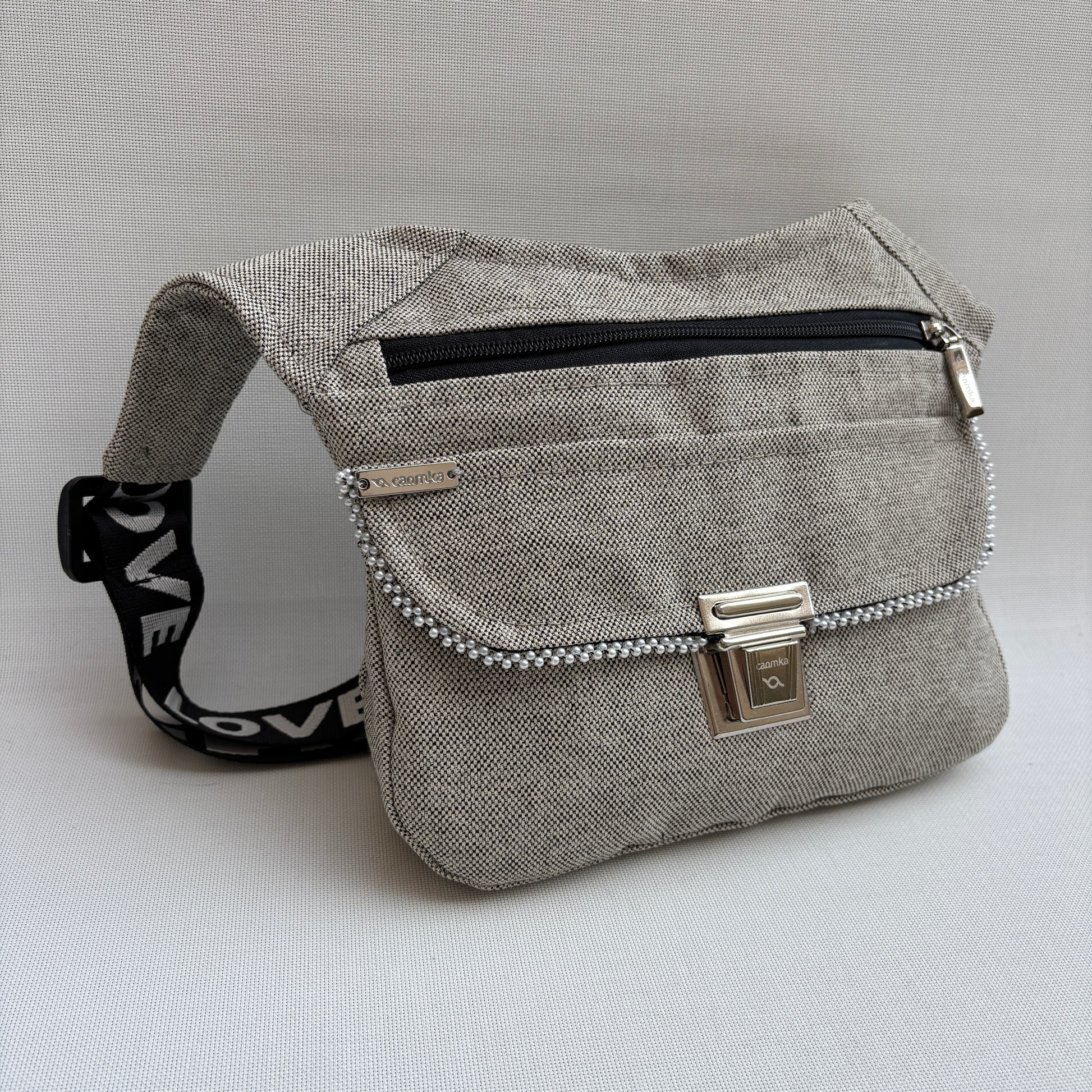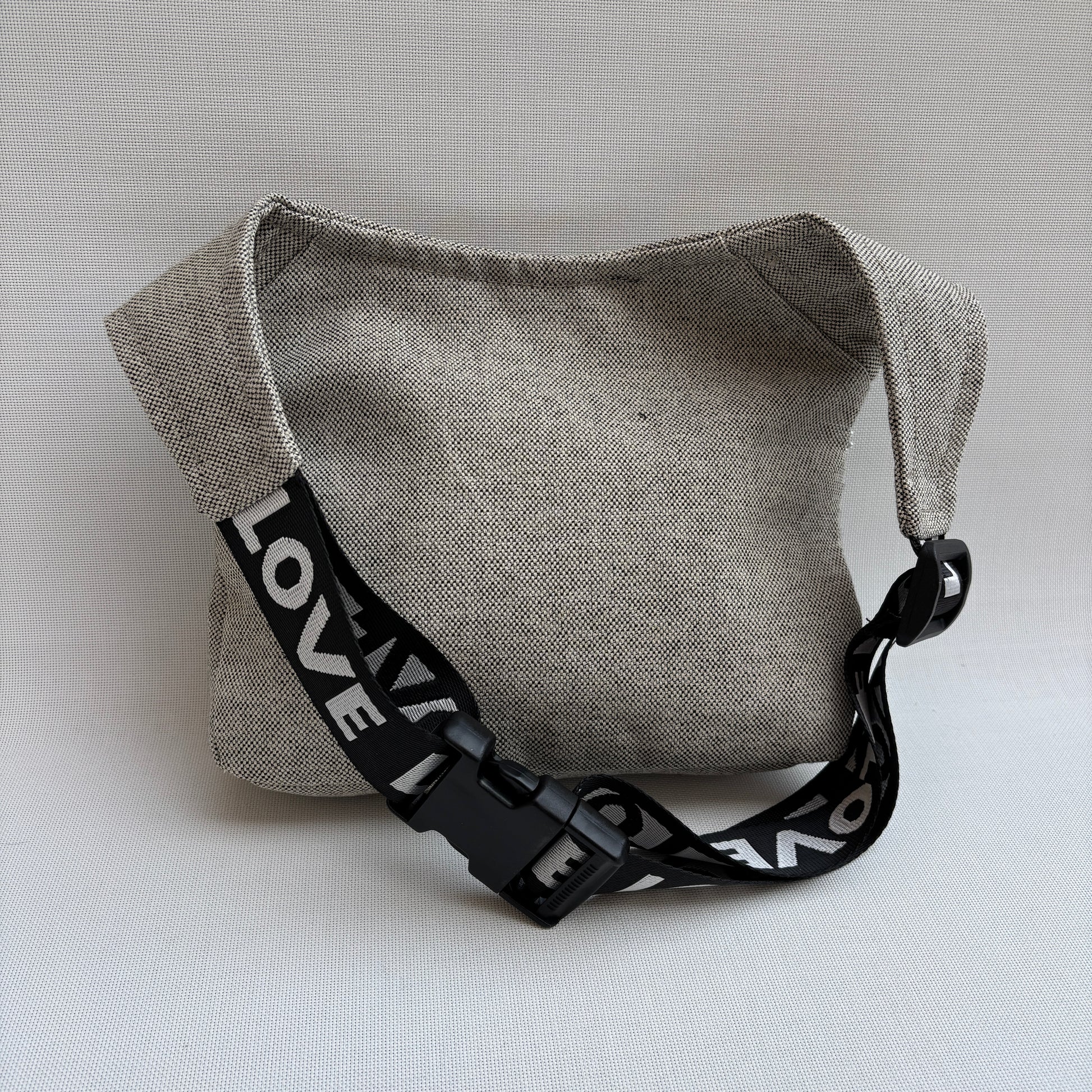 El tejido beige jaspeado aporta un aire natural y atemporal, mientras que la correa negra con el mensaje “LOVE” introduce ese contraste moderno y con personalidad que la convierte en una riñonera única.