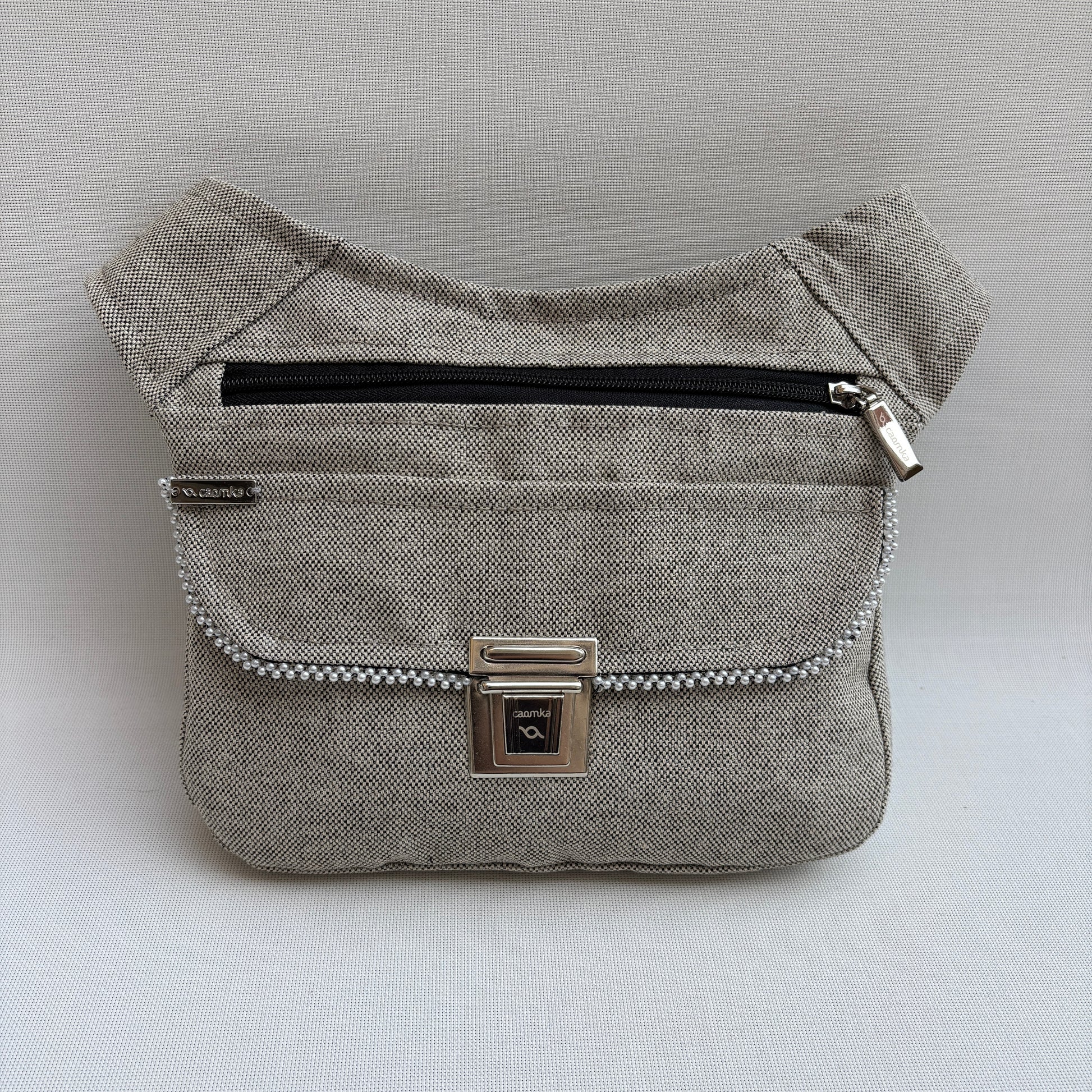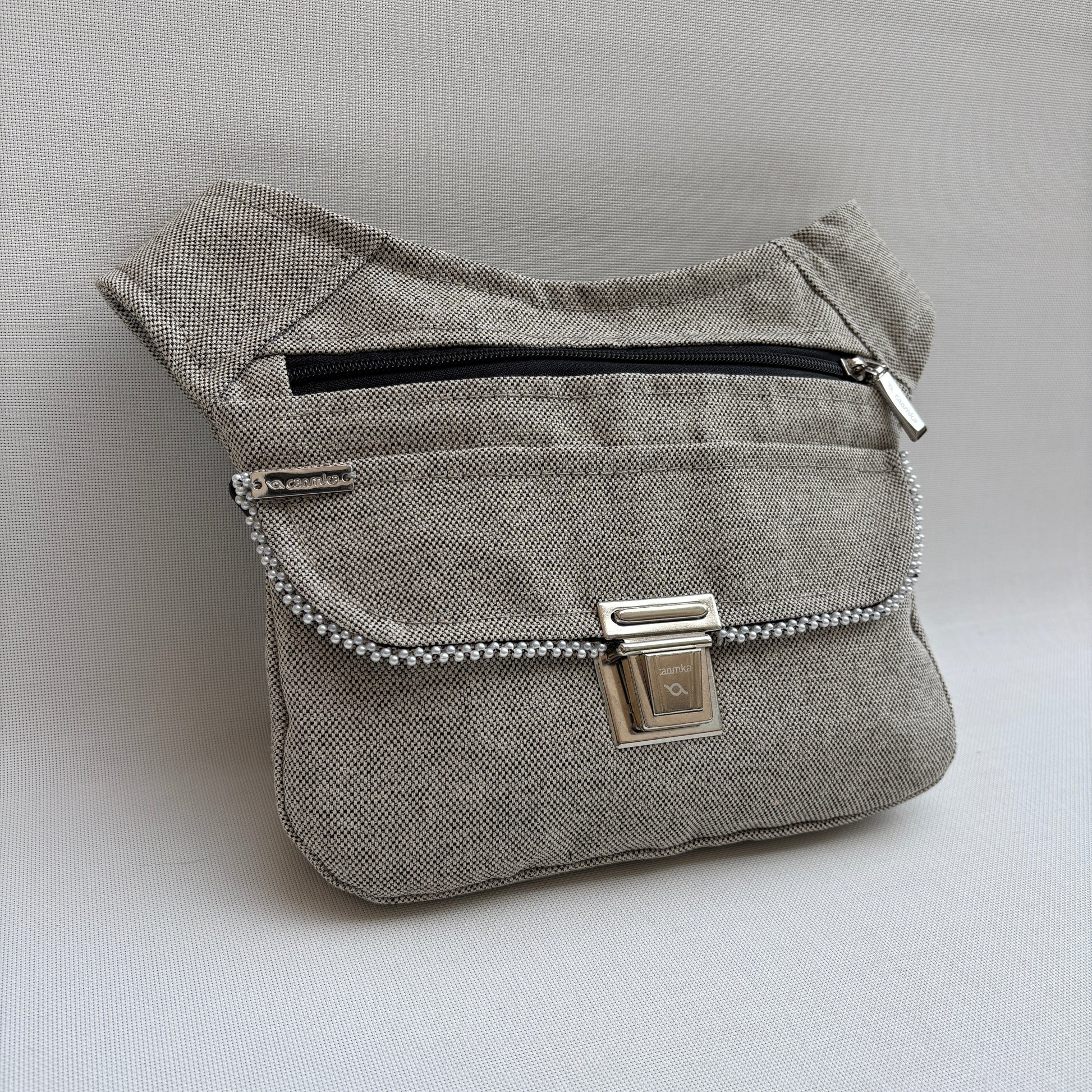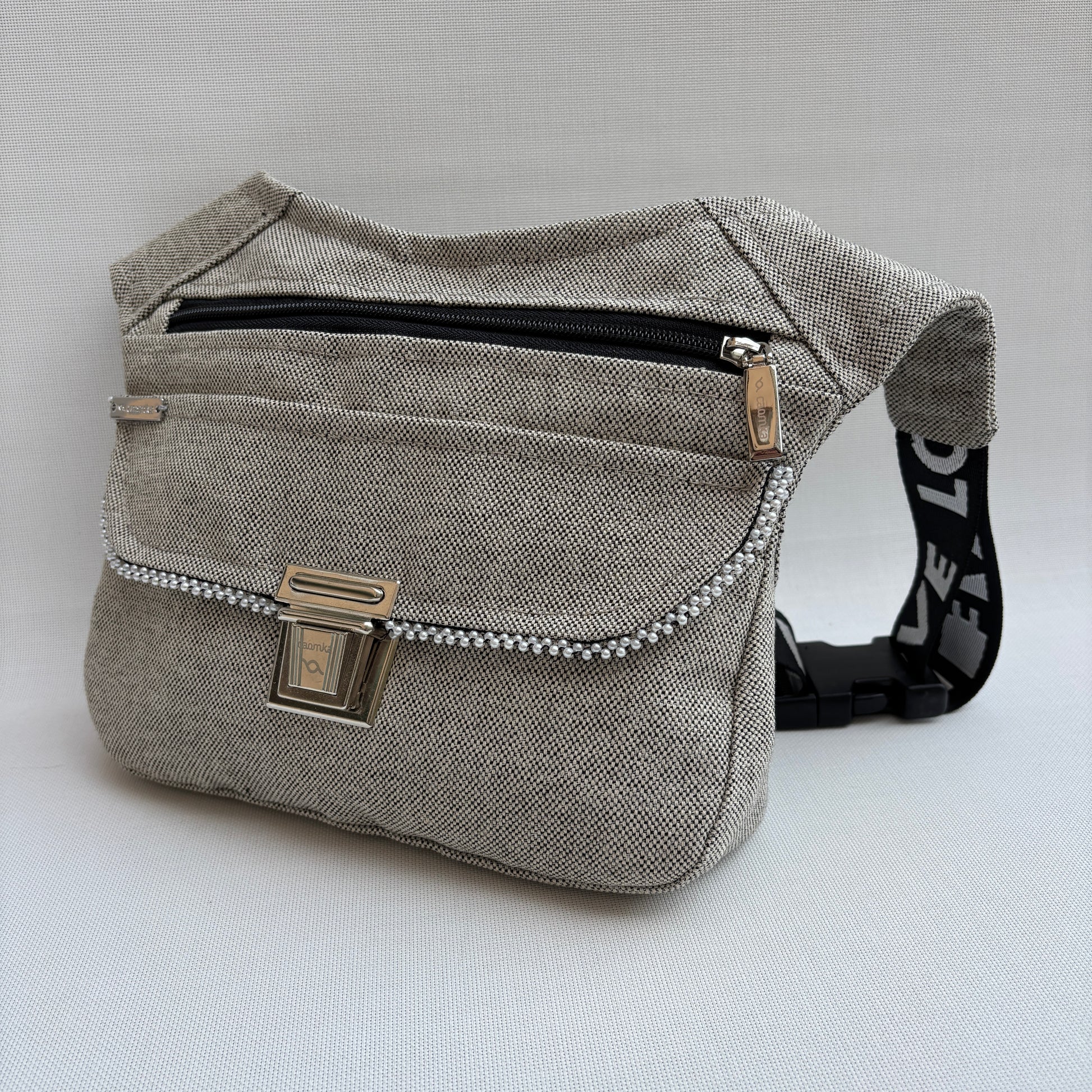 El tejido beige jaspeado aporta un aire natural y atemporal, mientras que la correa negra con el mensaje “LOVE” introduce ese contraste moderno y con personalidad que la convierte en una riñonera única.