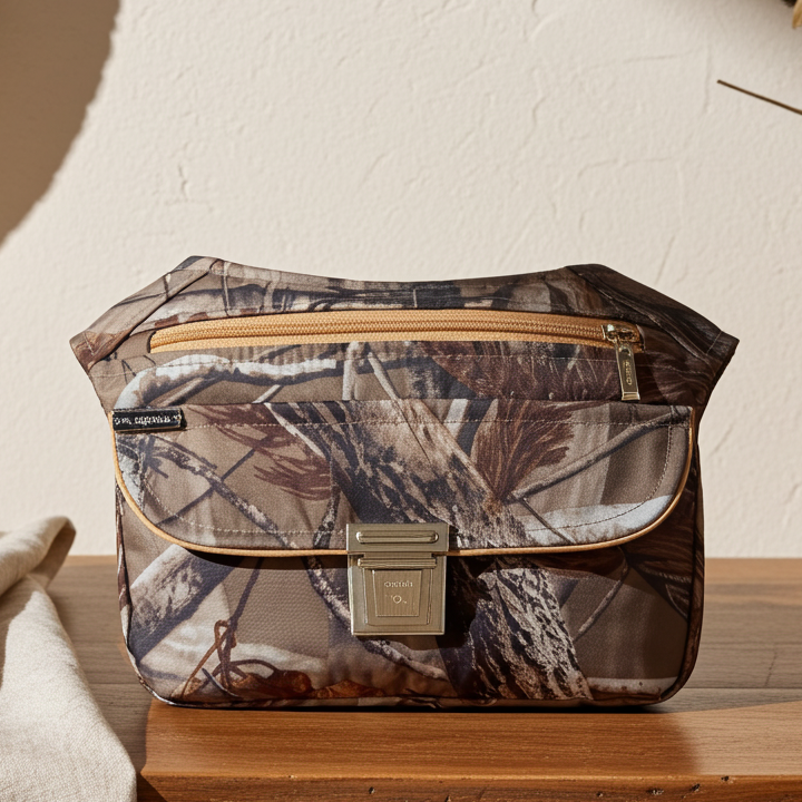 Color: Tonos tierra, camuflaje bosque y detalles beige.