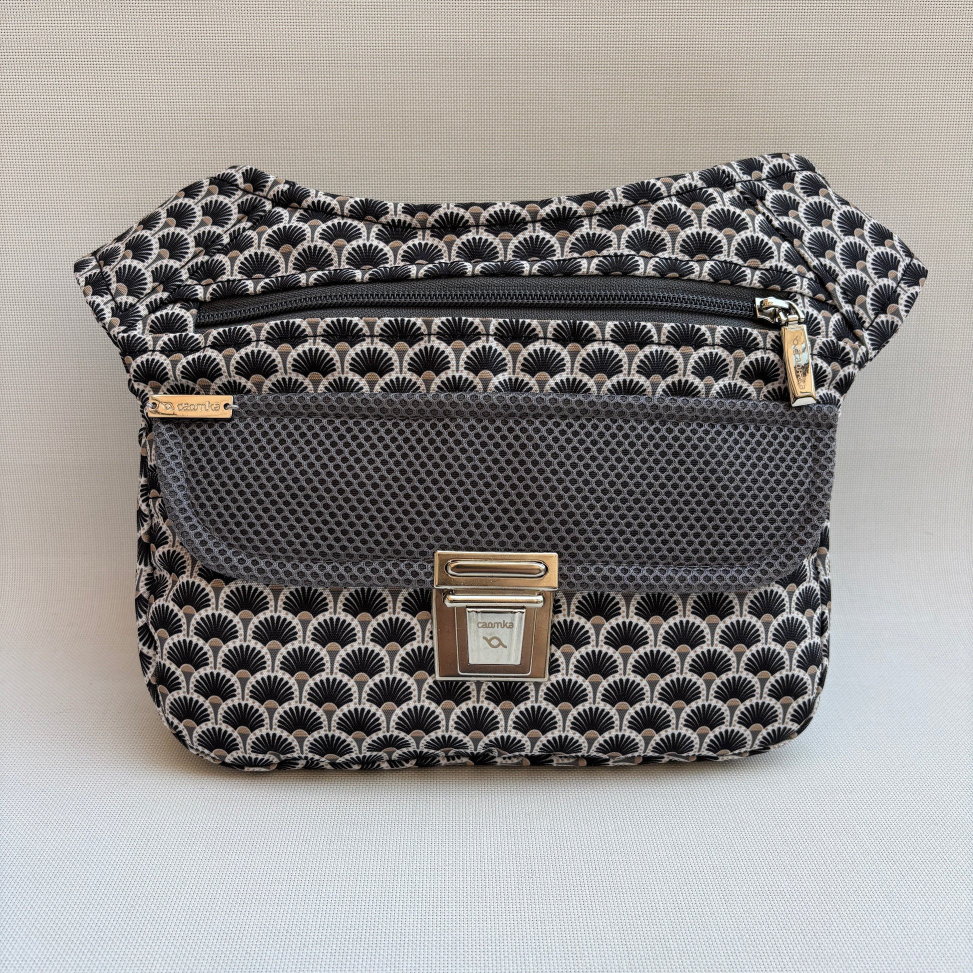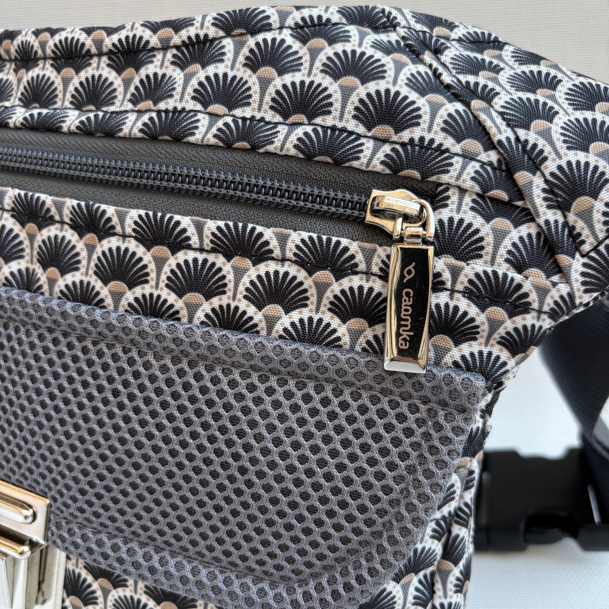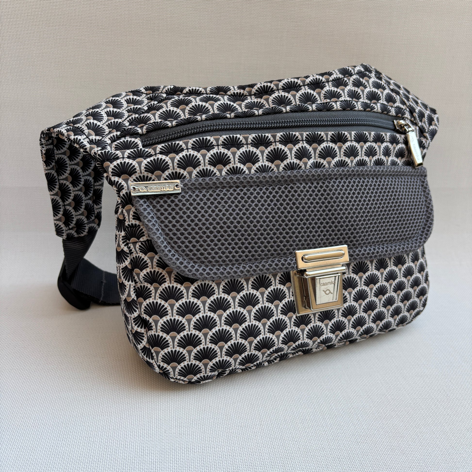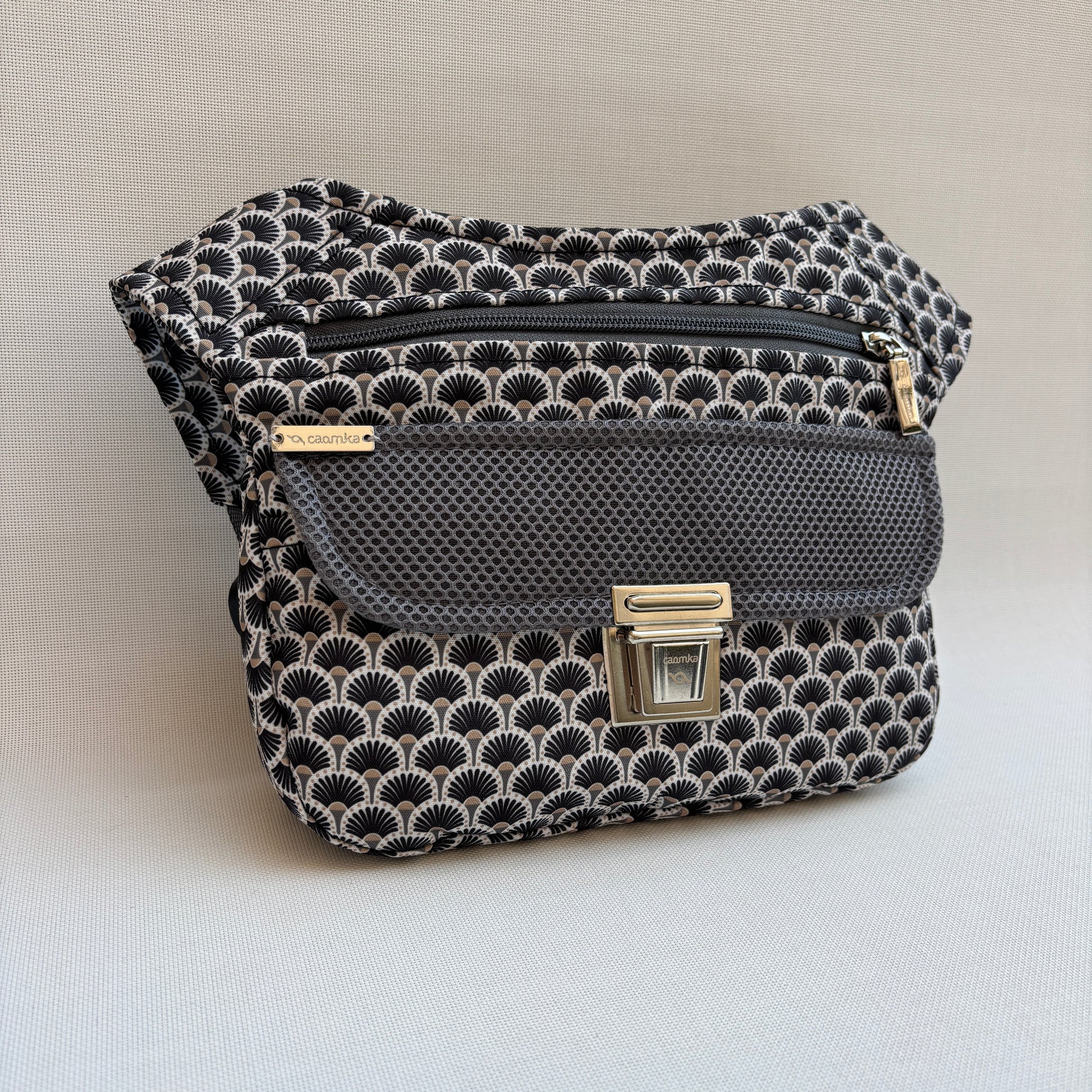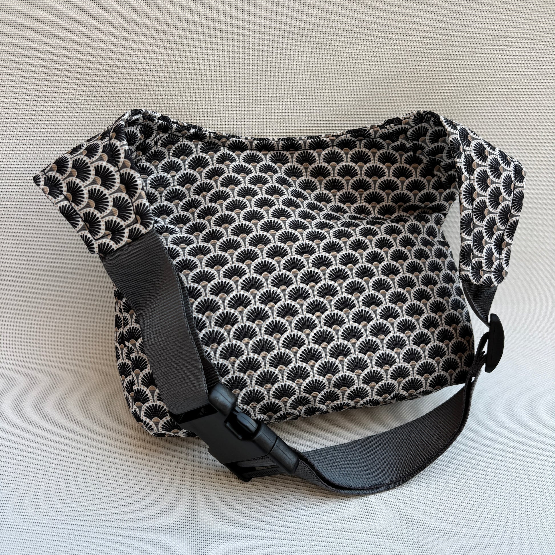 Cuerpo en tejido estampado geométrico inspirado en patrones japoneses en negro, gris y beige.