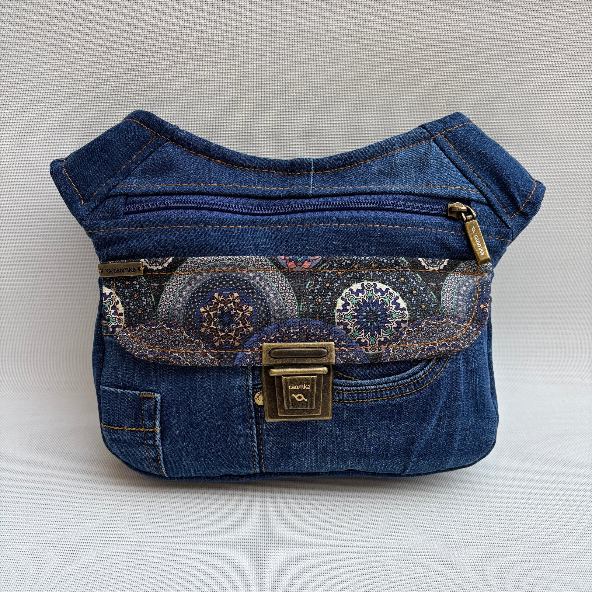 La solapa frontal incorpora un estampado mandala lleno de color y geometría, creando un contraste precioso entre lo artesanal y lo urbano. El cuerpo mantiene la estructura resistente del vaquero, mientras que la correa en gris y negro añade un toque moderno y cómodo para el día a día.