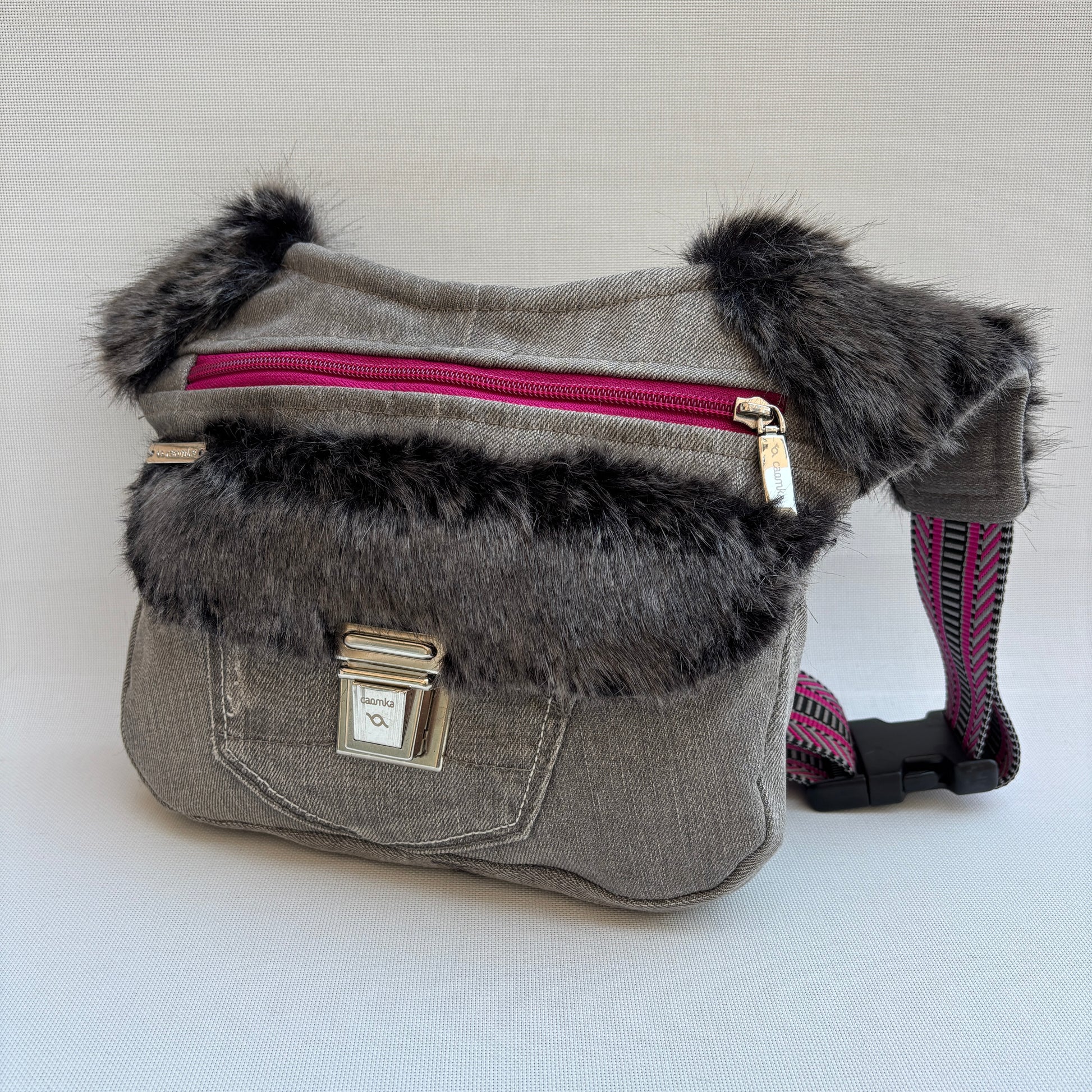 Color: Denim gris reciclado con detalles en pelo sintético gris oscuro y cremallera fucsia