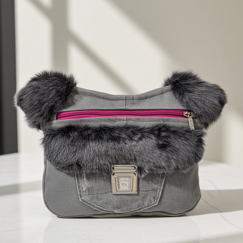 El tejido vaquero en tono gris aporta una estética neutra y versátil, mientras el contraste con el pelo sintético gris oscuro añade volumen, textura y personalidad