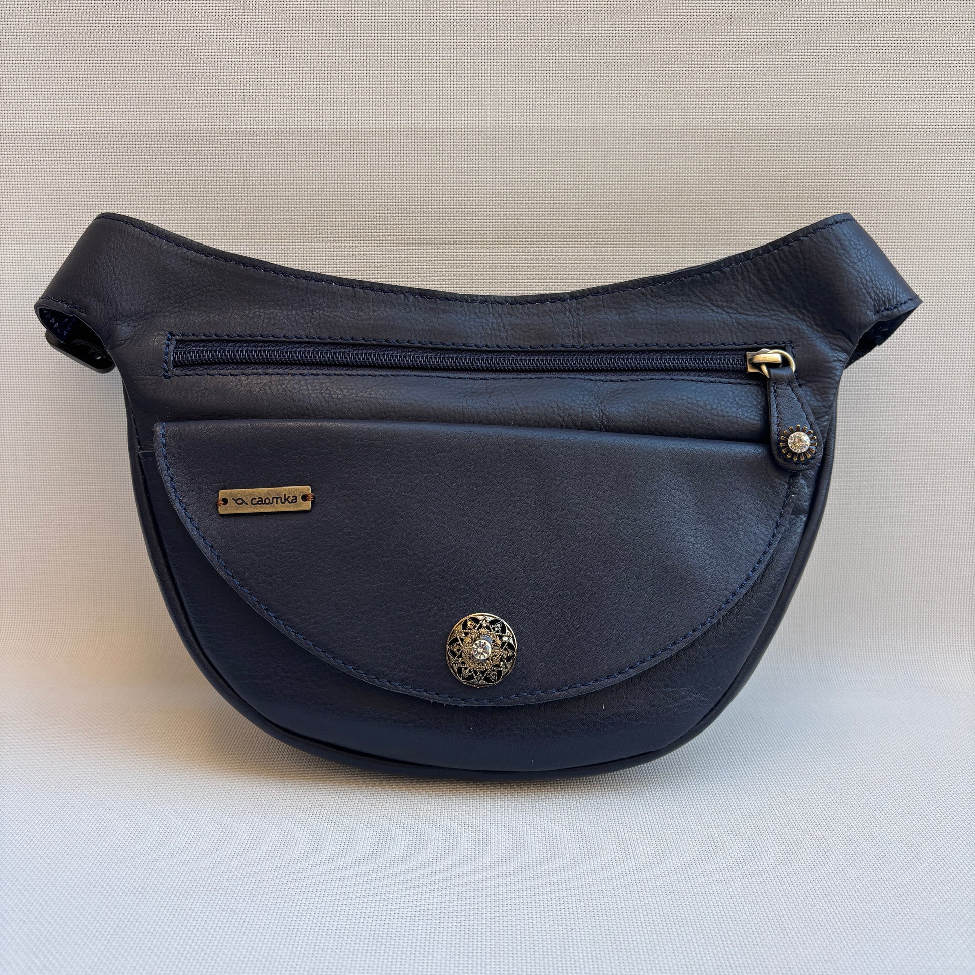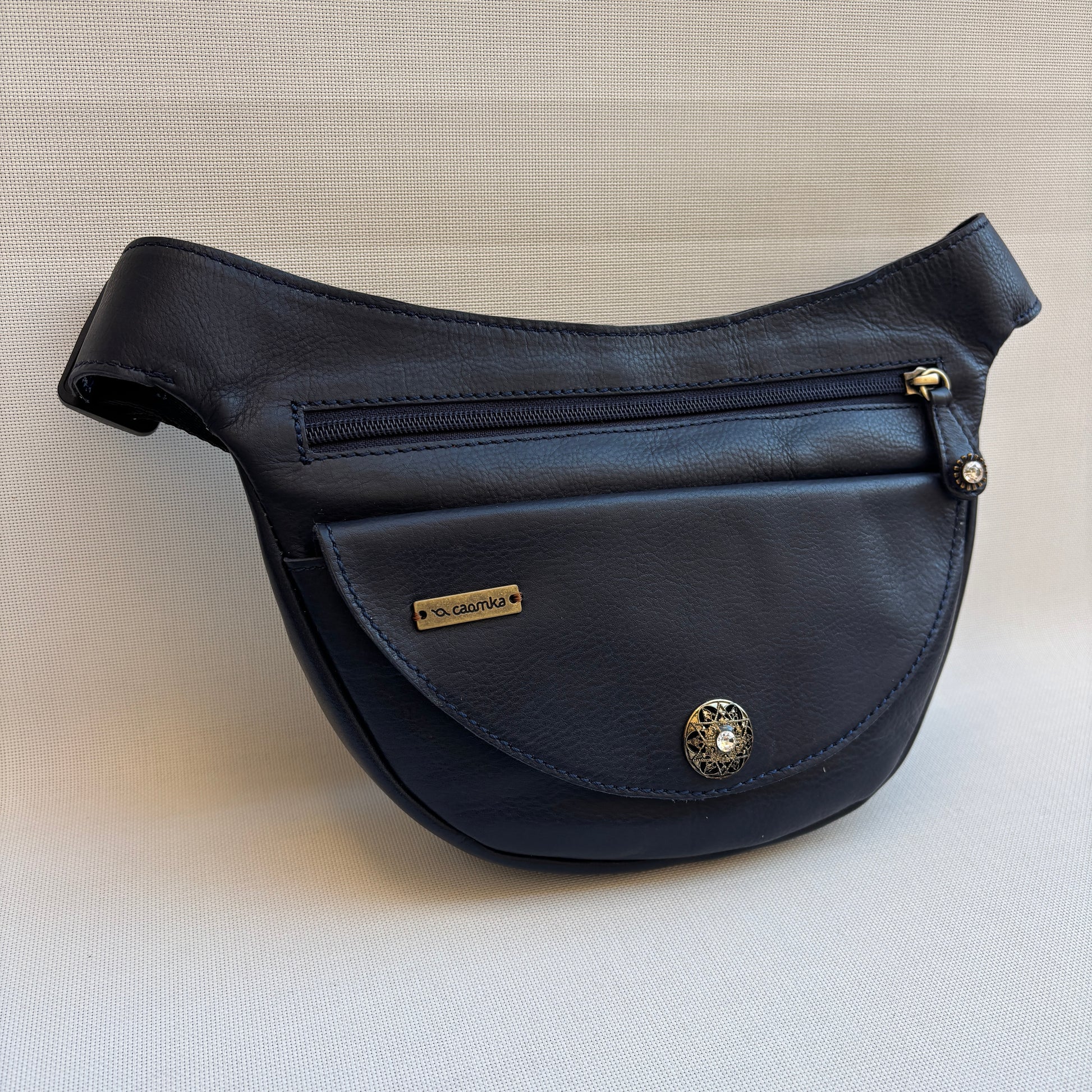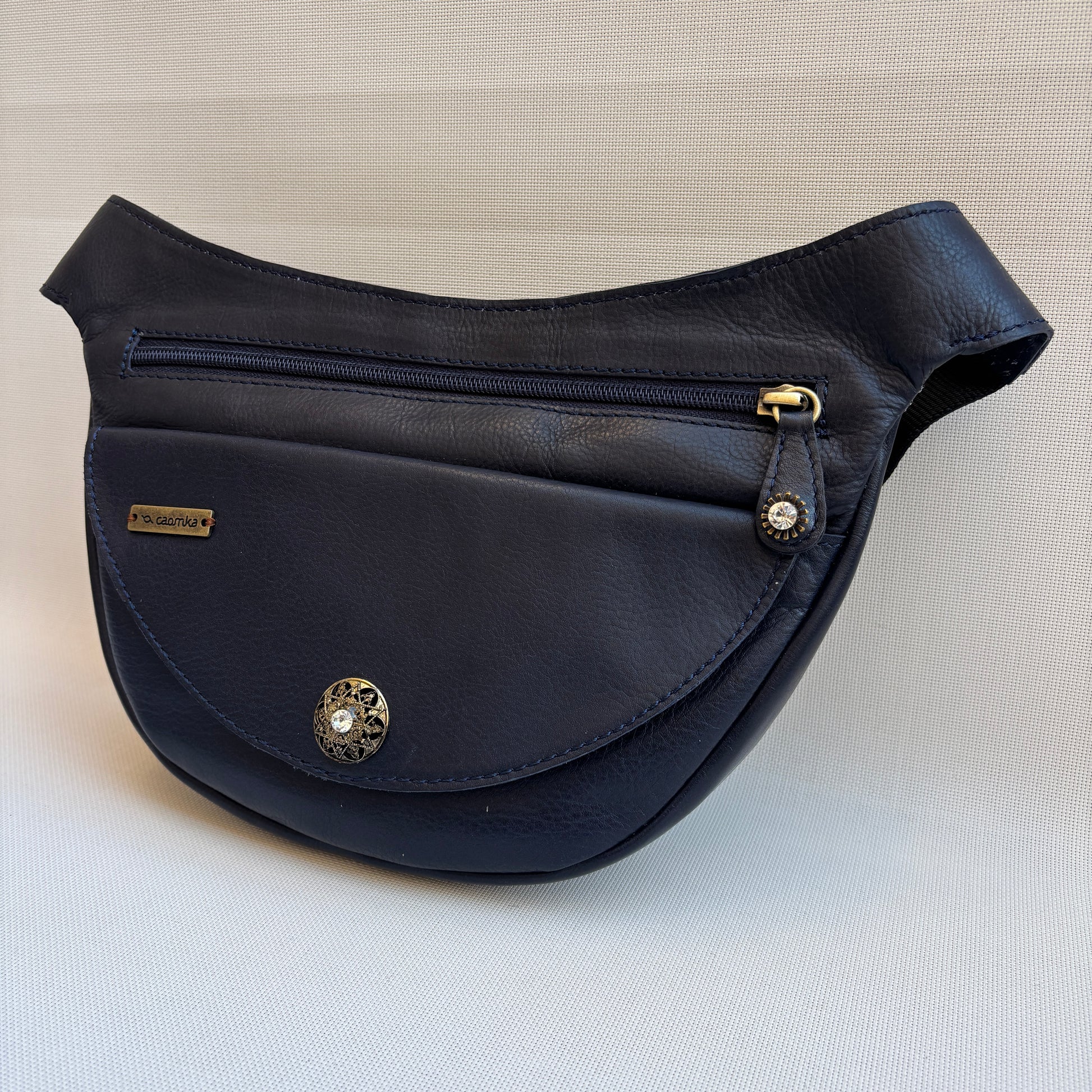 Bolso de Cadera multifunción (Riñonera · Bolso · Bandolera) confeccionado íntegramente en piel natural azul profundo.