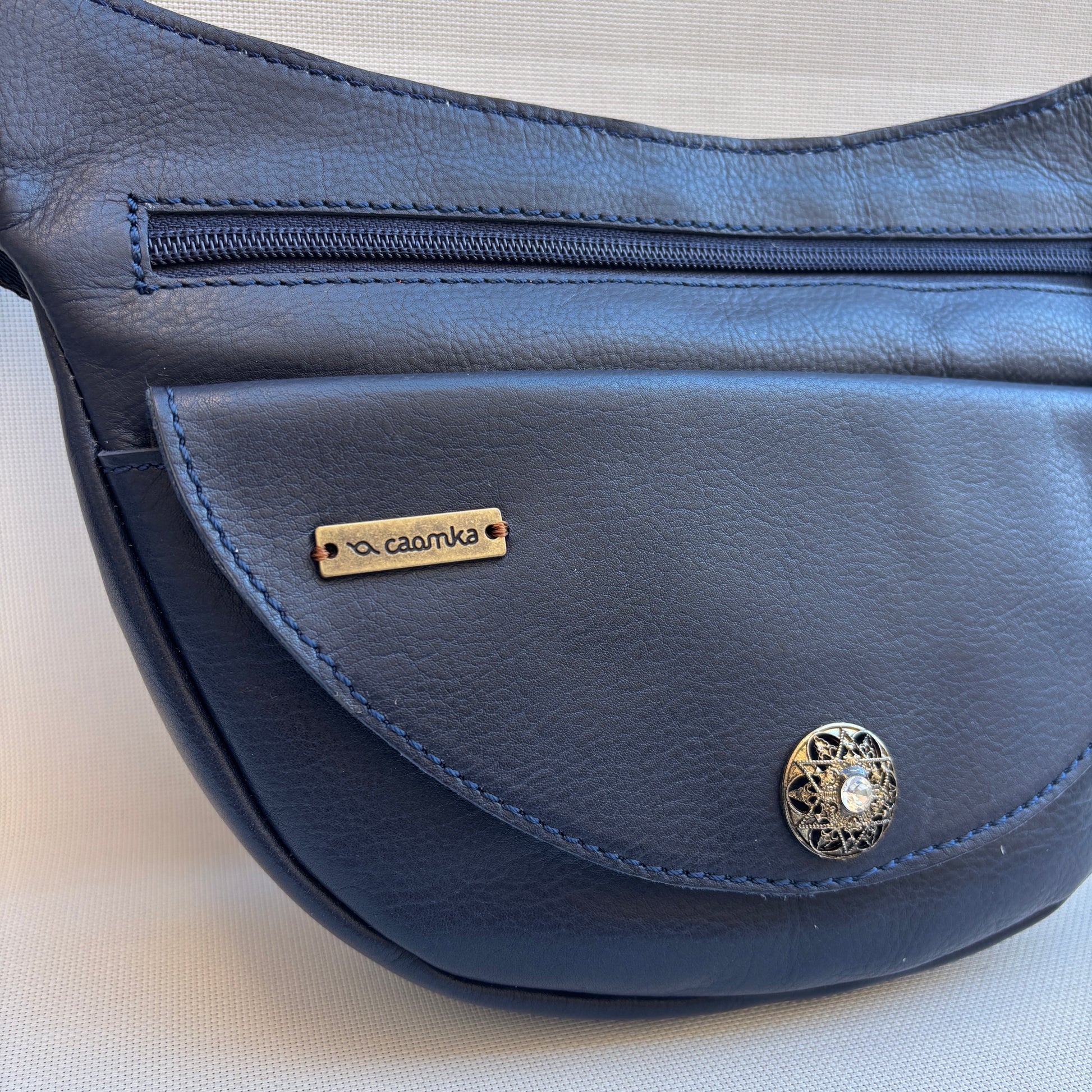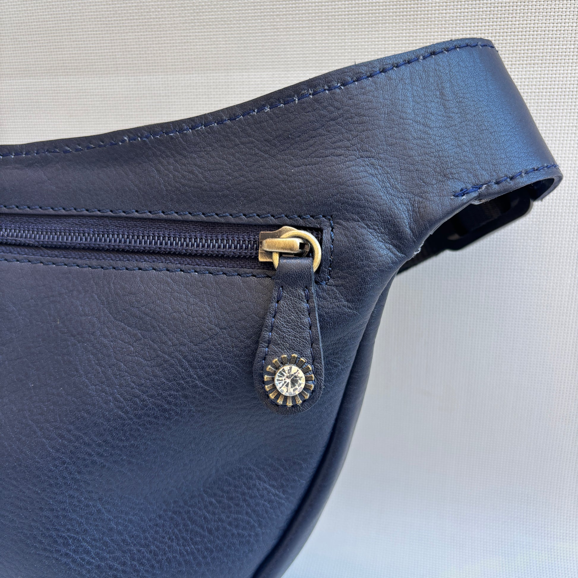 Bolsillo principal de gran apertura con cremallera superior de nylon azul marino y tirador en piel con detalle joya cristal transparente facetado y aro metálico en oro viejo.