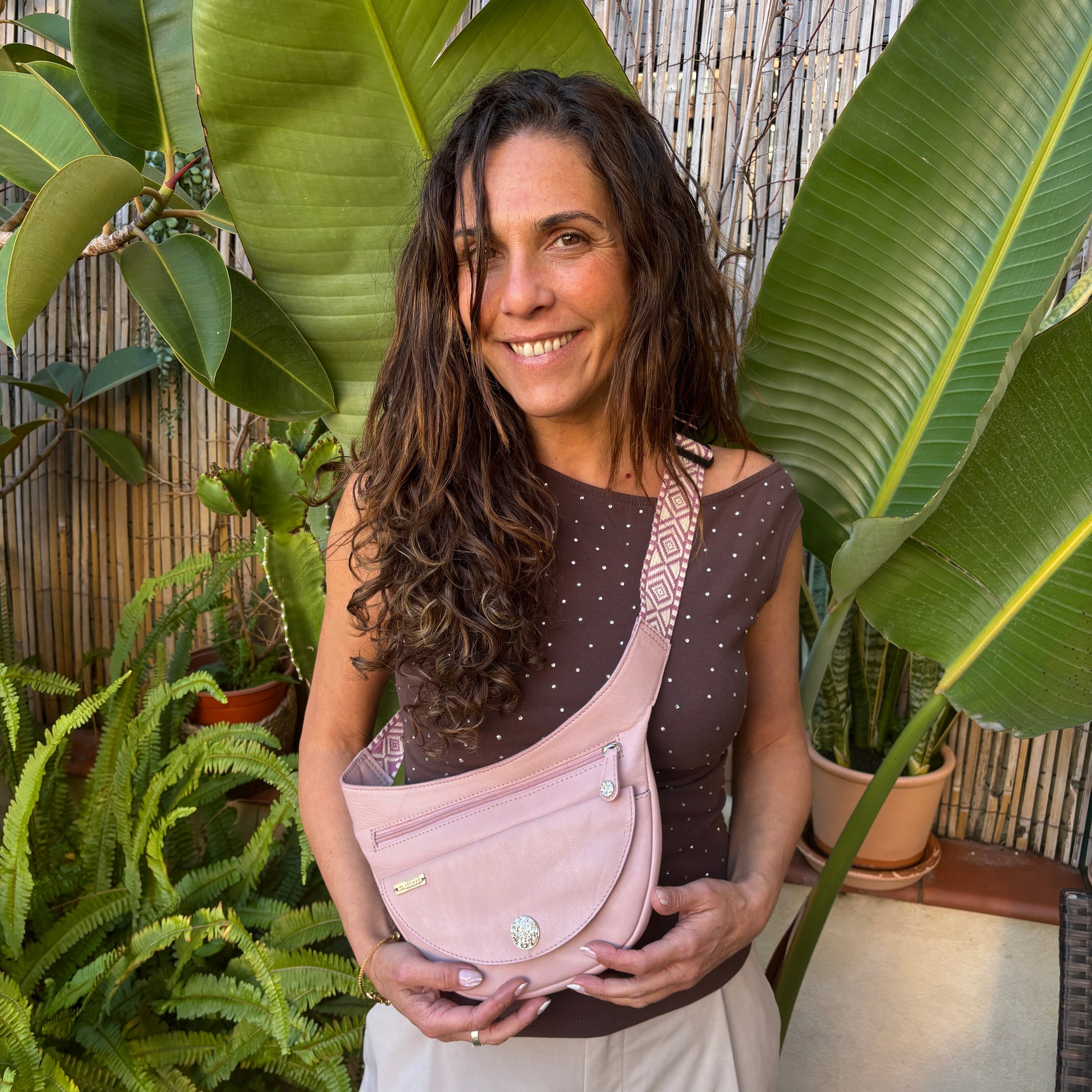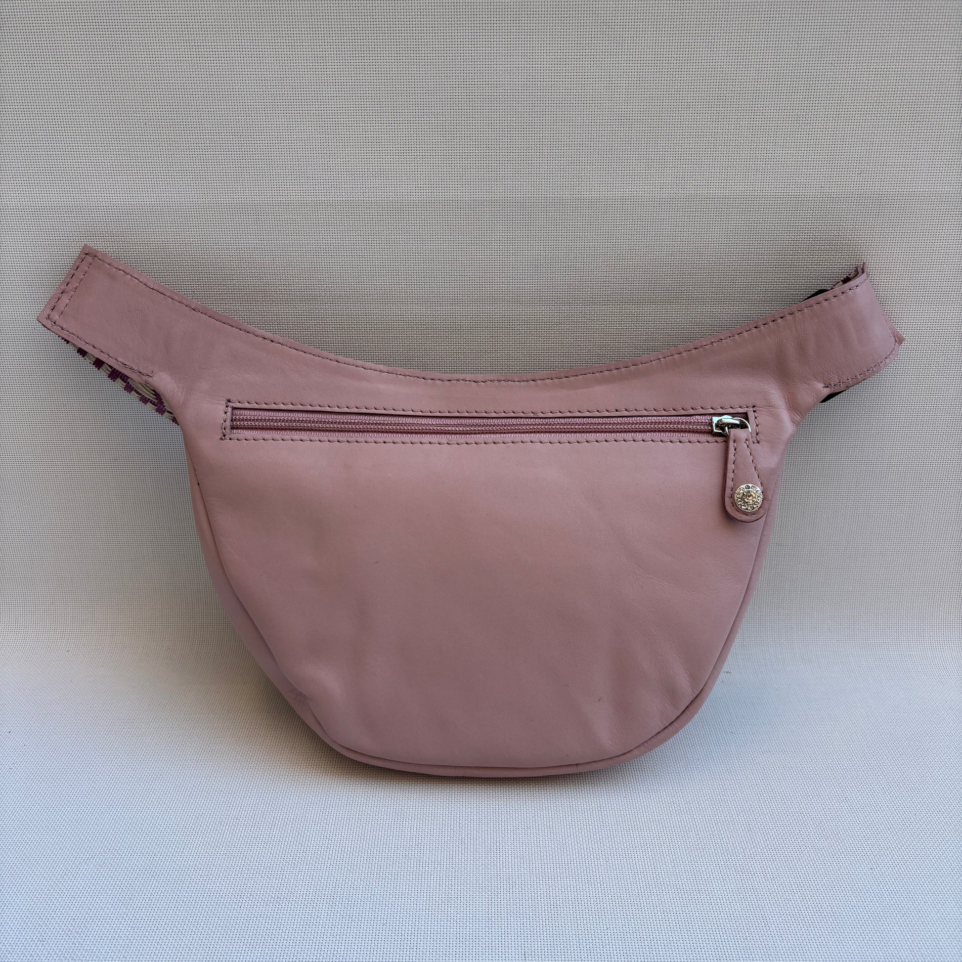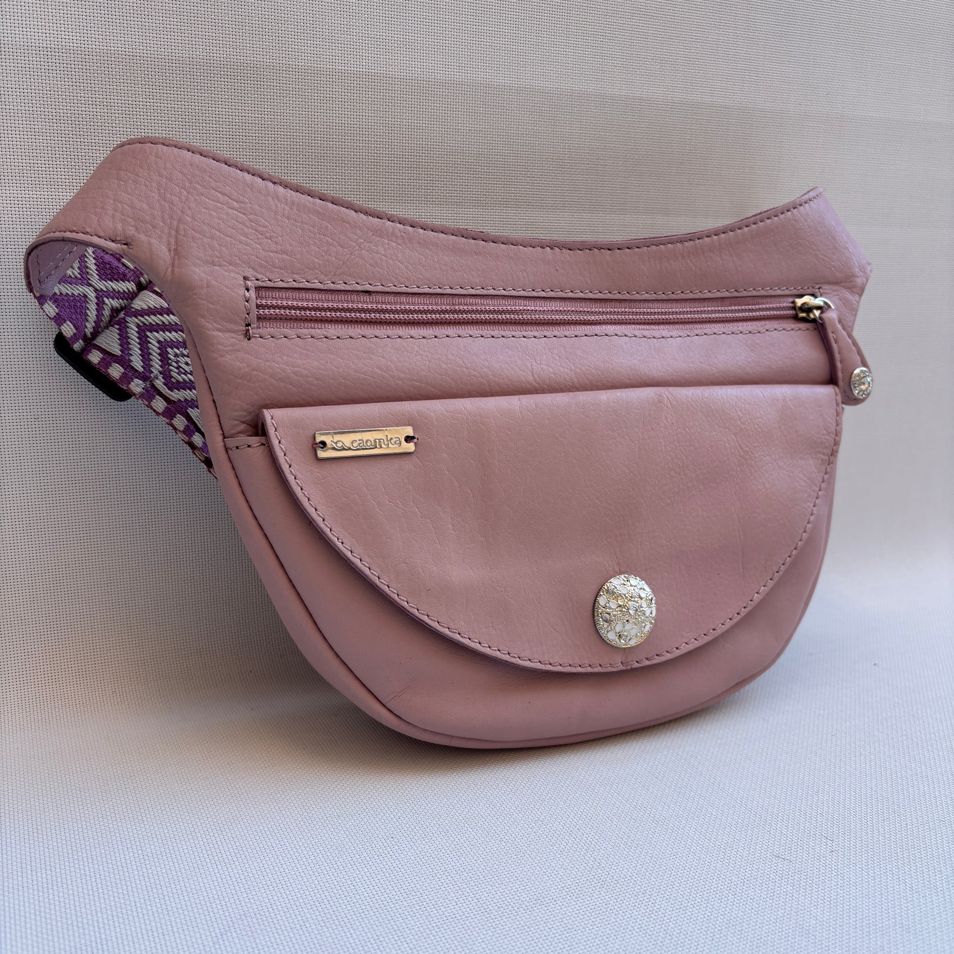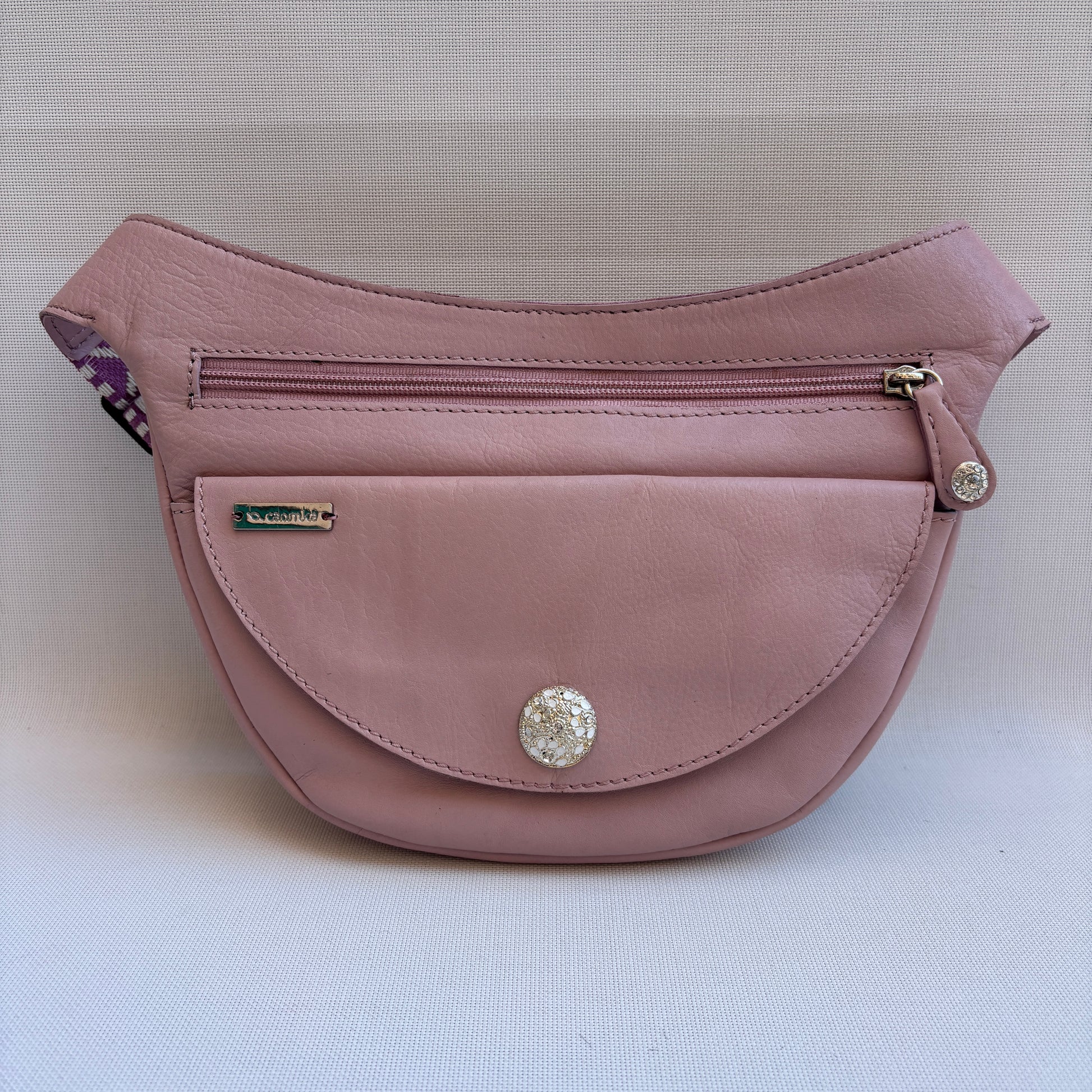 Bolso de Cadera multifunción (Riñonera · Bolso · Bandolera) confeccionado íntegramente en piel natural rosa empolvado.