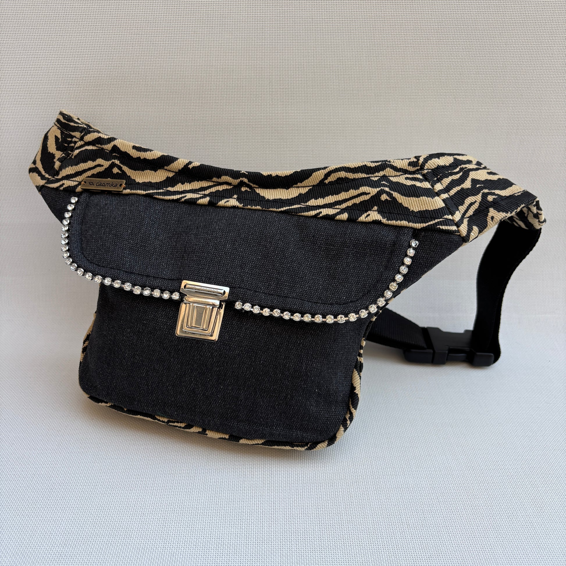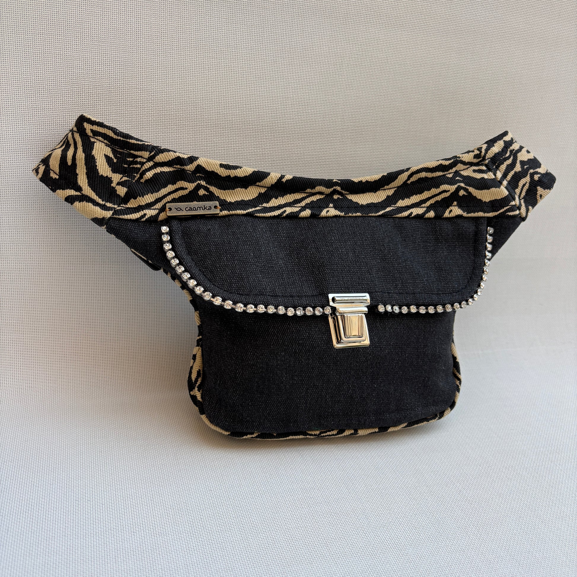 Su diseño mezcla un tejido animal print tipo cebra en negro y beige con un frontal negro liso que aporta equilibrio visual y realza todavía más el detalle decorativo de strass que recorre la solapa.