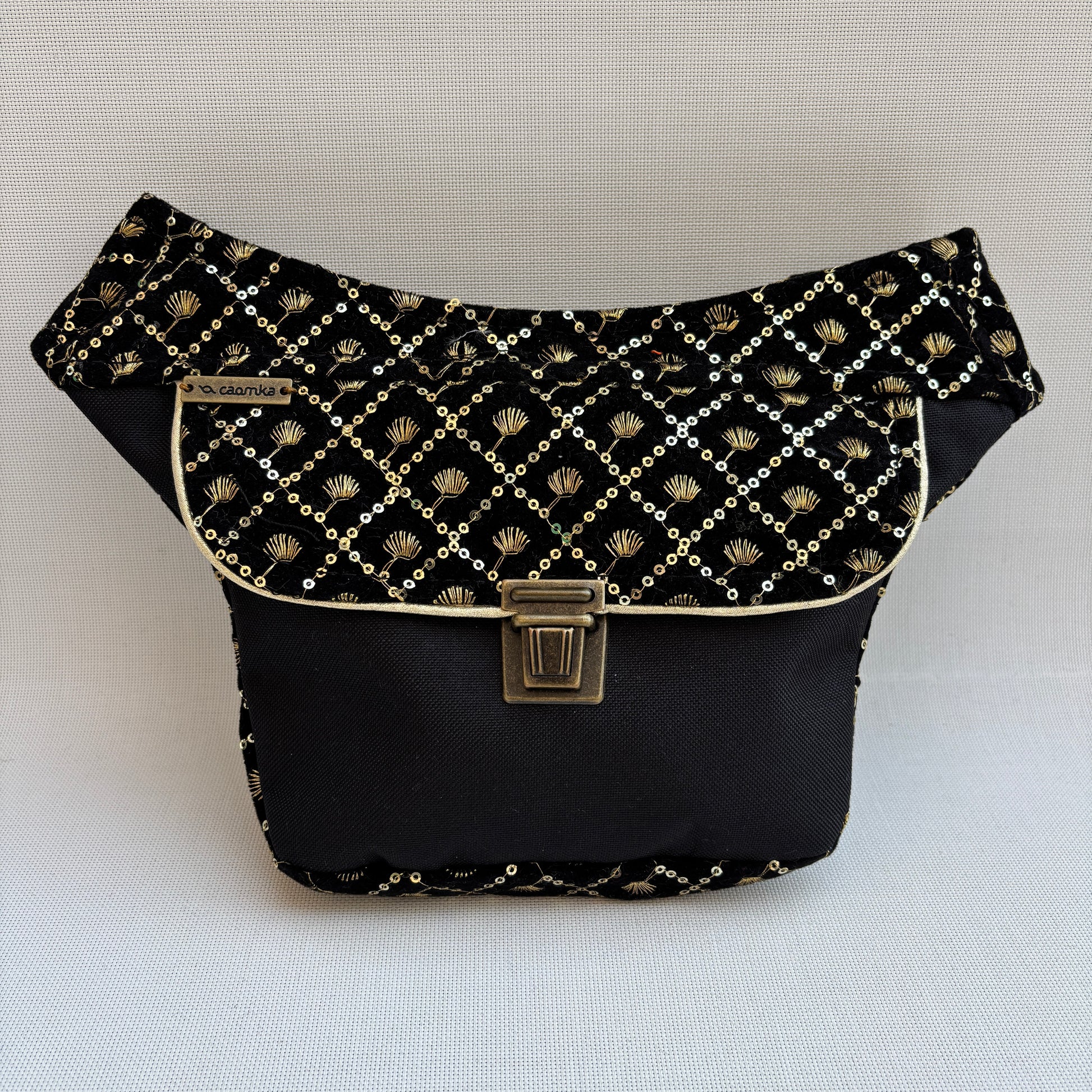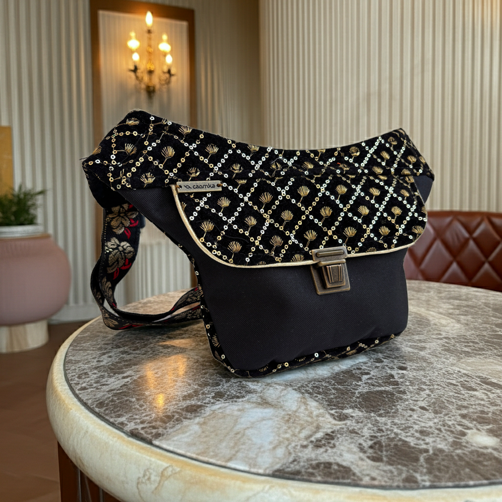 La Mini Elegant Luxury India Golden Top 18350 nace de un hallazgo muy especial: un terciopelo negro trabajado con hilo dorado y micro detalles que recuerdan a esas piezas que solo ves en los mejores talleres y creaciones de la India.