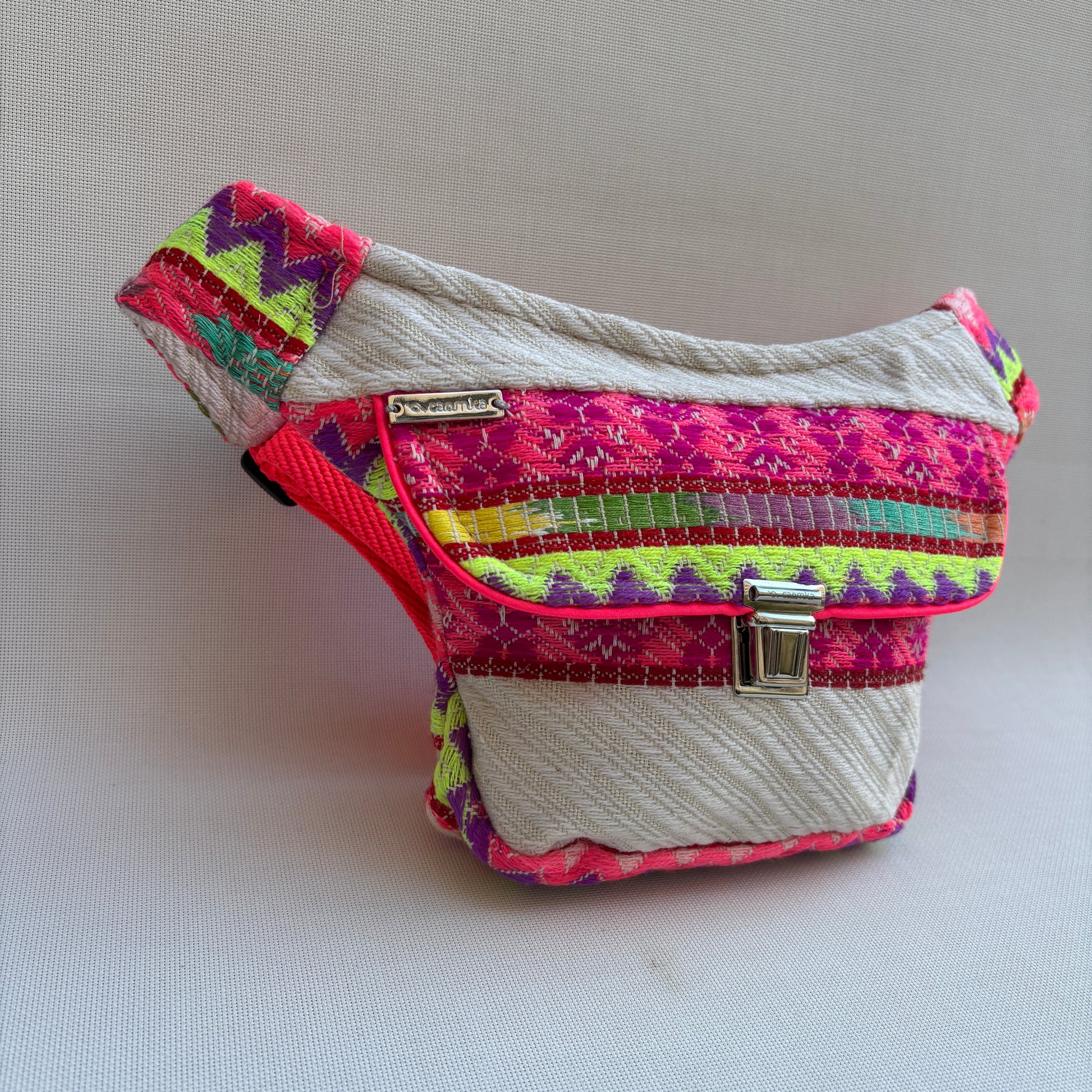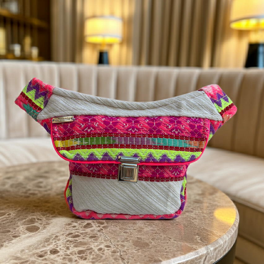 Color: Fucsia, lima, violeta, crema y detalles multicolor en tejido étnico artesanal
