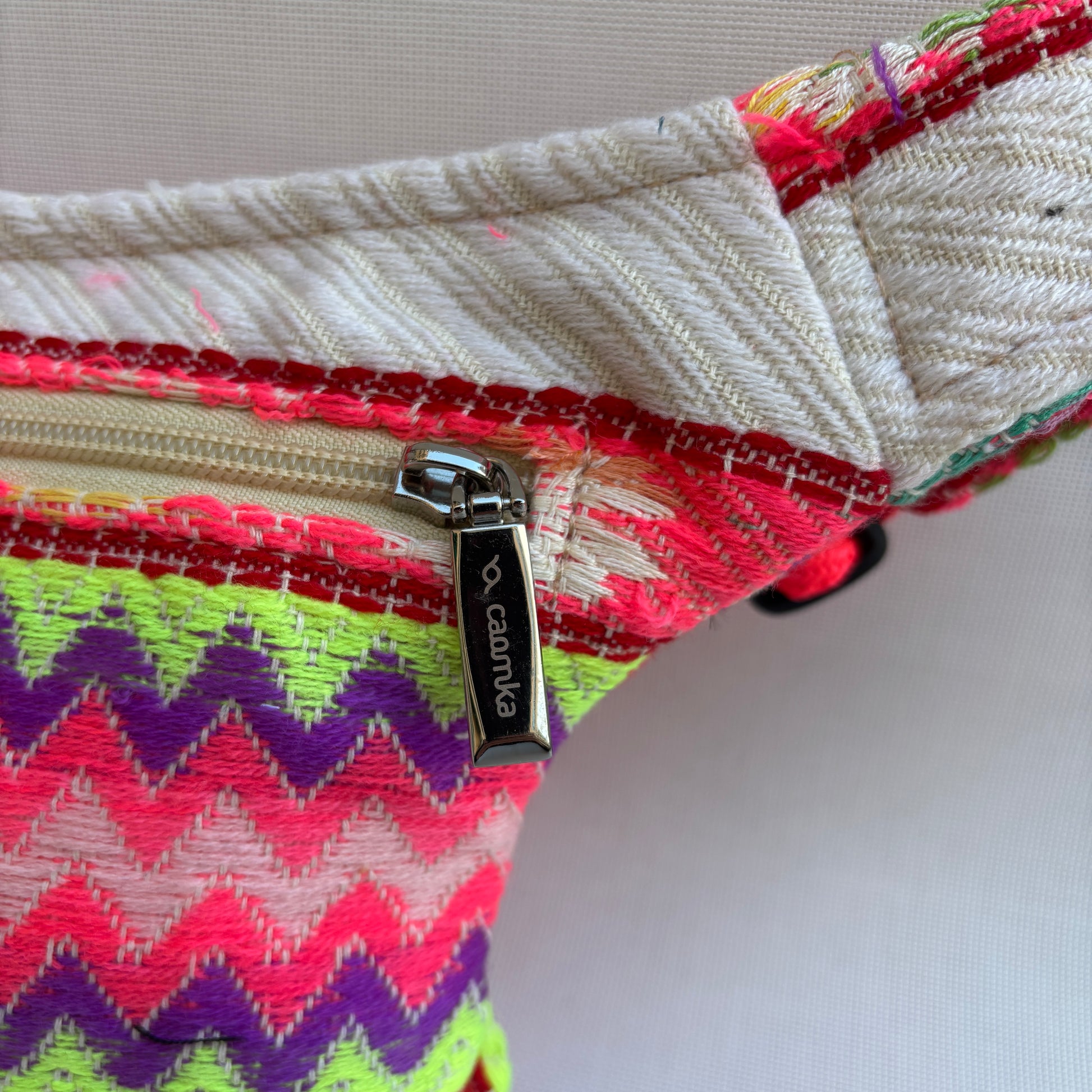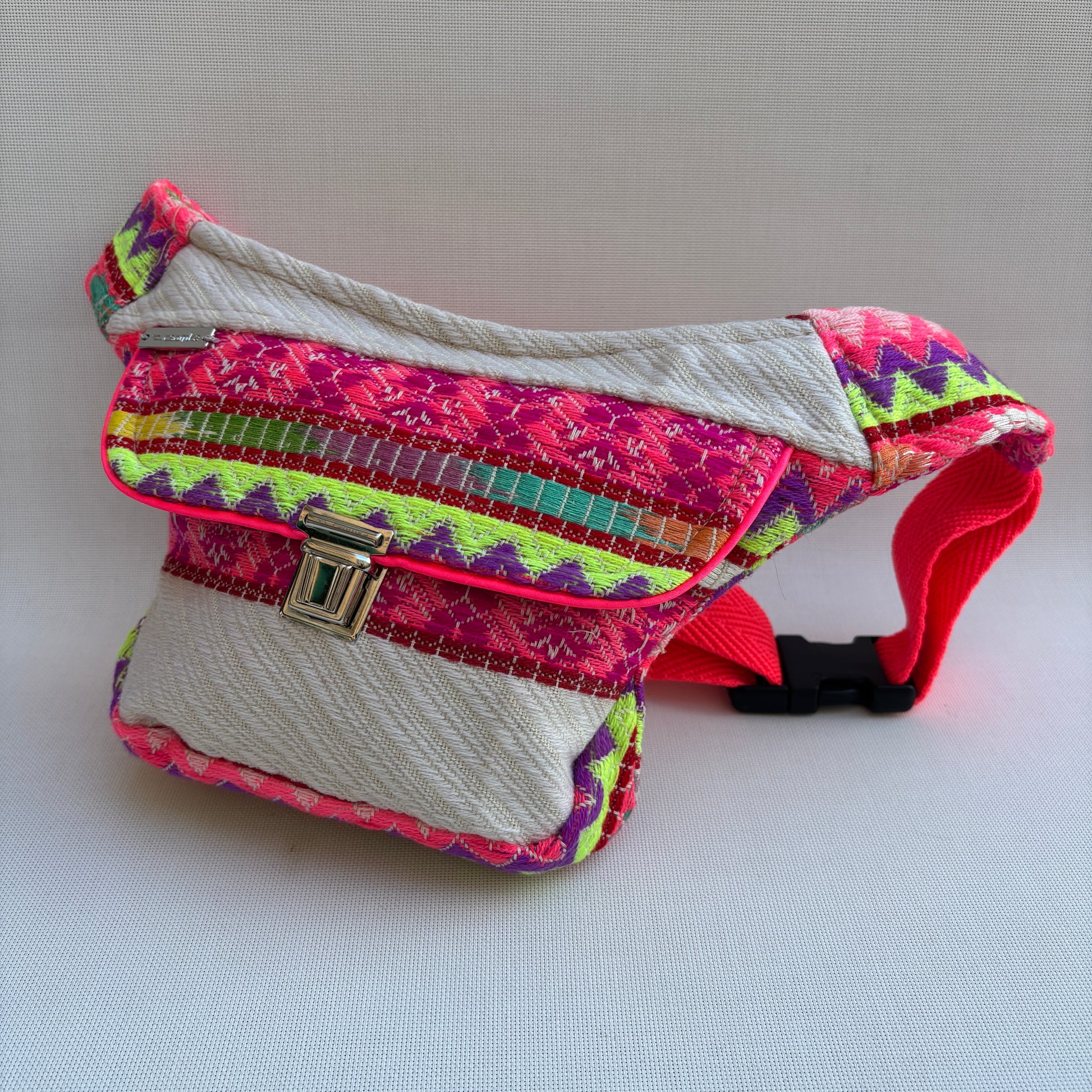 Su diseño combina un tejido étnico artesanal con patrones zigzag y franjas geométricas en tonos fucsia, lima, violeta y crema, creando una pieza vibrante, alegre y con una presencia muy potente.