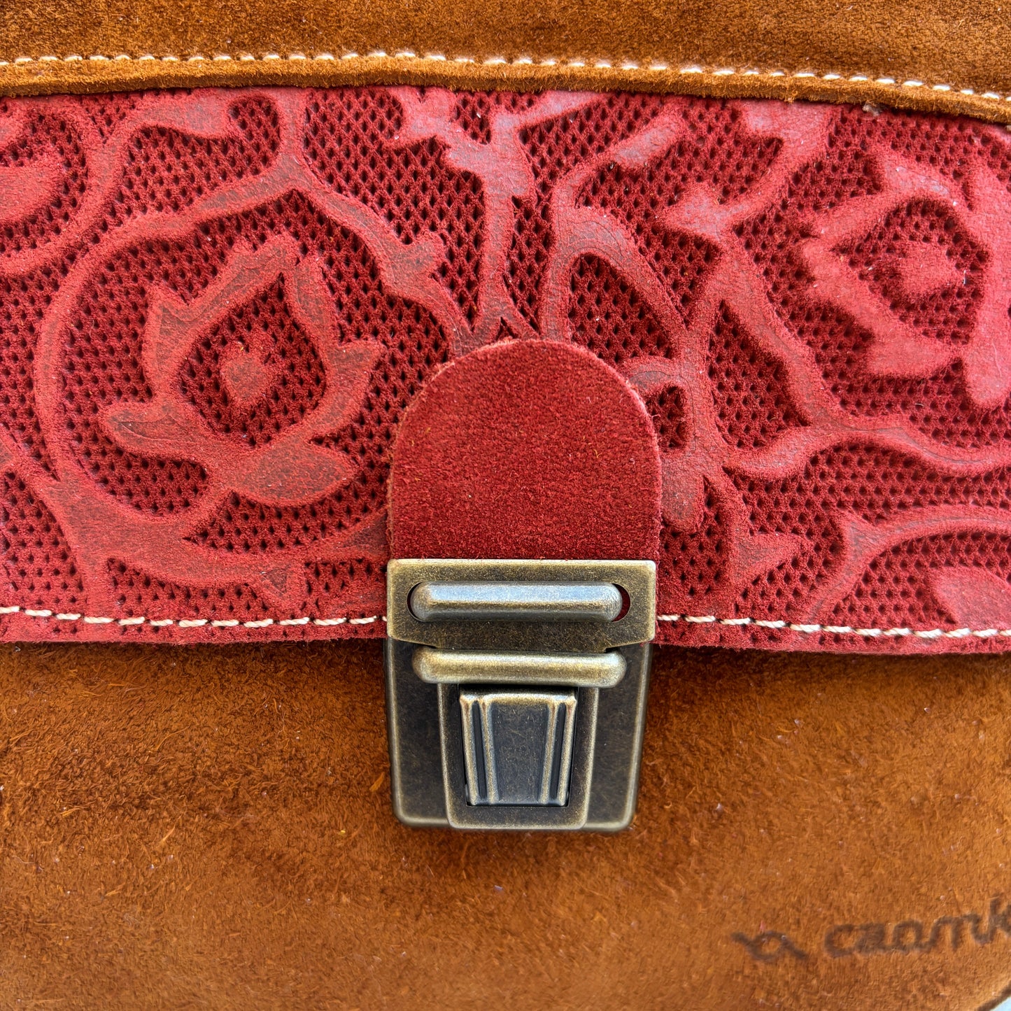 Bolsillo delantero con cierre "Click-Clack Vintage" en color oro viejo.