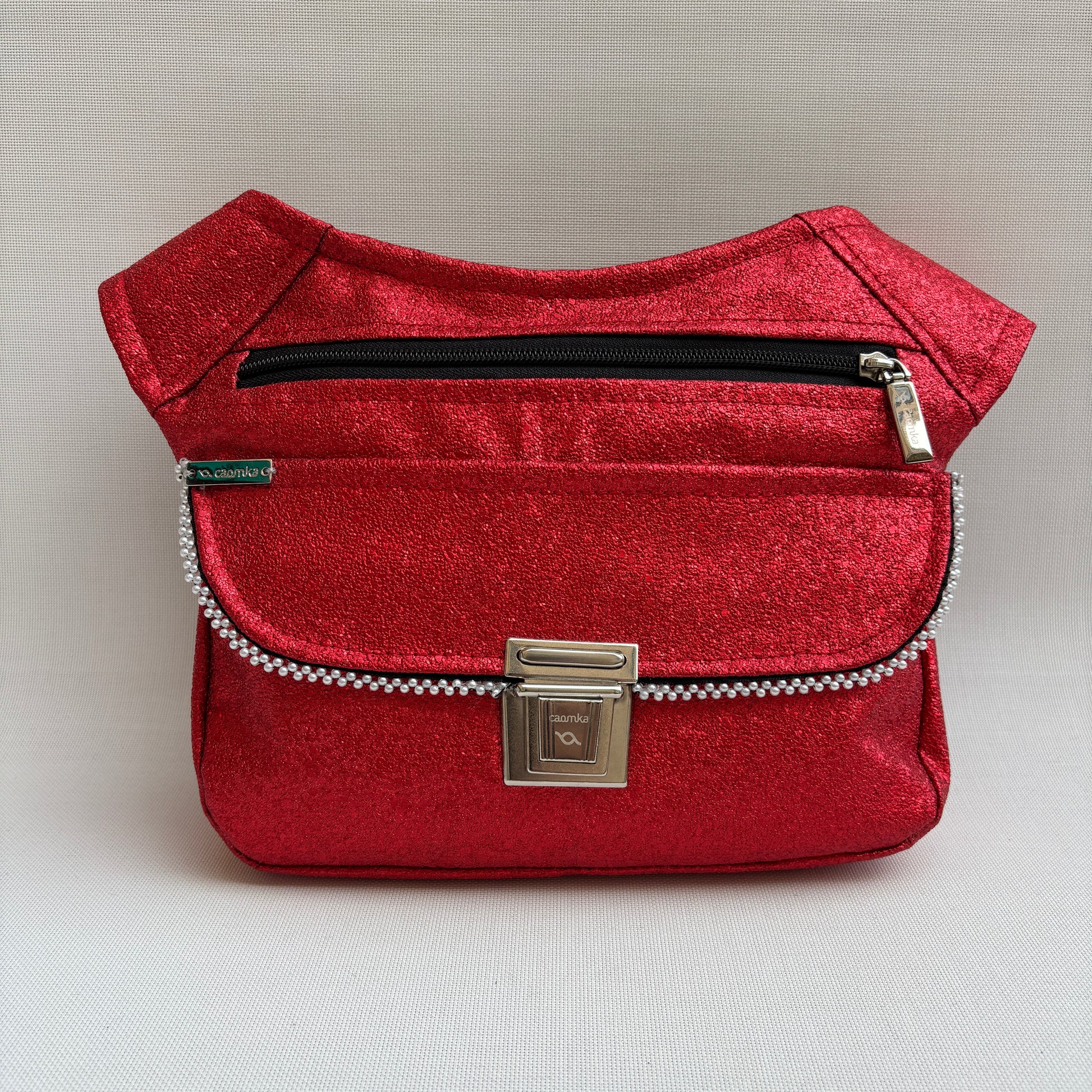Color: Rojo brillante efecto glitter con detalles en negro y herrajes en plata