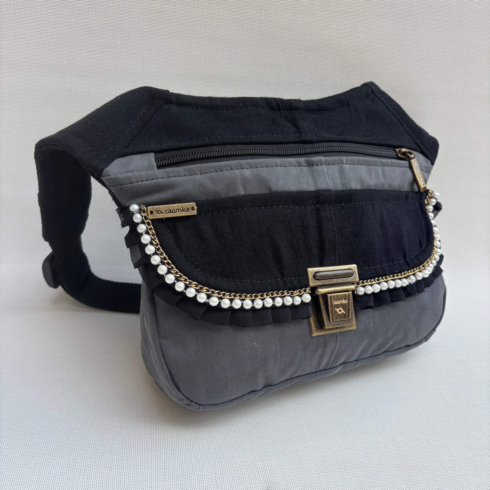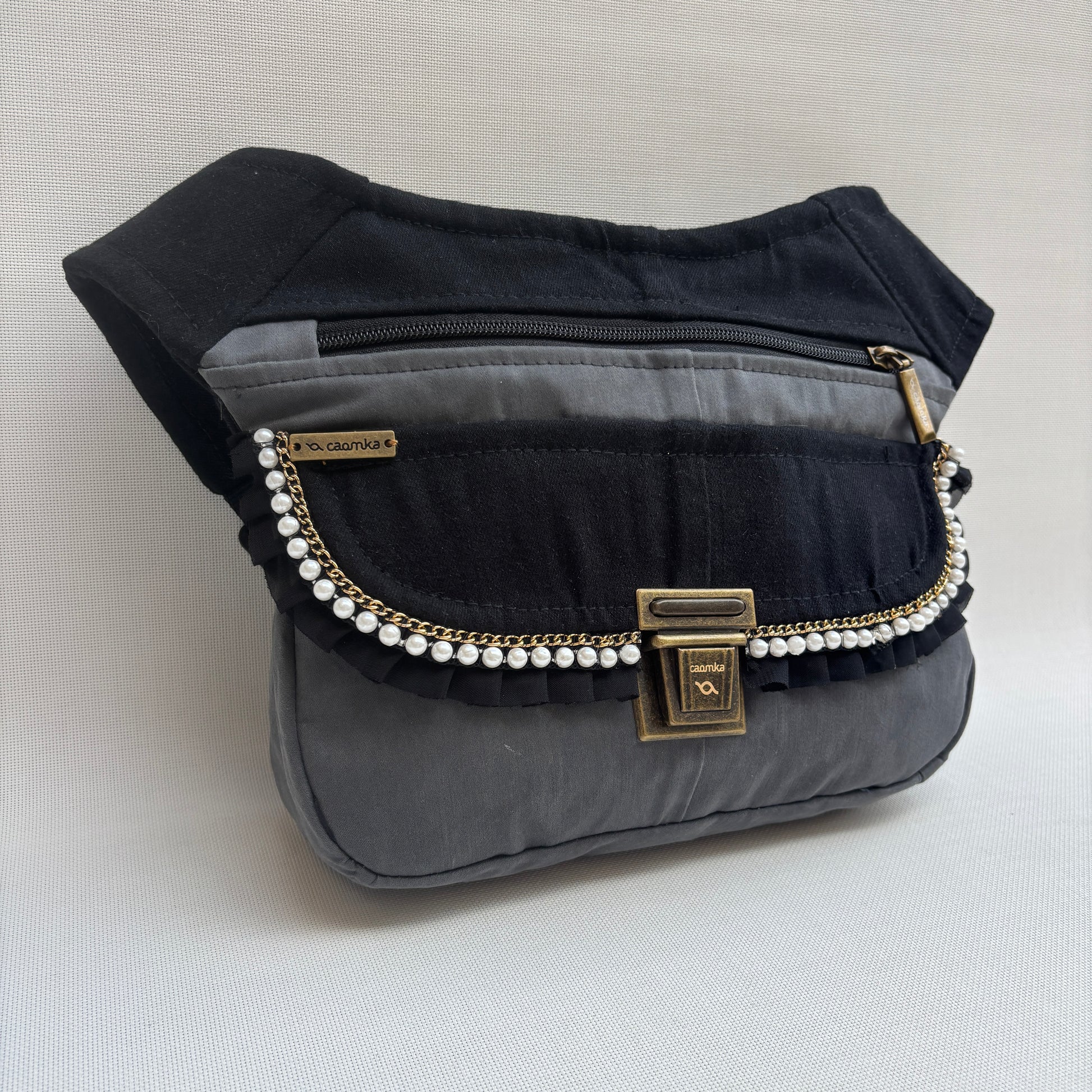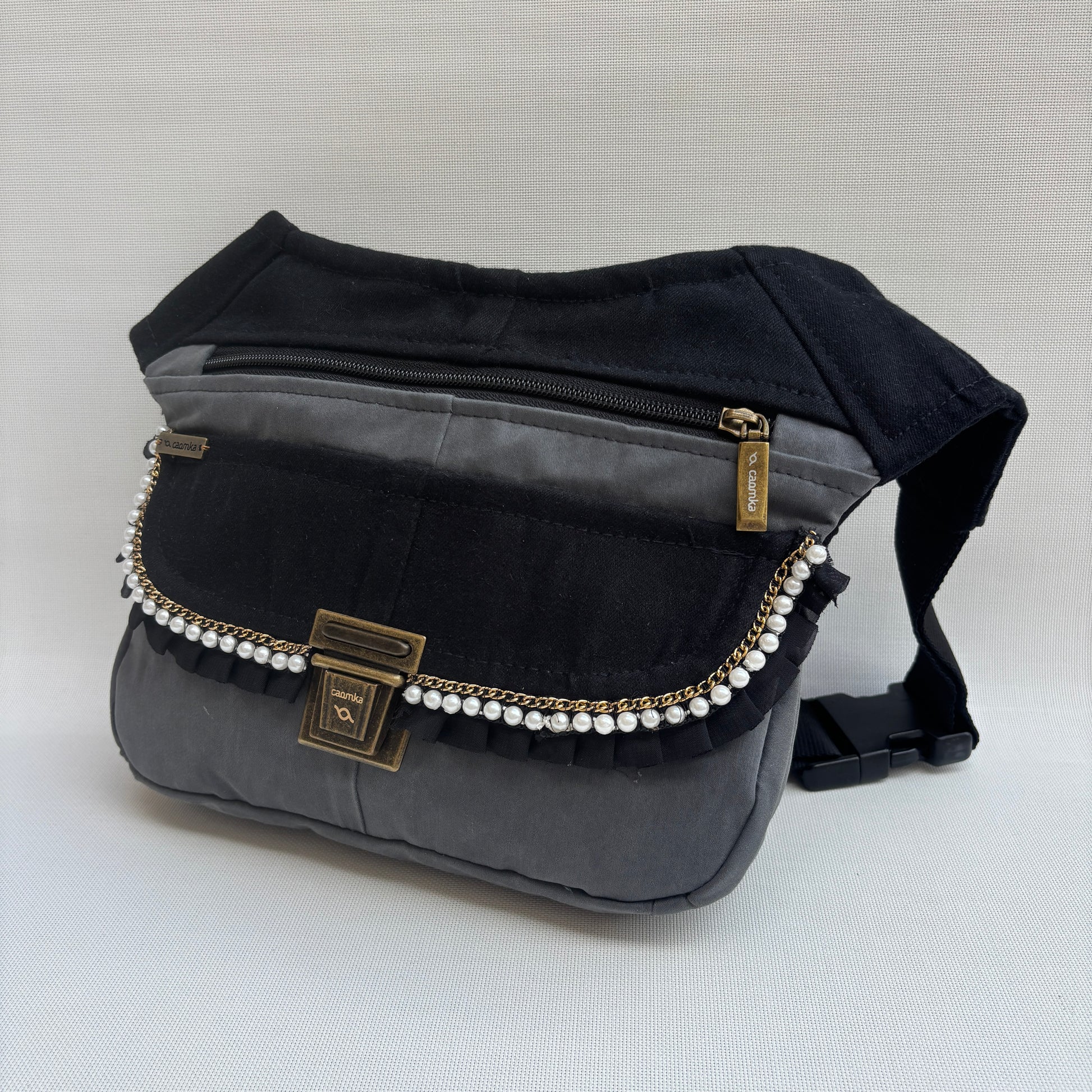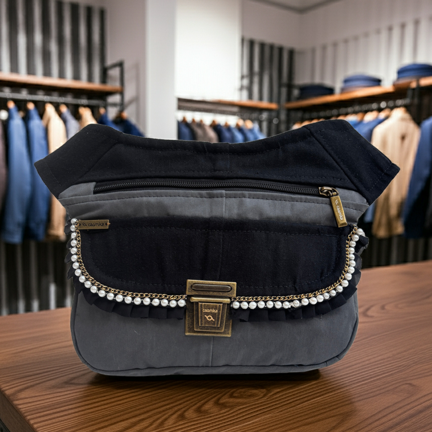 La Caomka “Black & Grey Fusion” es una pieza exclusiva creada a partir de la fusión de vaqueros negros y pantalones Docker’s grises reutilizados, dando lugar a un diseño sobrio con un toque sofisticado. Su detalle de perlas y cadena dorada aporta contraste y personalidad, combinando el estilo urbano con una elegancia contemporánea.