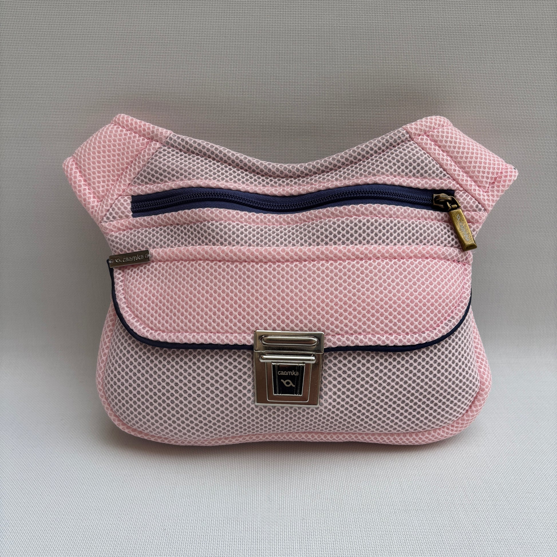 Confeccionada en tejido técnico Soft 3D, destaca por su comodidad, su tacto suave y su aire fresco y delicado. El rosa pastel del cuerpo aporta una sensación limpia y alegre, mientras que los detalles en azul marino —cremallera, vivos y cierre— equilibran el diseño y le dan un toque elegante.