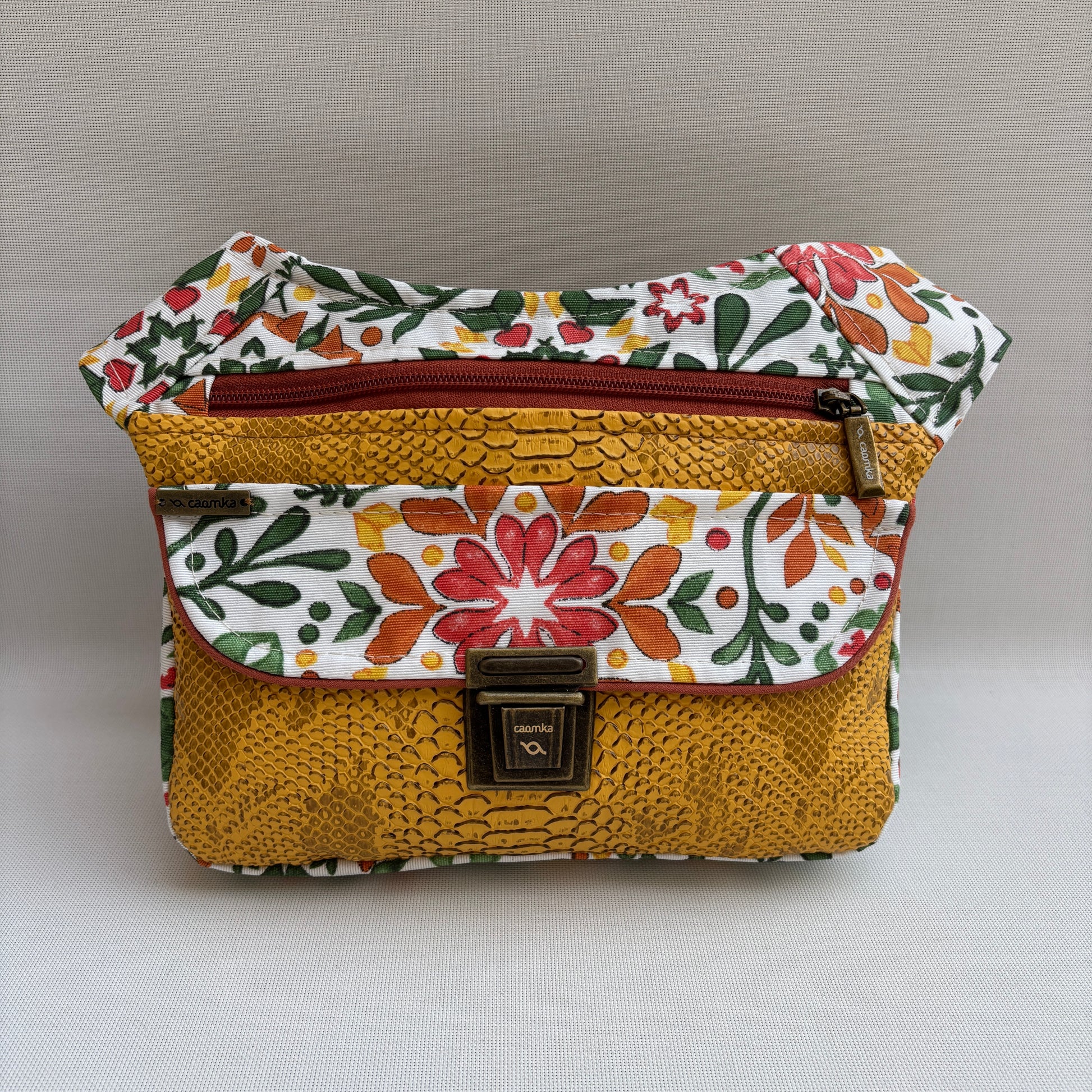 La solapa en textura reptil aporta carácter; el cuerpo estampado invita a sonreír; y los detalles metálicos en envejecido mantienen ese sello Caomka: artesanal, único y lleno de personalidad.