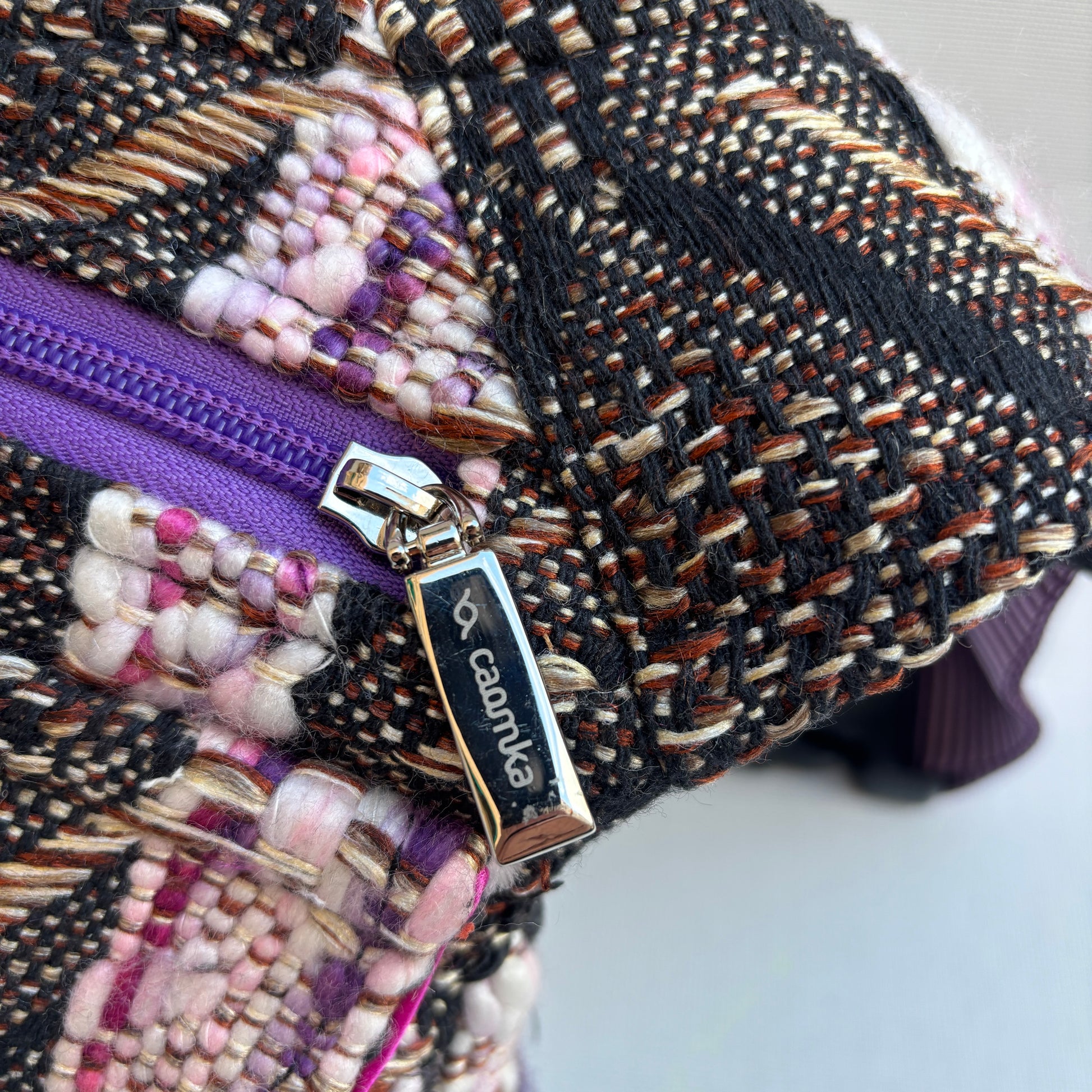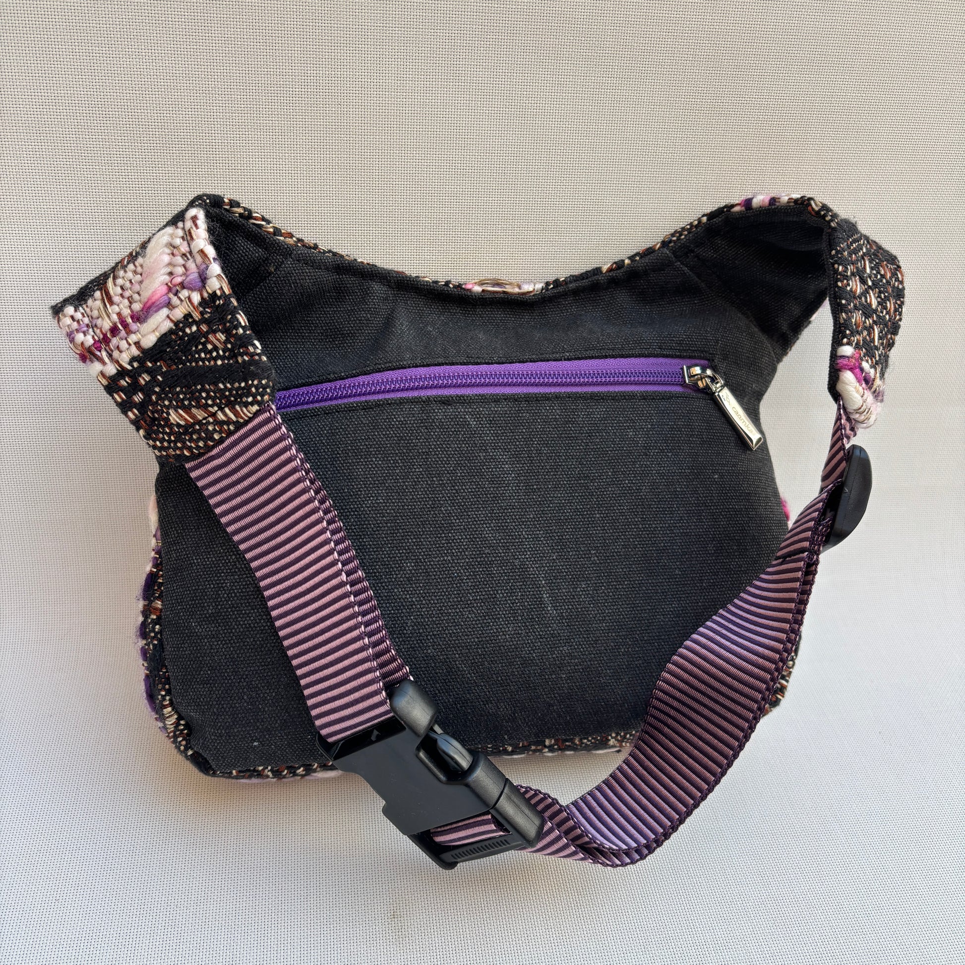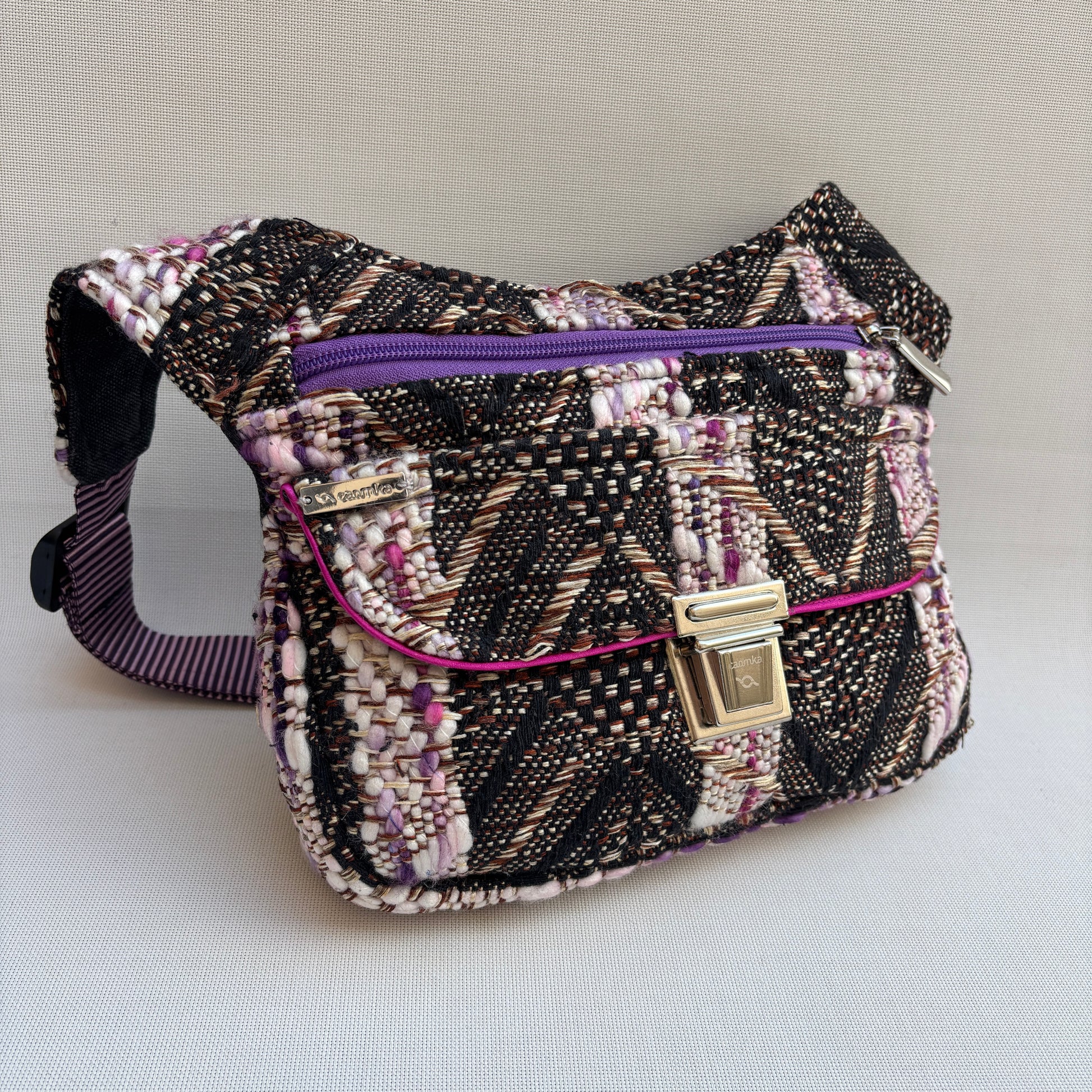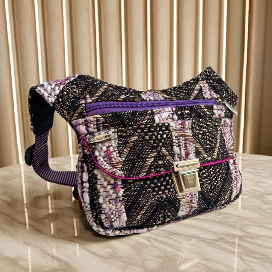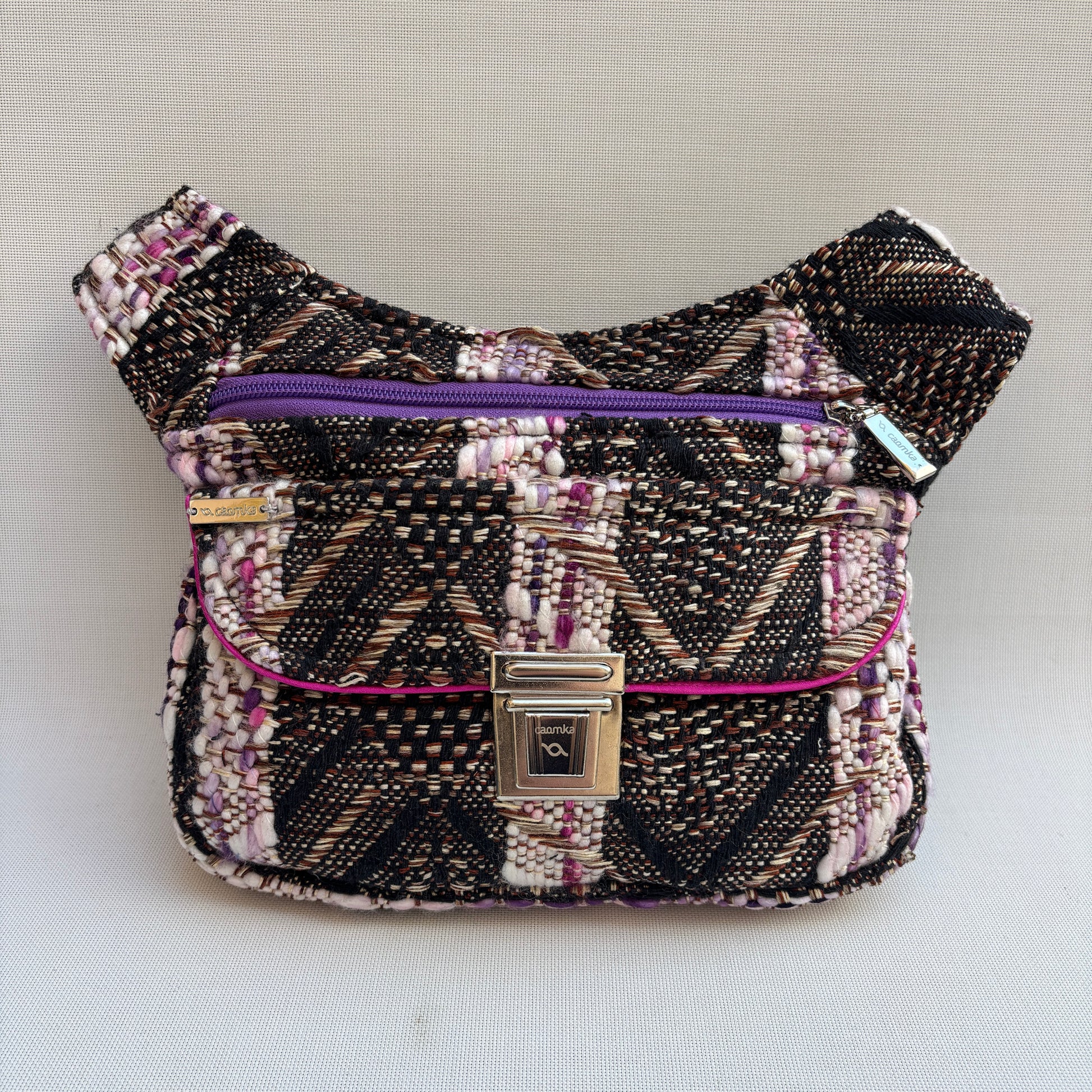La Special Amazing India 18421 es una riñonera con mucha personalidad, confeccionada con un tejido artesanal de gran riqueza visual y textura marcada, donde se entrelazan tonos negros, crudos y malva creando un efecto tapiz profundo y envolvente.