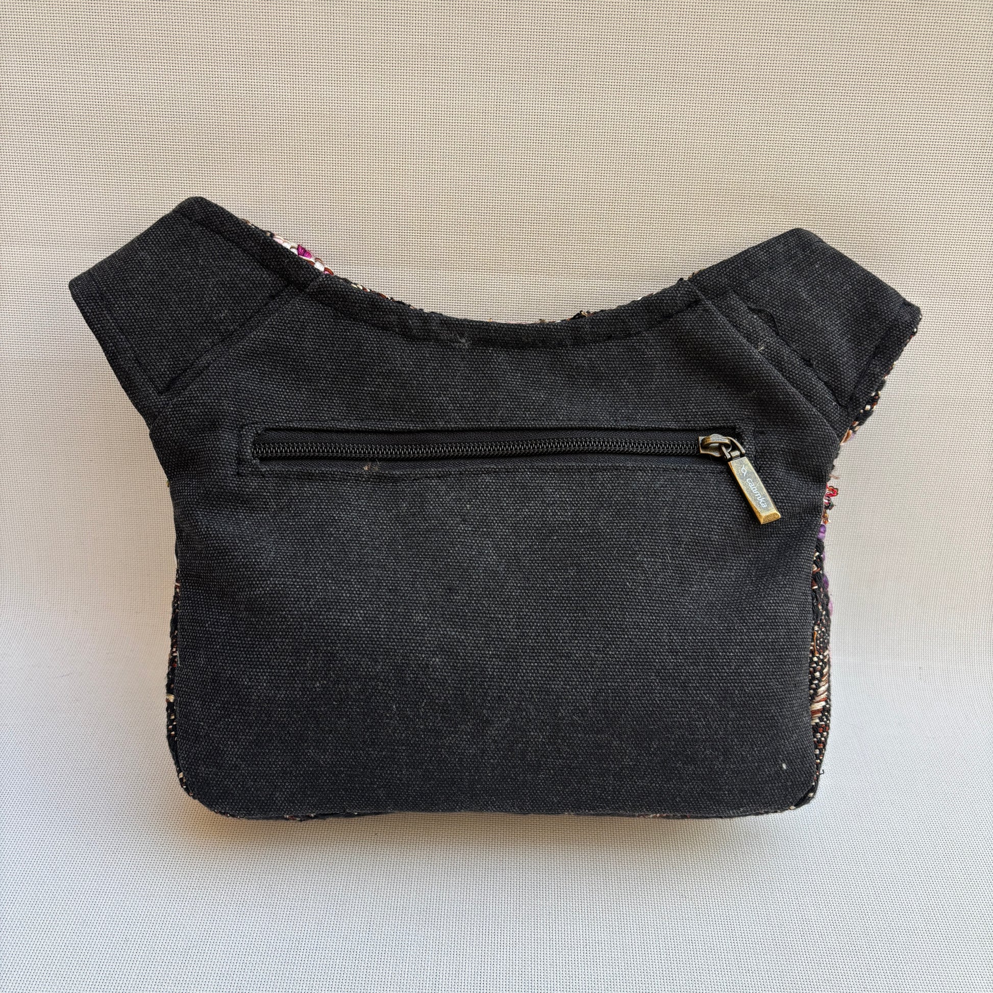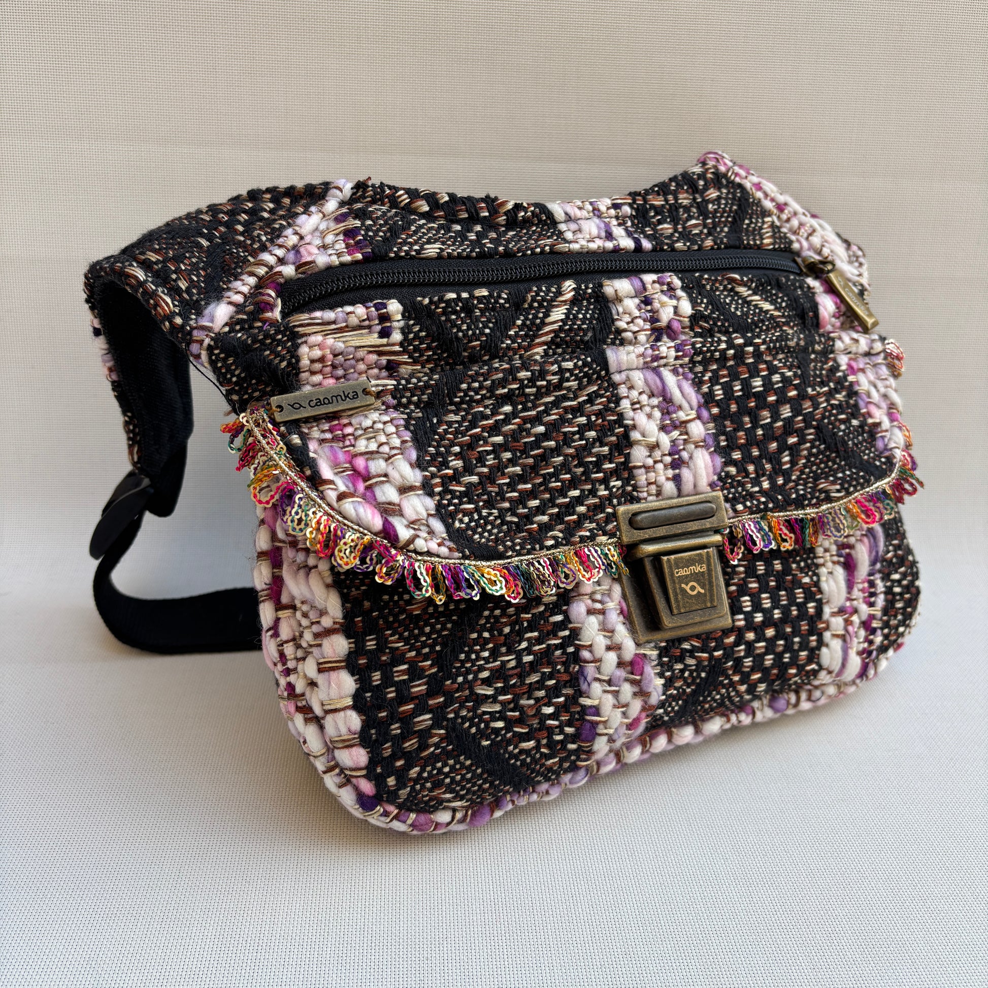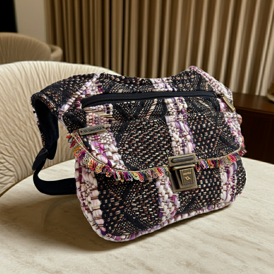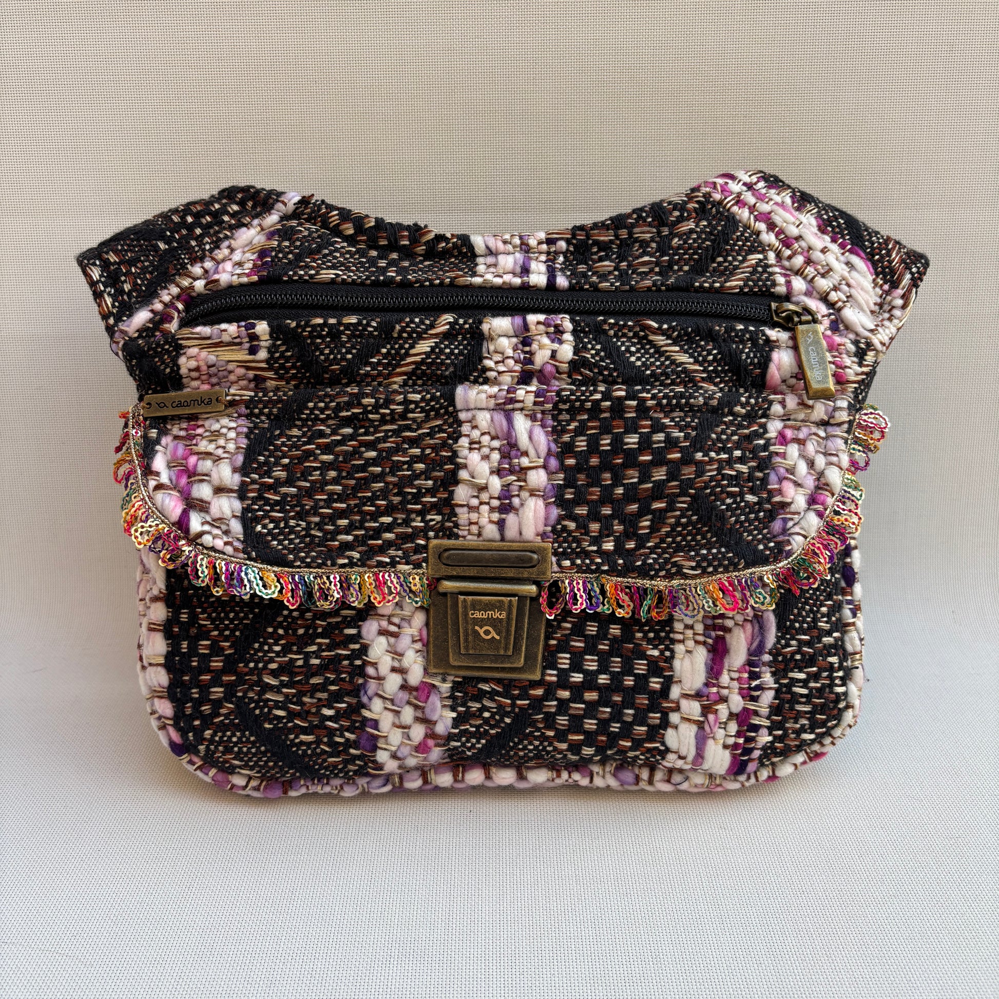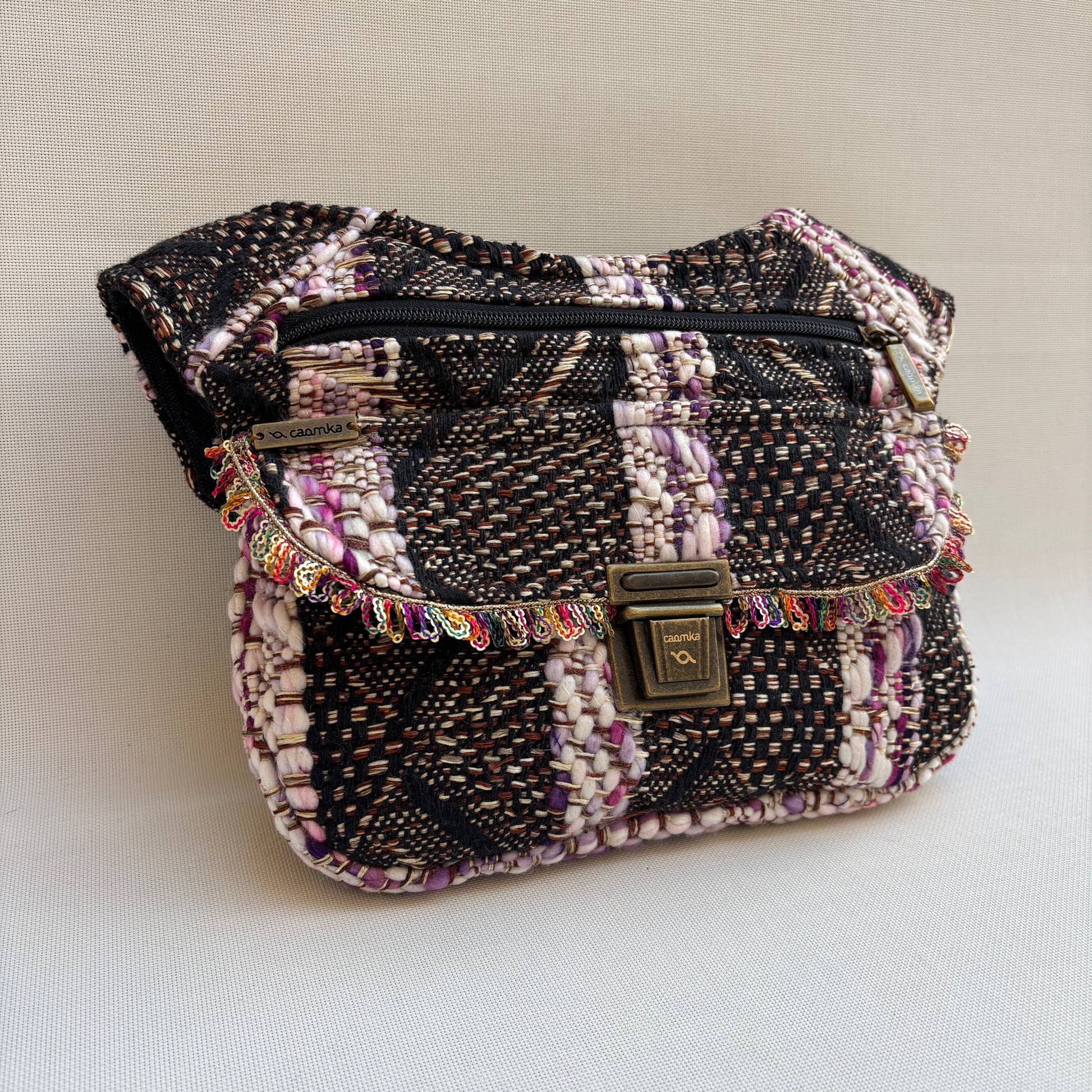 Color: Negro profundo con entramado artesanal en tonos crudo, malva y matices tierra