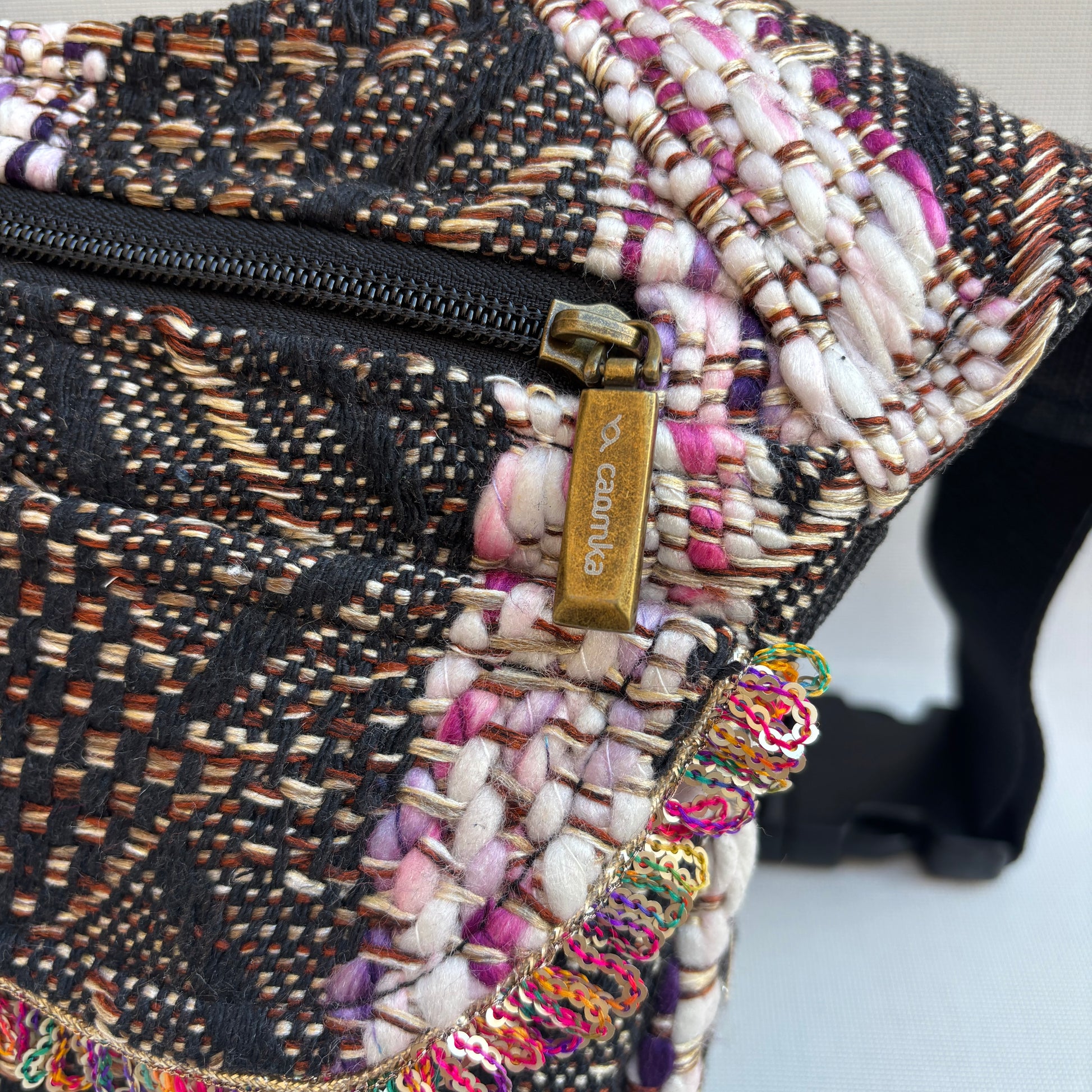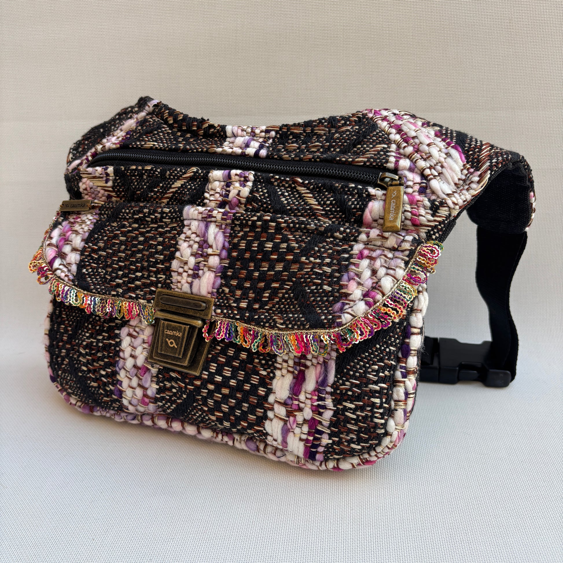 La Special Amazing India 18423 es una riñonera con una presencia potente y sofisticada, confeccionada con un tejido artesanal de gran riqueza visual que combina estructuras geométricas y volúmenes textiles en una paleta sobria y profunda.