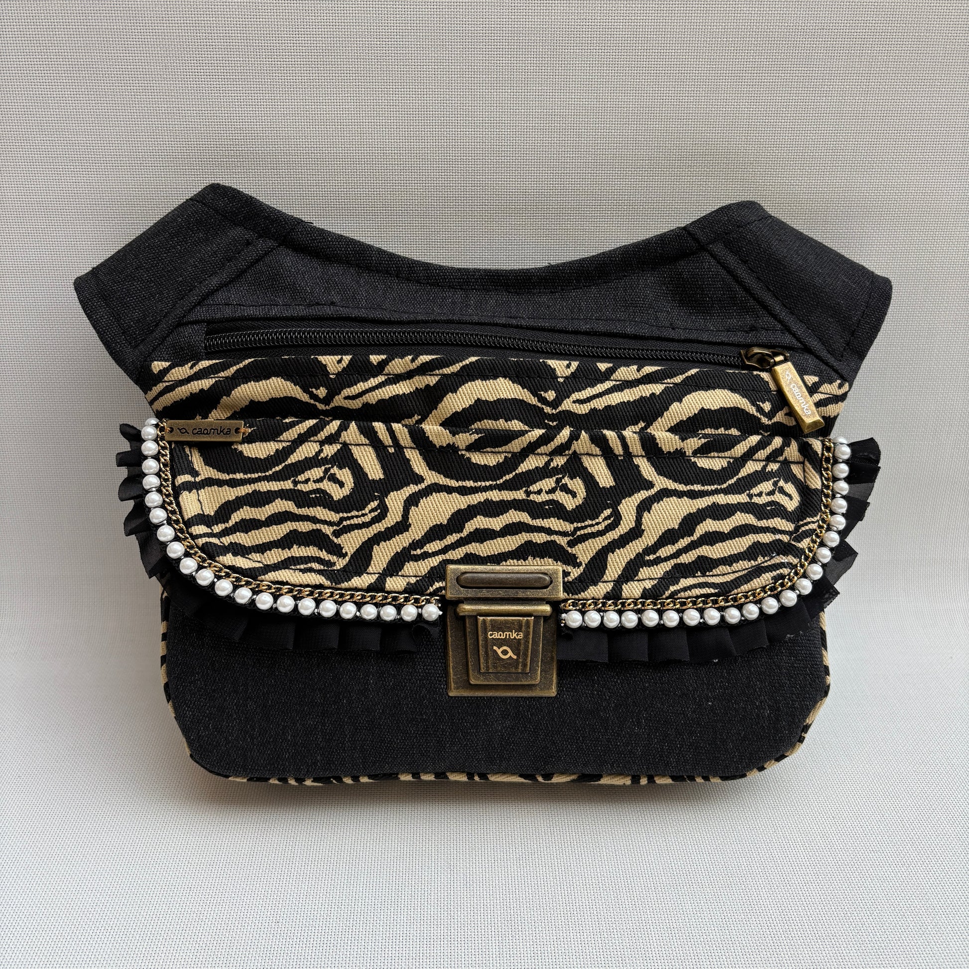 Color: Base en tejido negro grafito con solapa en animal print (cebra) beige y negro, rematada con perlas blancas, cadena dorada y volante negro