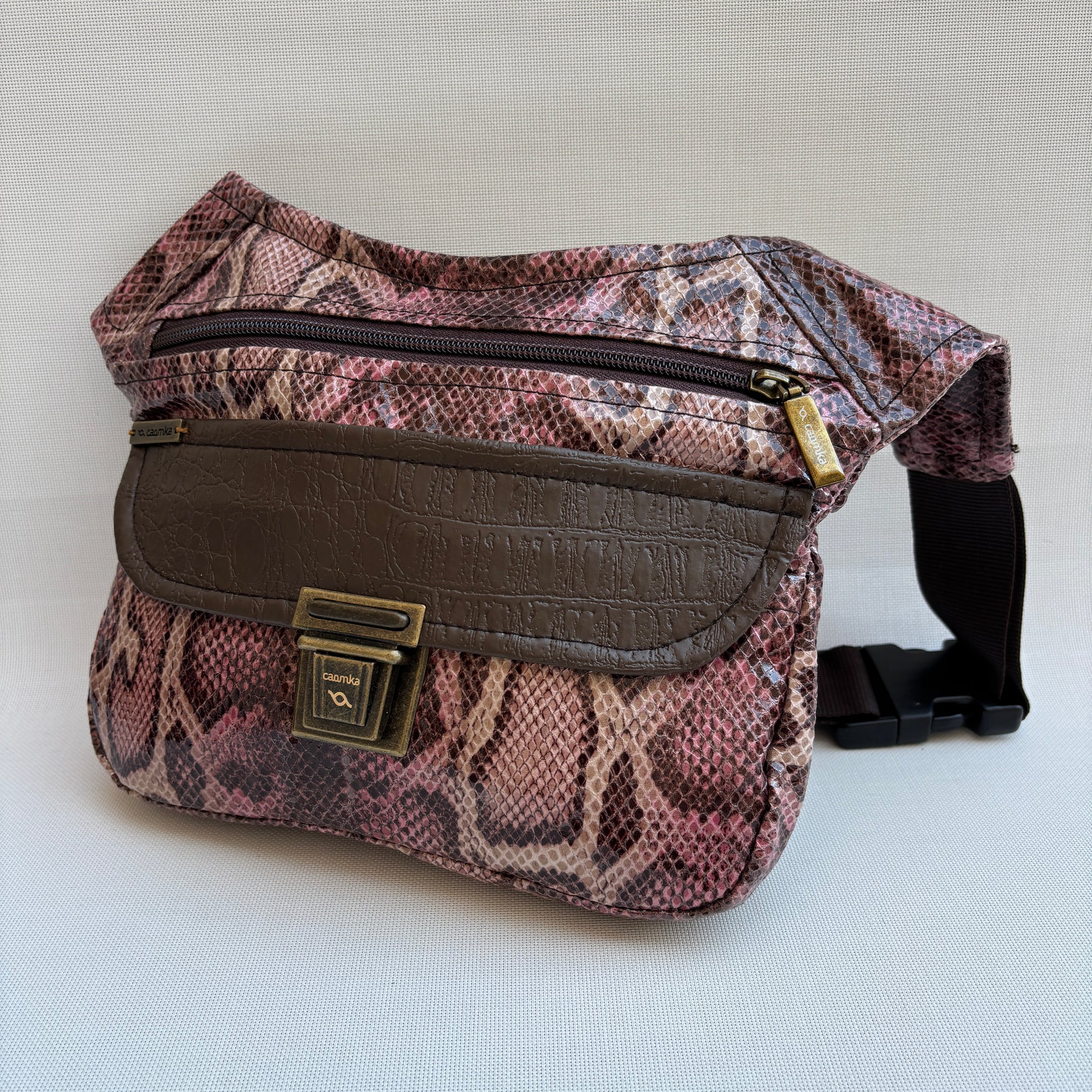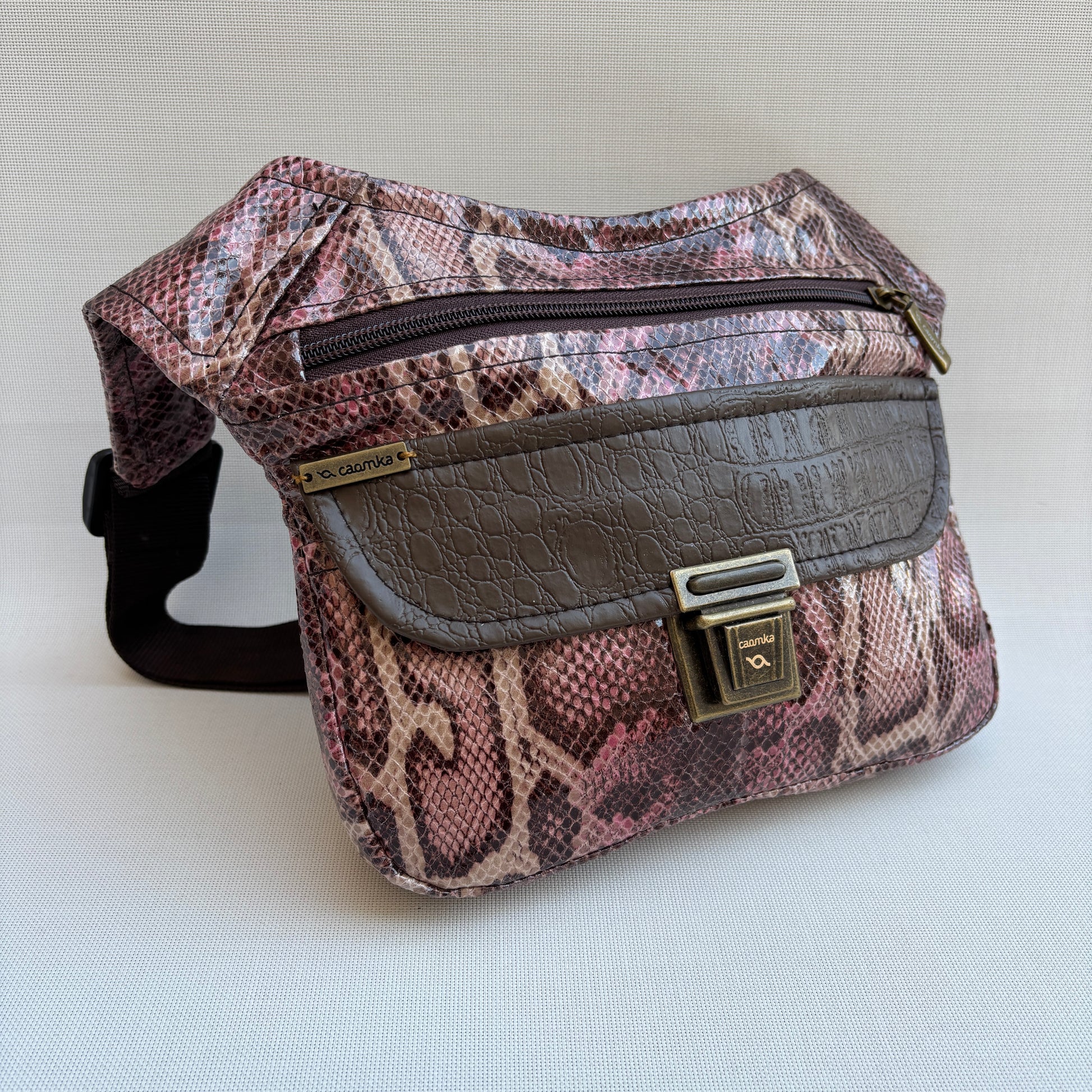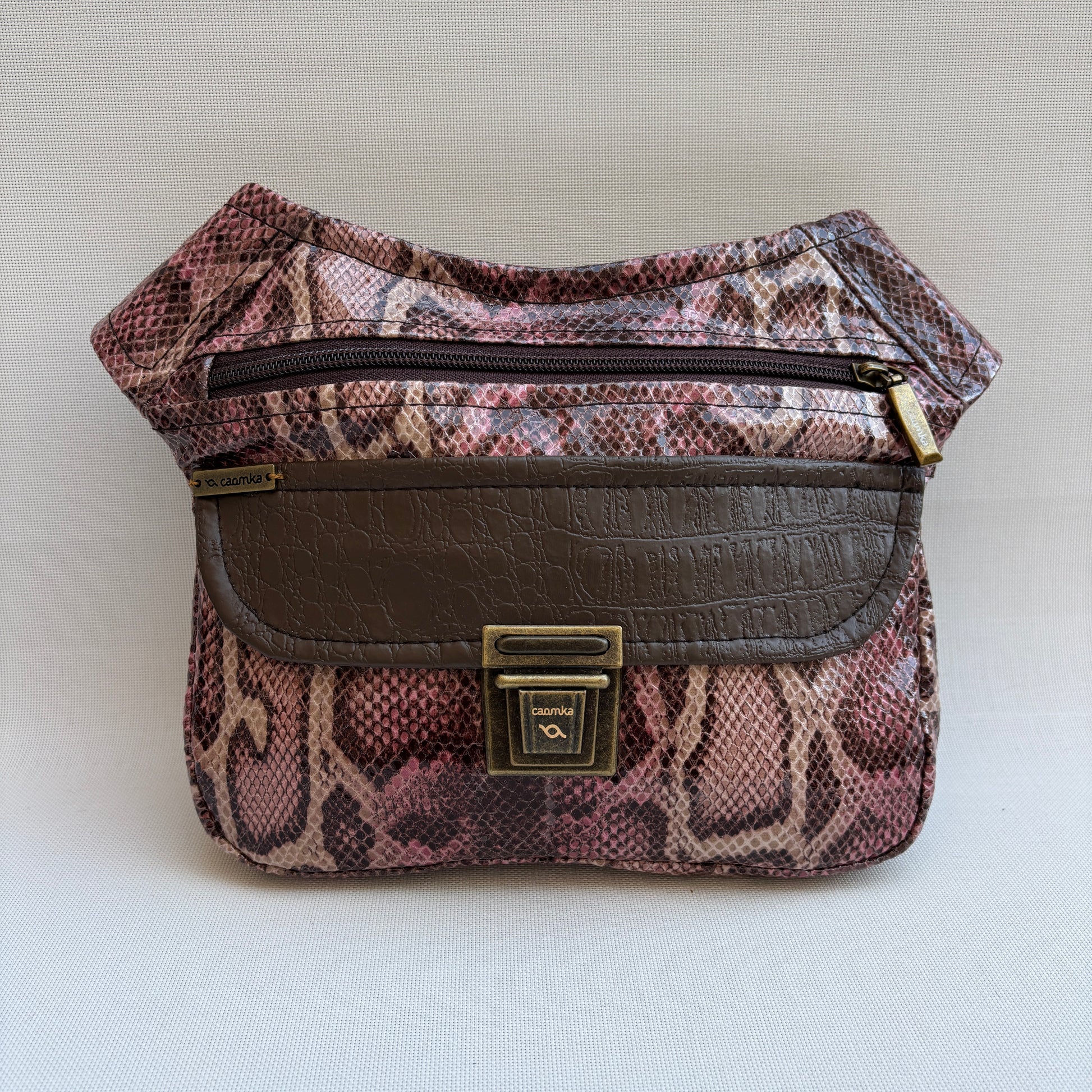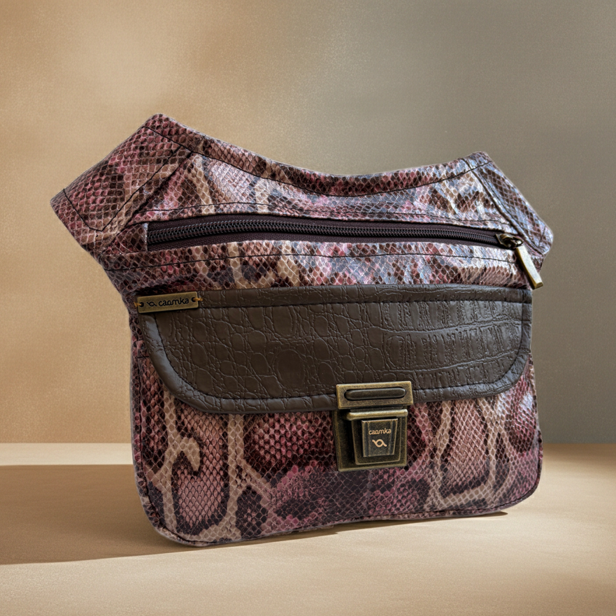 Cuerpo en polipiel con textura efecto serpiente en tonos tierra, rosa y marrón.