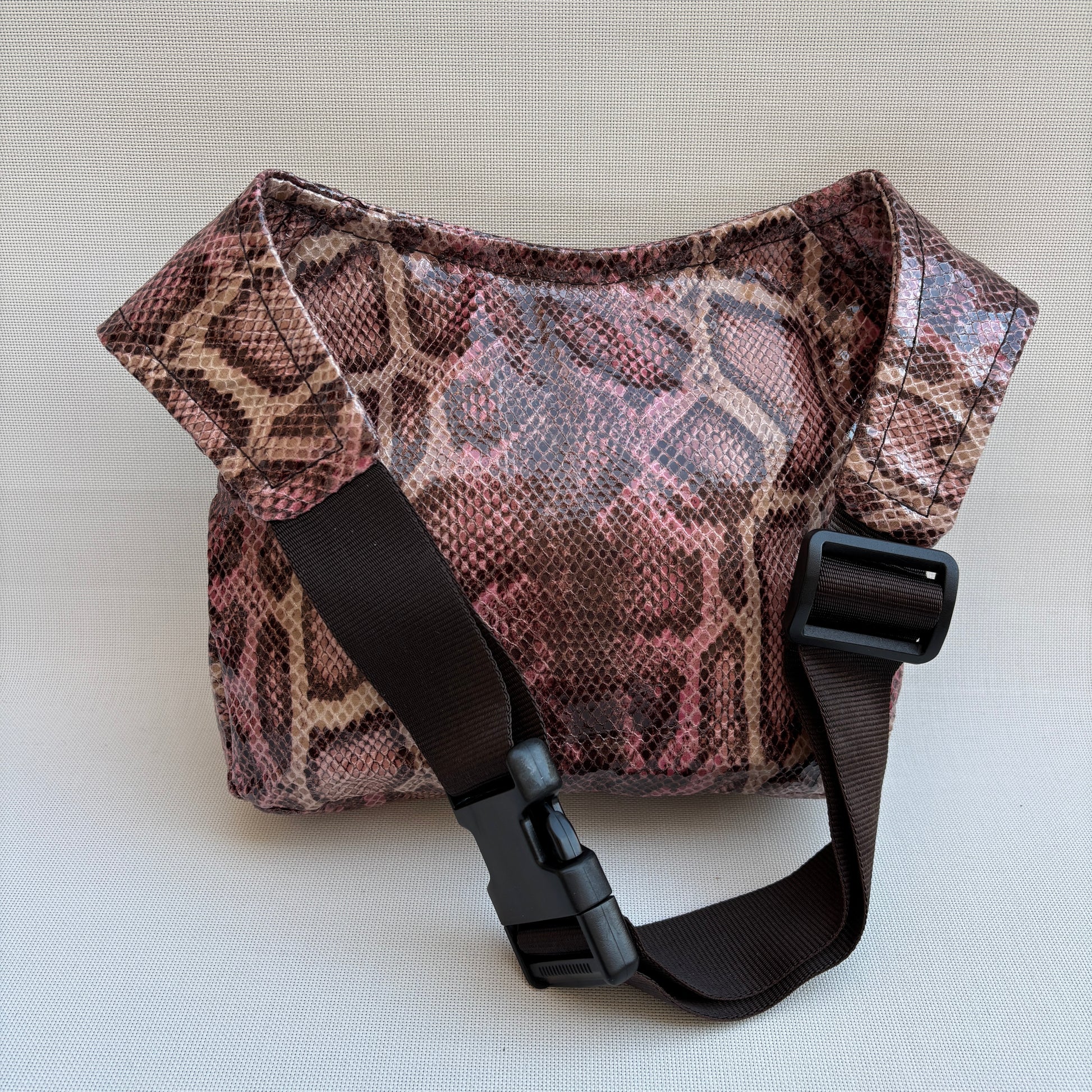 El tejido principal imita la piel de serpiente en tonos marrón, beige y rosa empolvado, creando un efecto visual profundo y elegante que recuerda a los estampados animal print más icónicos.