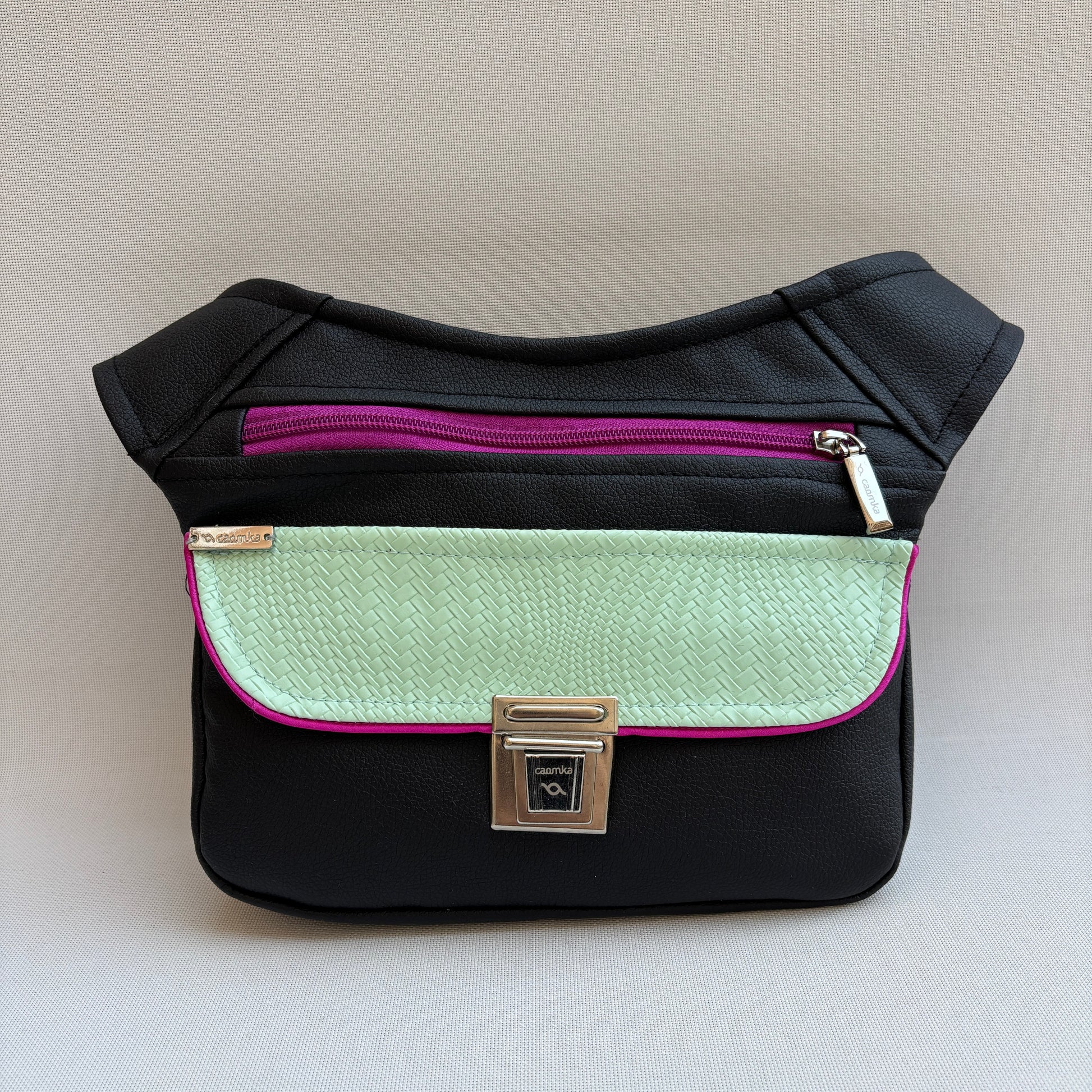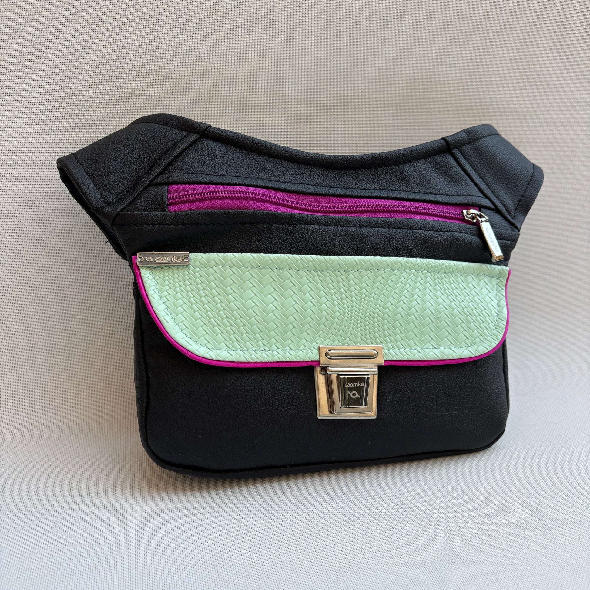 Color: Negro con solapa en polipiel trenzada verde menta y detalles en fucsia
