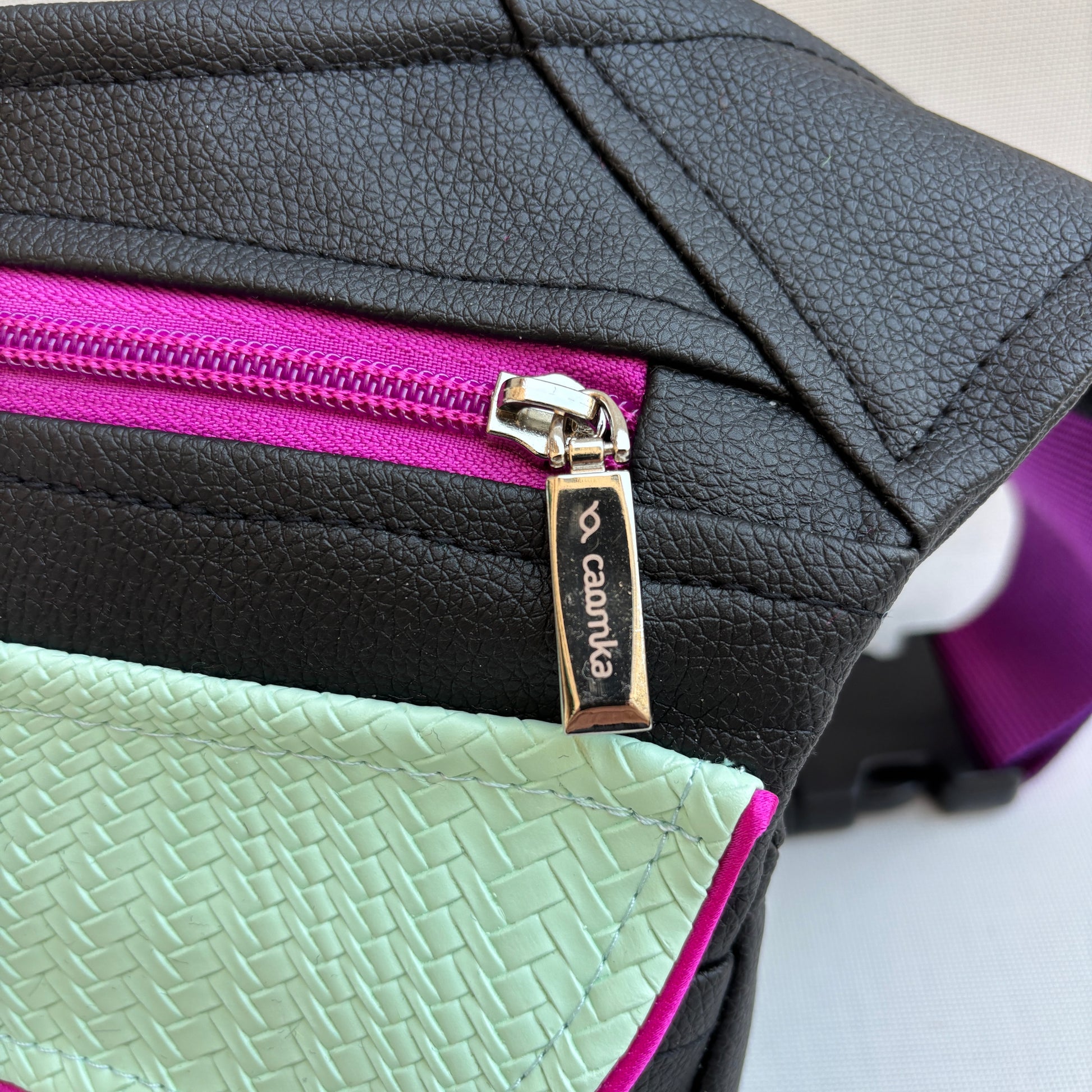 Bolsillo superior con cremallera en color fucsia y tirador metálico Caomka.