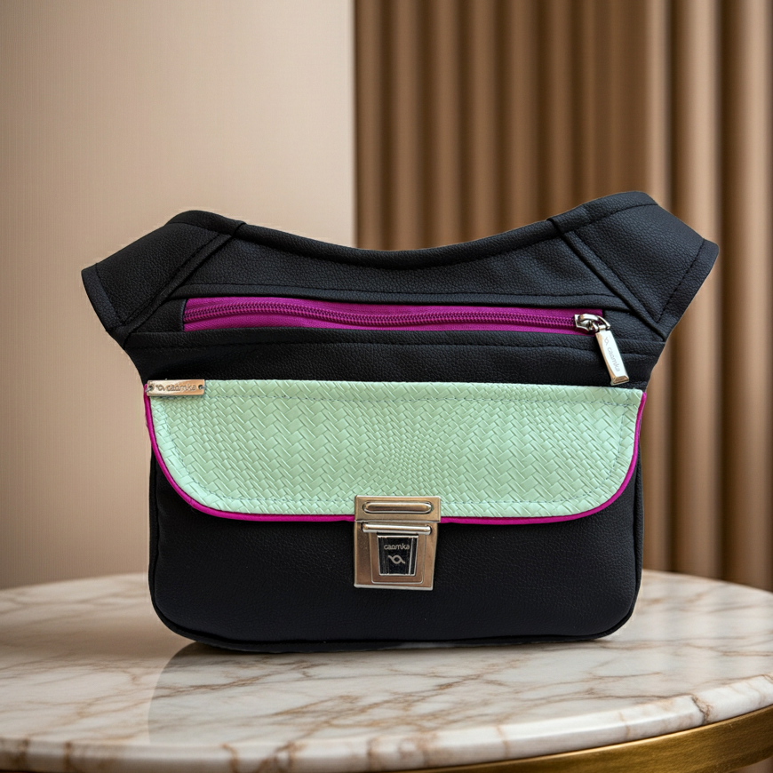 La base en polipiel negra aporta sobriedad y estructura, mientras que la solapa en polipiel trenzada verde menta introduce frescura, textura y un punto inesperado que ilumina el conjunto.