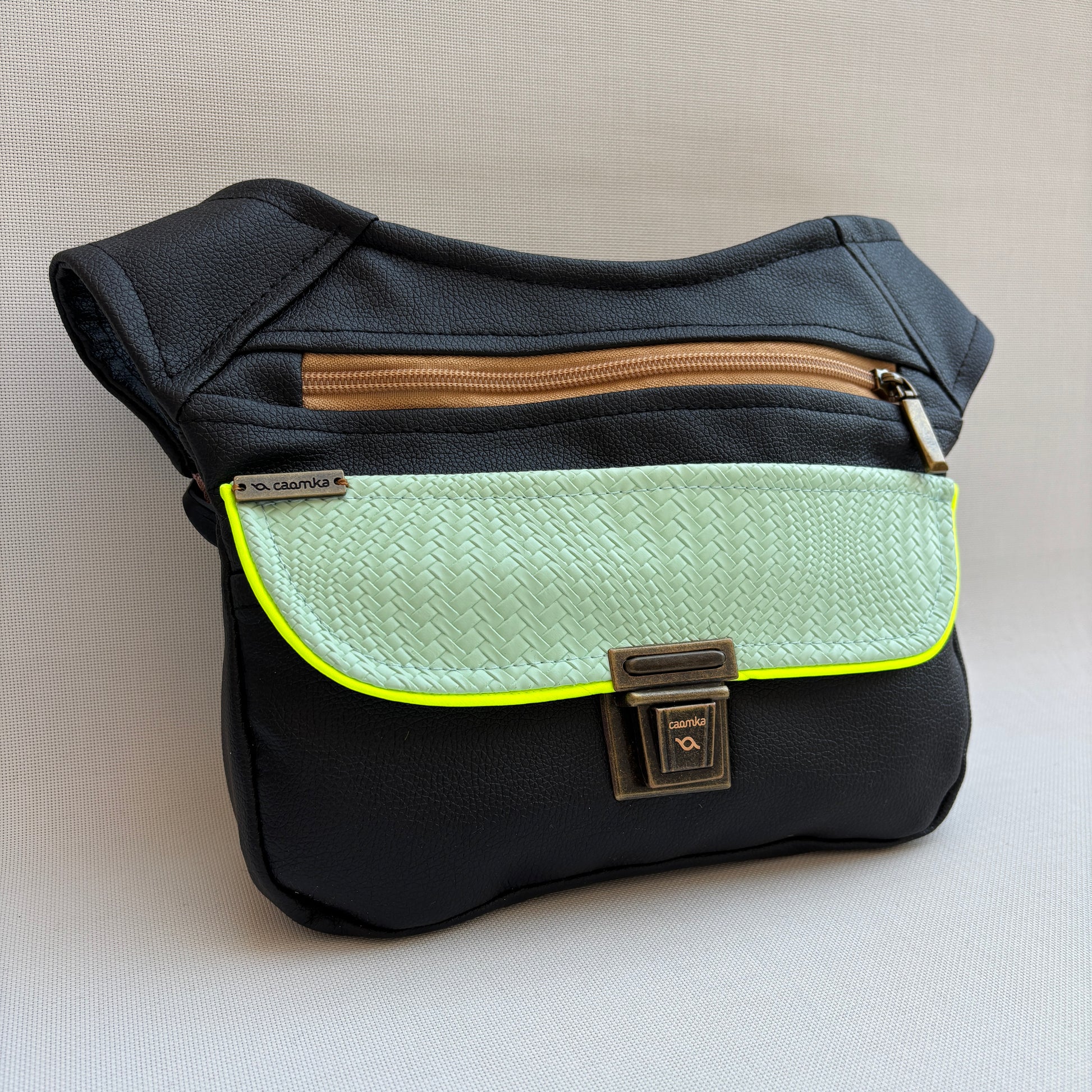La Special Black & Green 18369 es una riñonera de contraste potente y muy visual, donde la base negra en polipiel se combina con una solapa verde menta de textura trenzada que ilumina la pieza y le aporta personalidad.