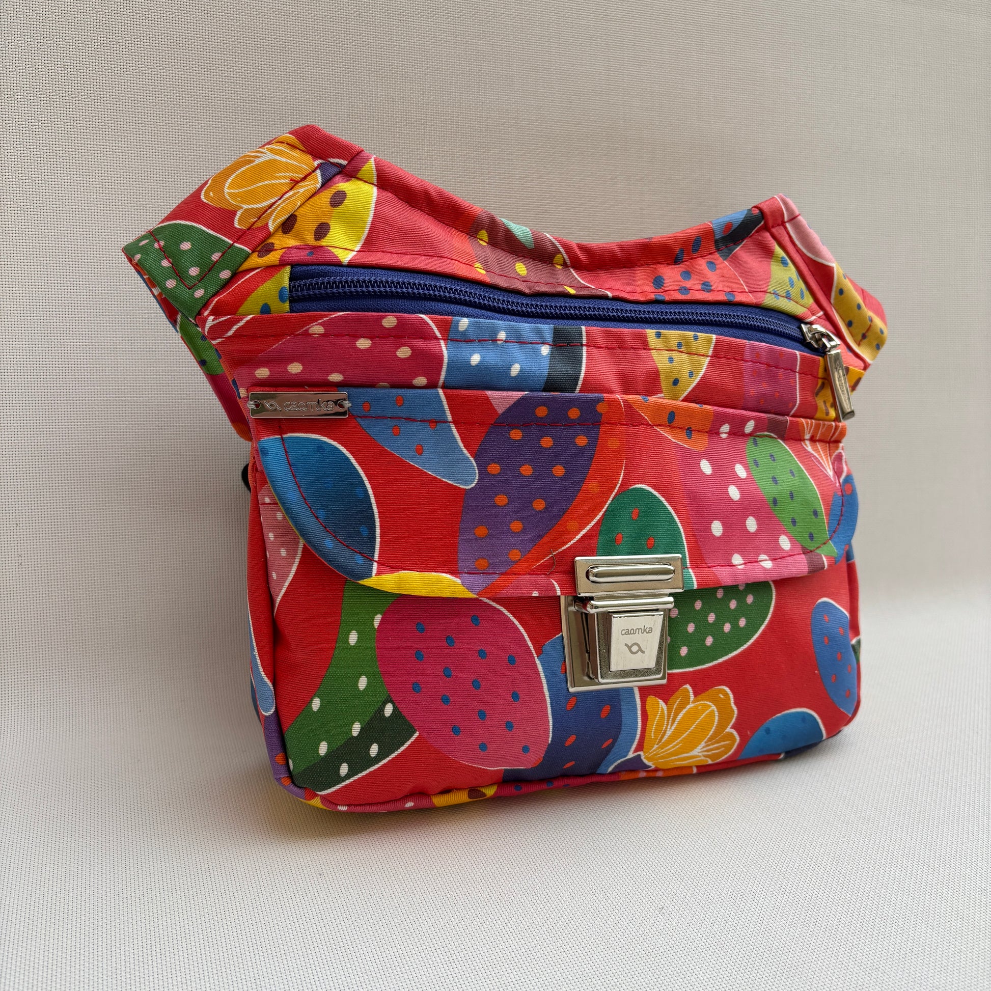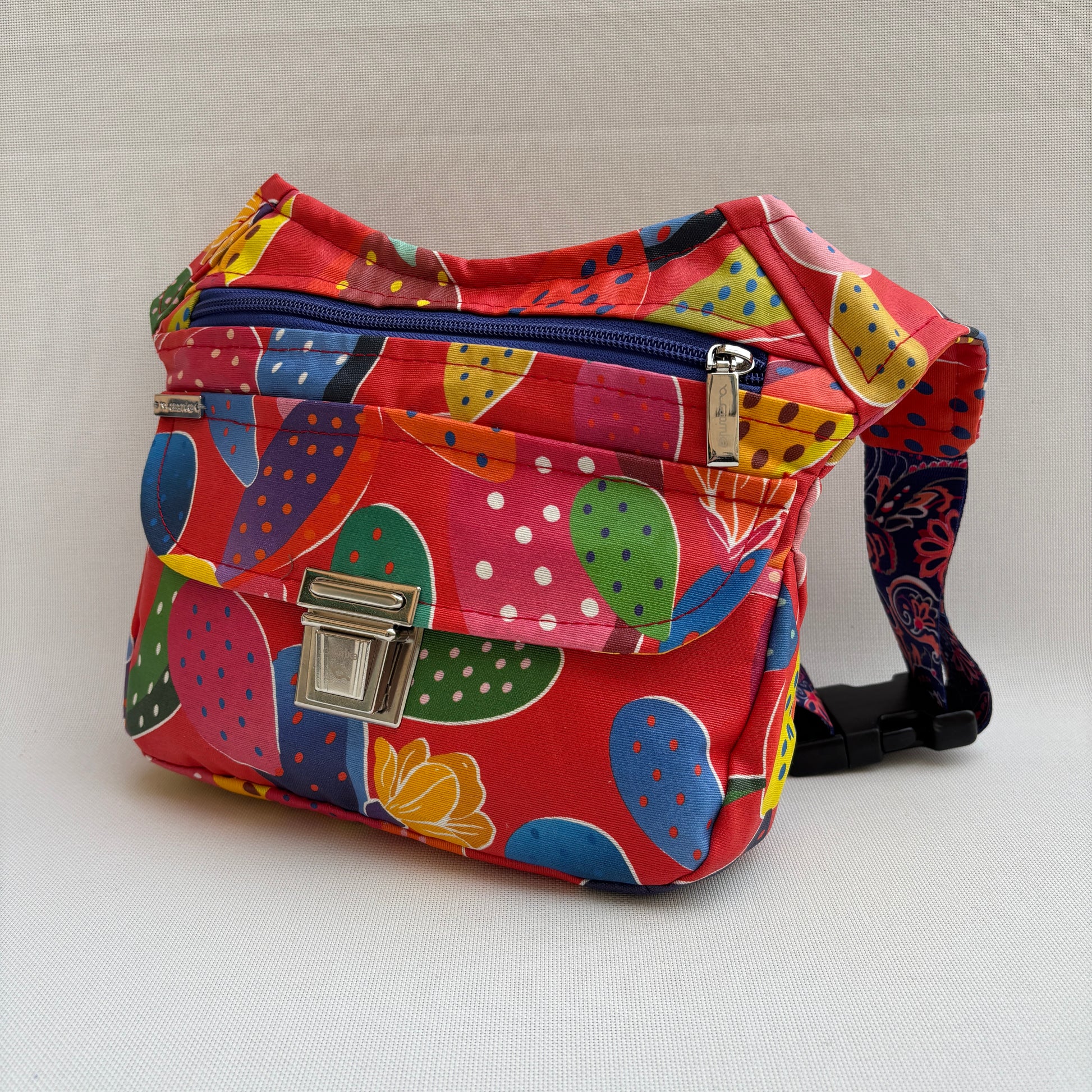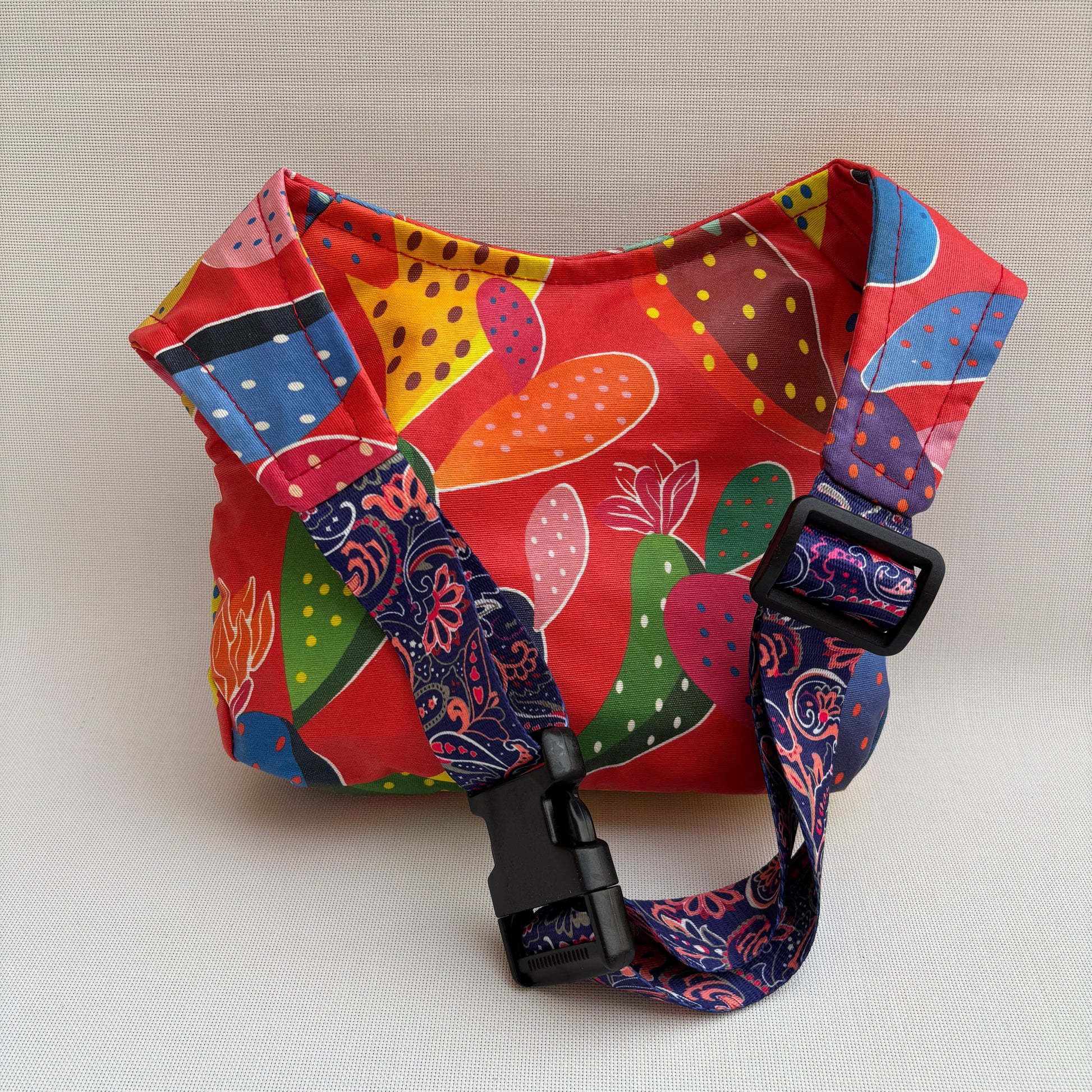 Color: Rojo vibrante con estampado multicolor de cactus y correa Top en azul con motivos florales