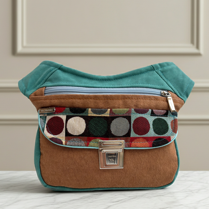 Su solapa con estampado de lunares multicolor aporta un aire artístico y dinámico, mientras la base en tono cuero equilibra el conjunto con calidez y naturalidad.