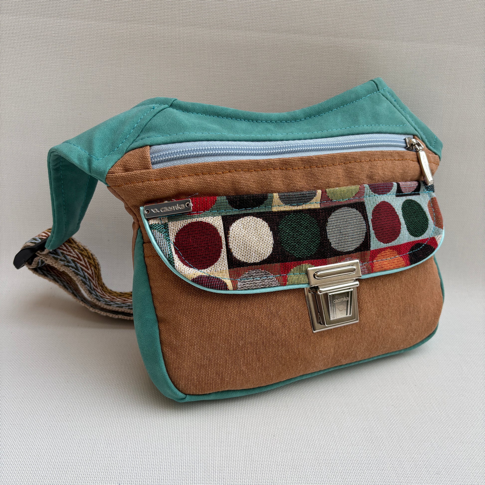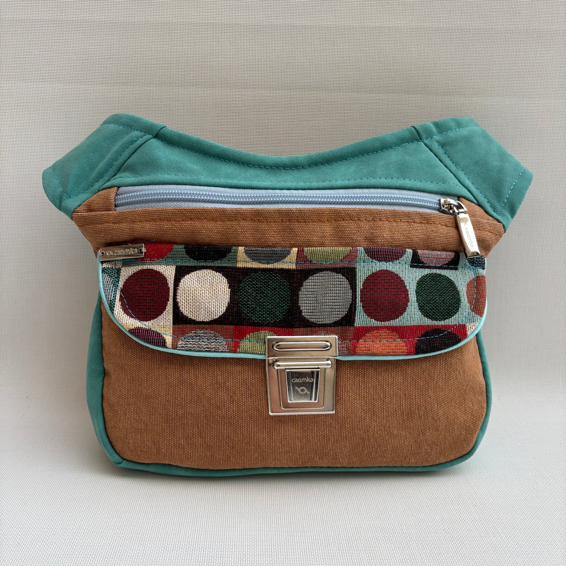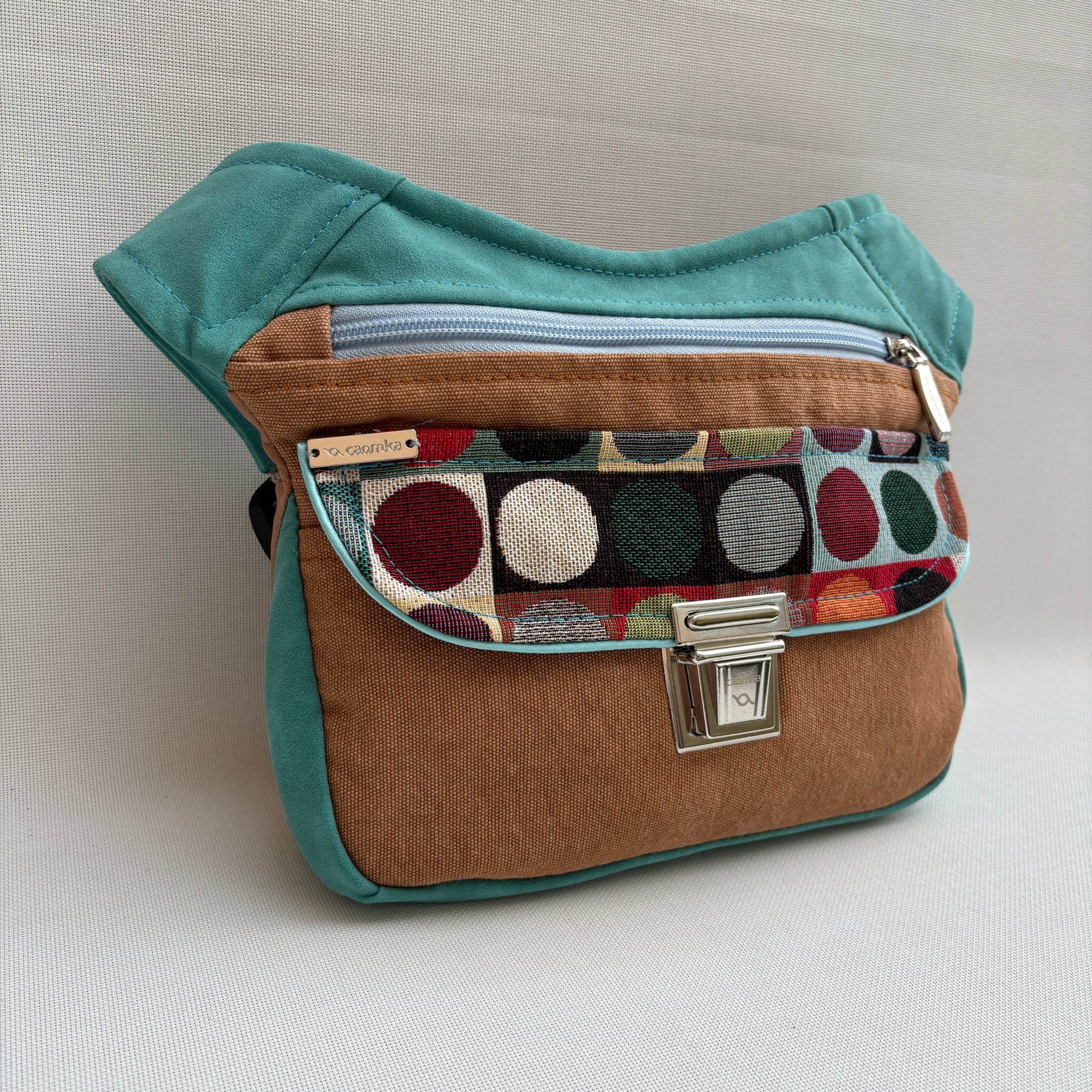 Color: Base en tono cuero cálido con solapa estampada de lunares multicolor y detalles en antelina turquesa