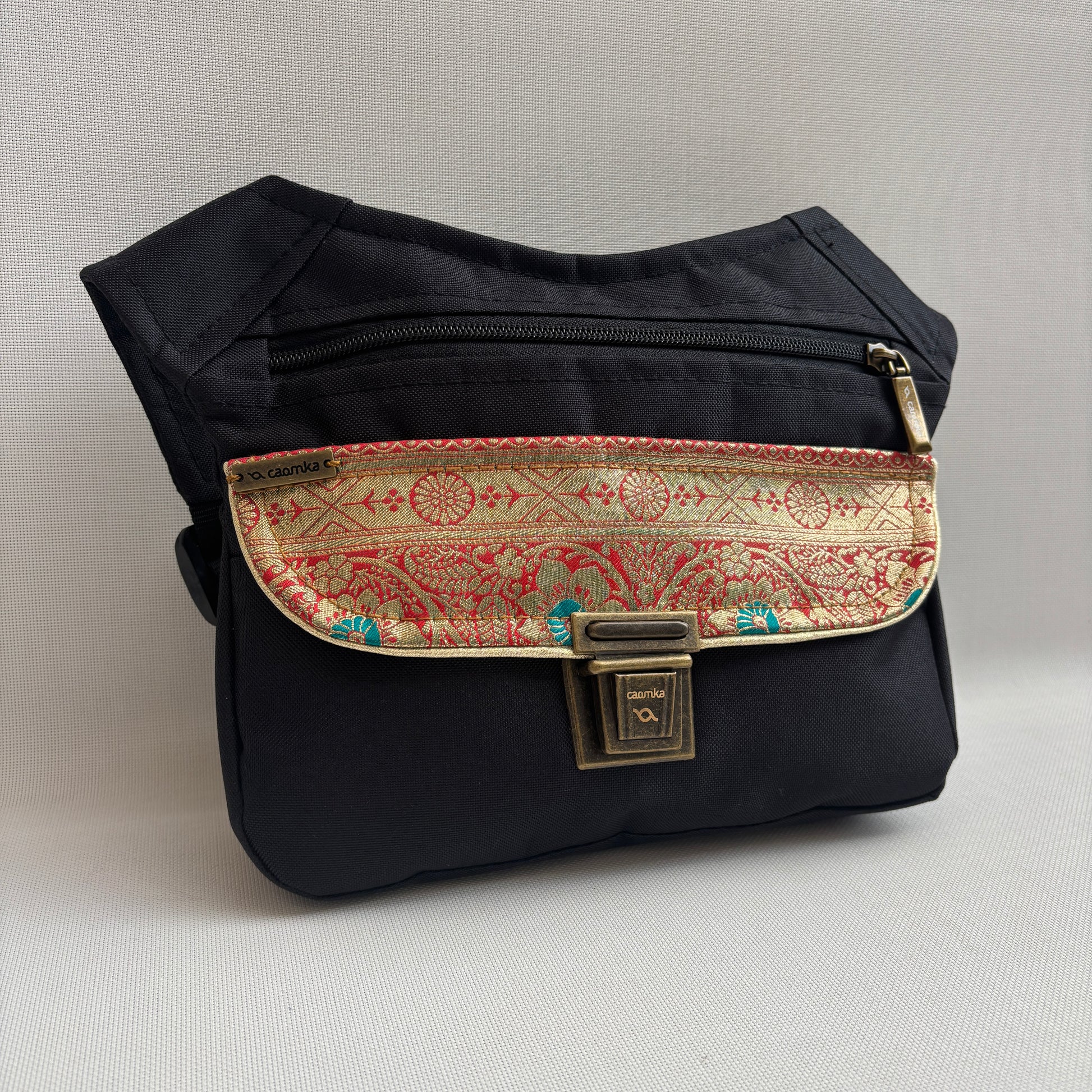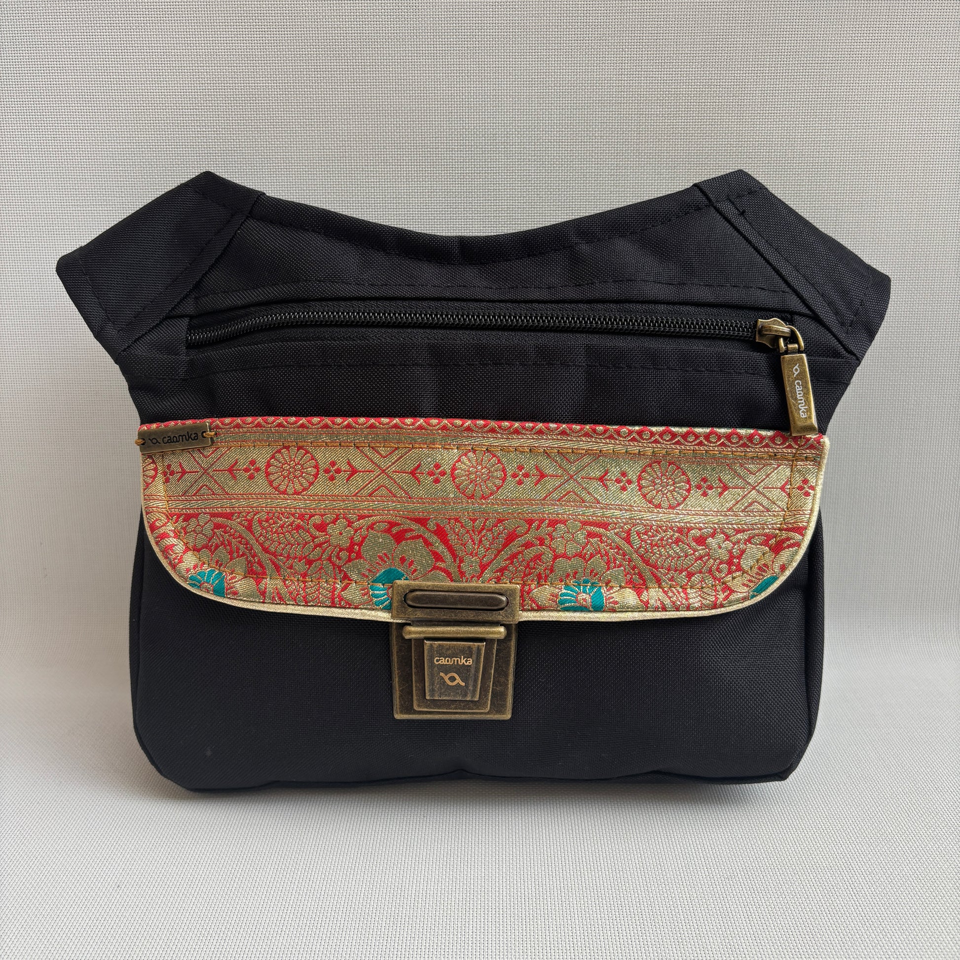 La solapa incorpora un tejido brocado de inspiración india en tonos rojo intenso y dorado con pequeños detalles turquesa, creando un contraste espectacular con la base negra.
