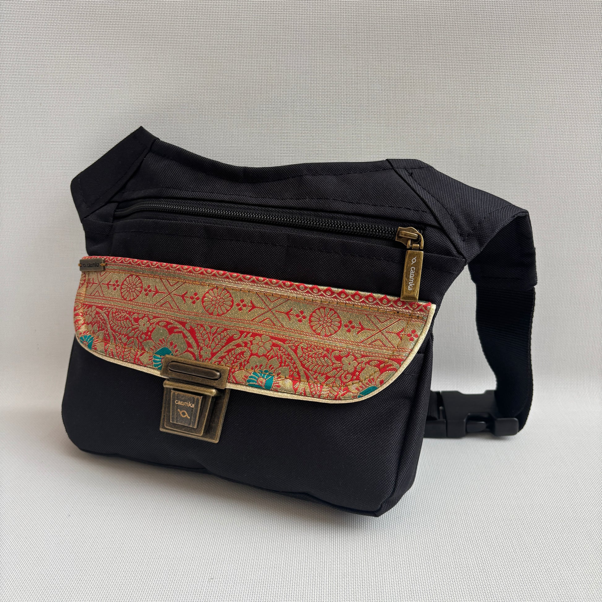 El resultado es una riñonera elegante y potente visualmente, donde el minimalismo del negro resalta la riqueza ornamental del tejido tradicional.