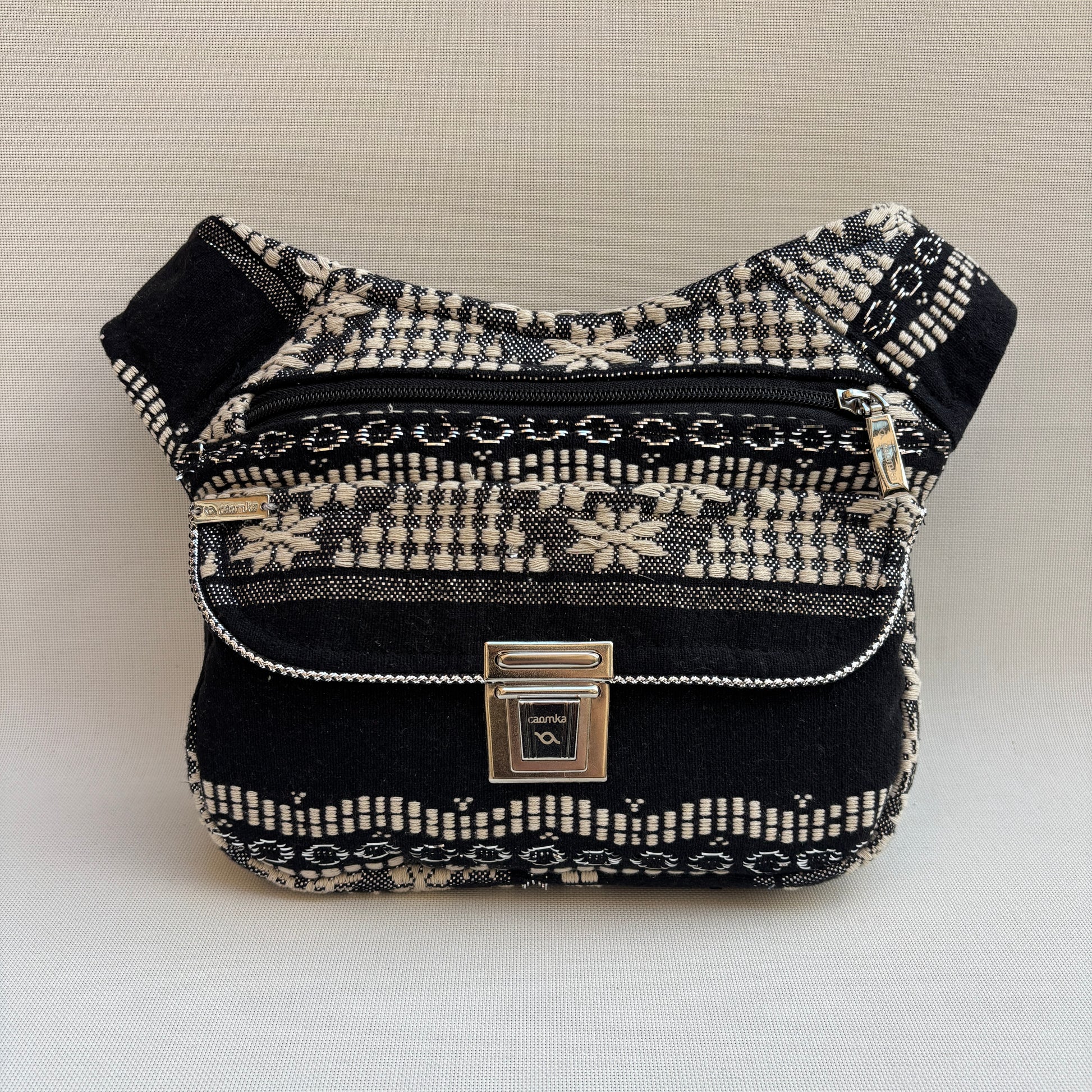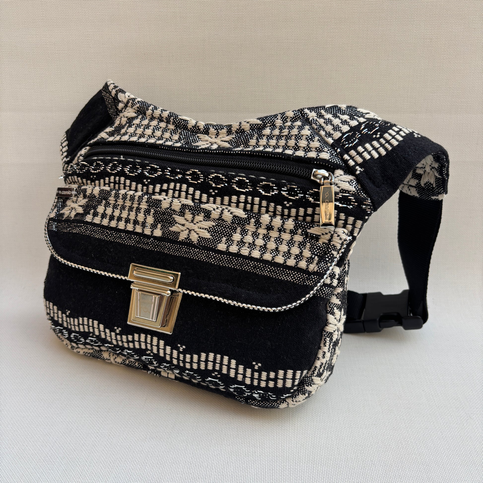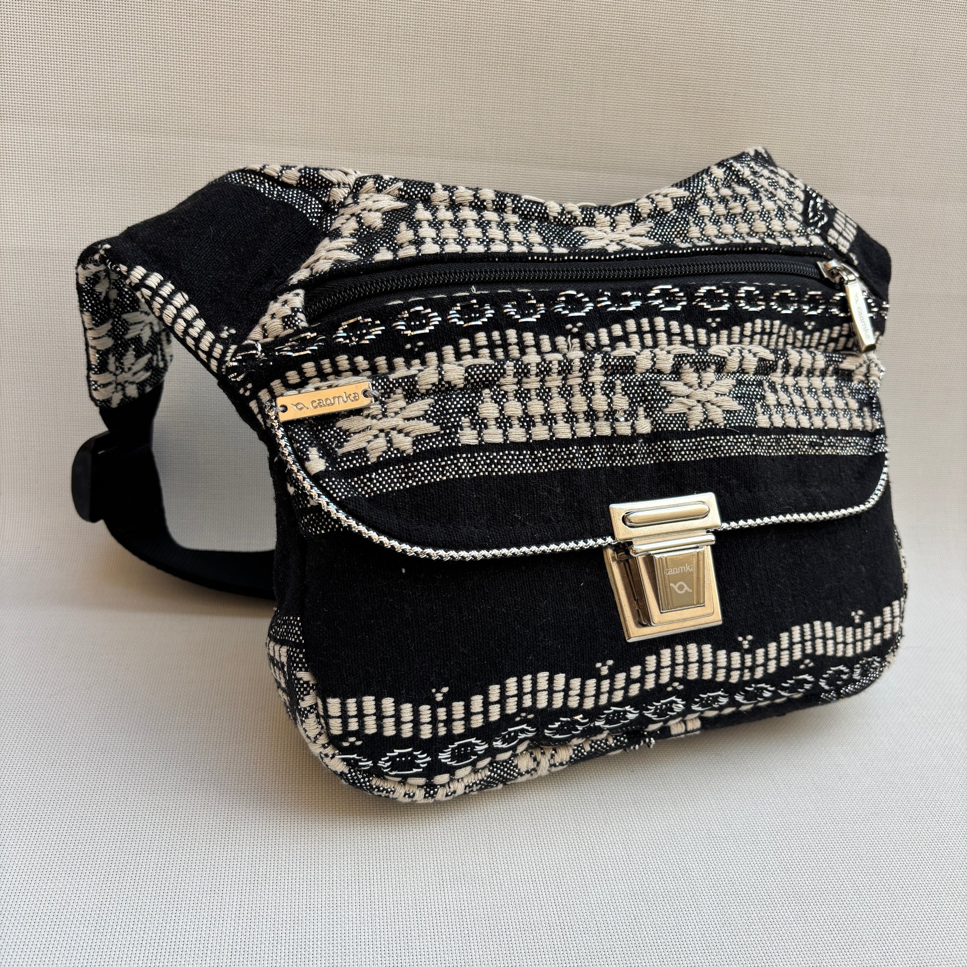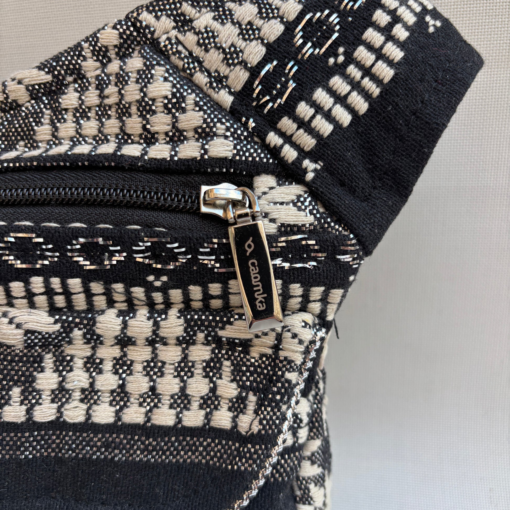 La Special Etnical India 18464 es una riñonera con carácter, confeccionada en un tejido étnico de inspiración india en contraste negro y beige que crea un potente juego gráfico de formas geométricas y flores textiles.