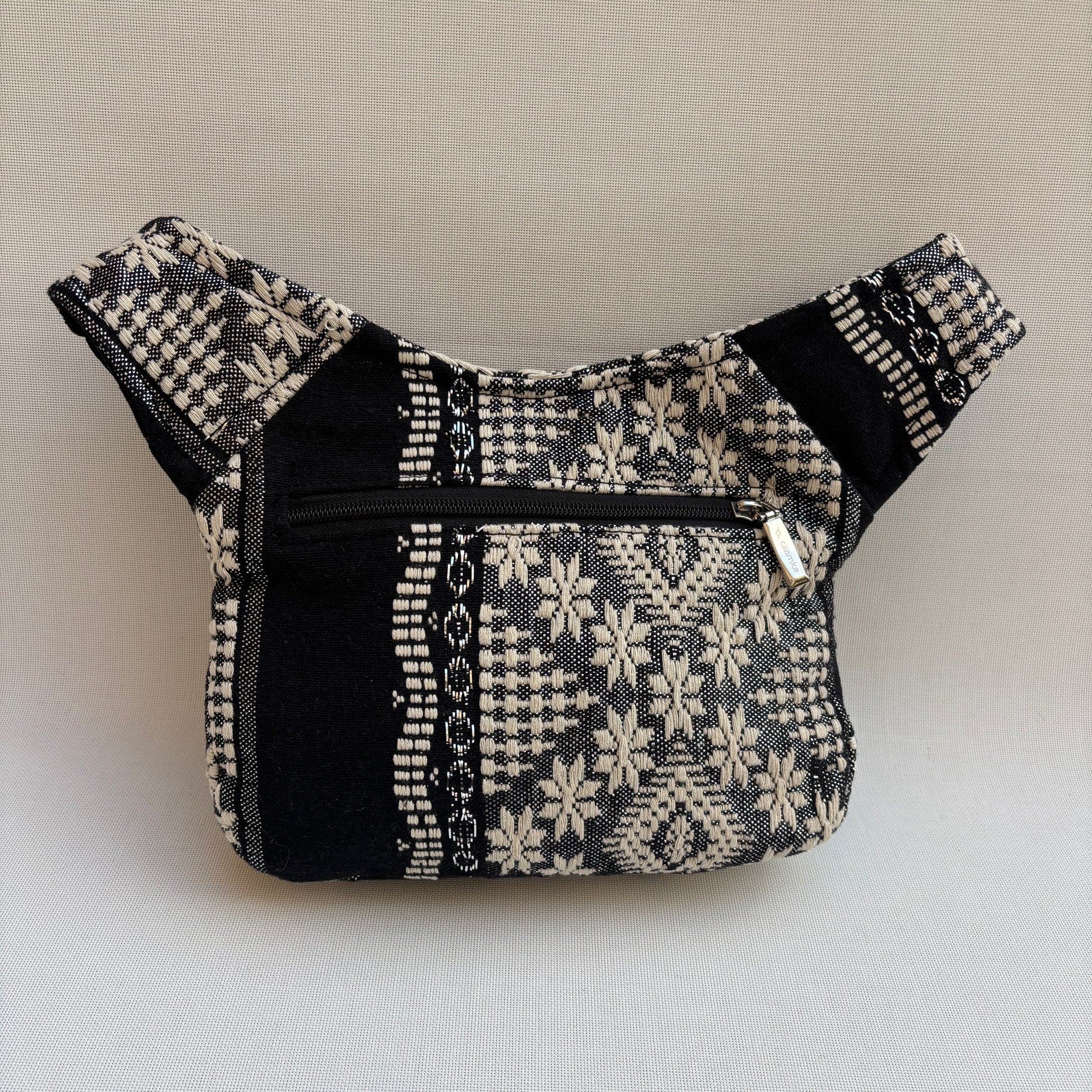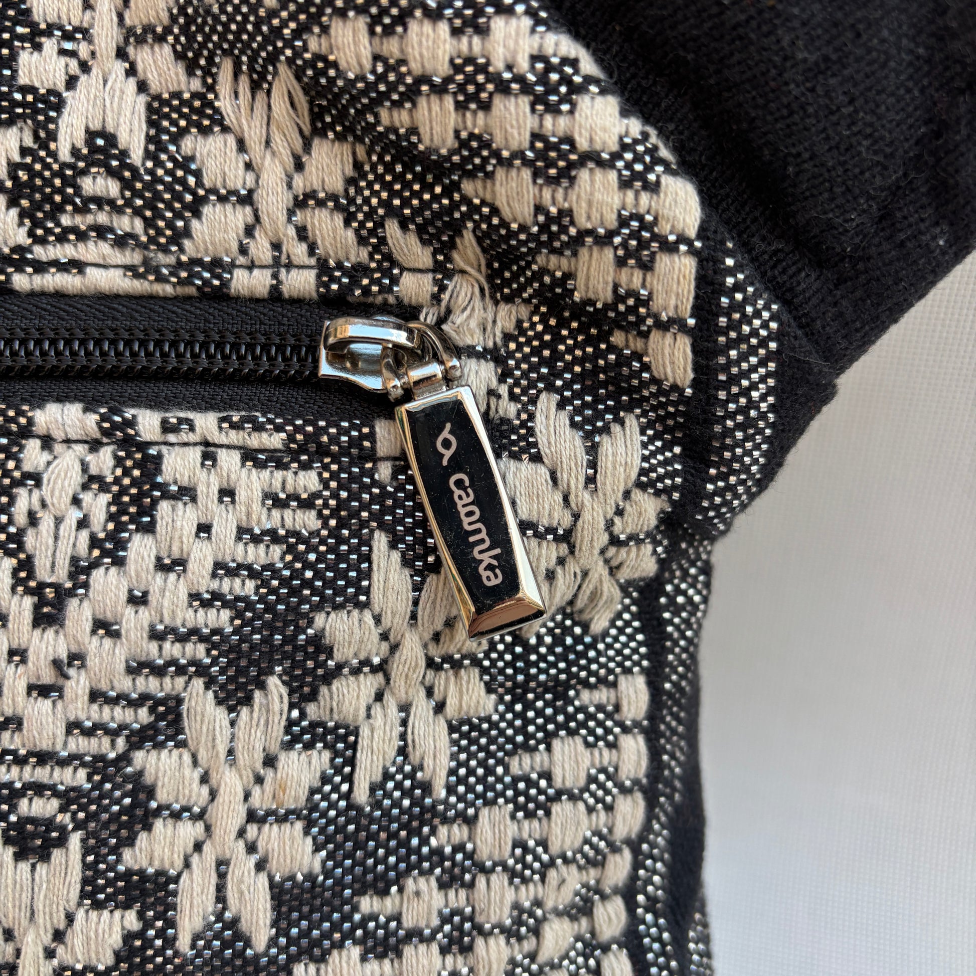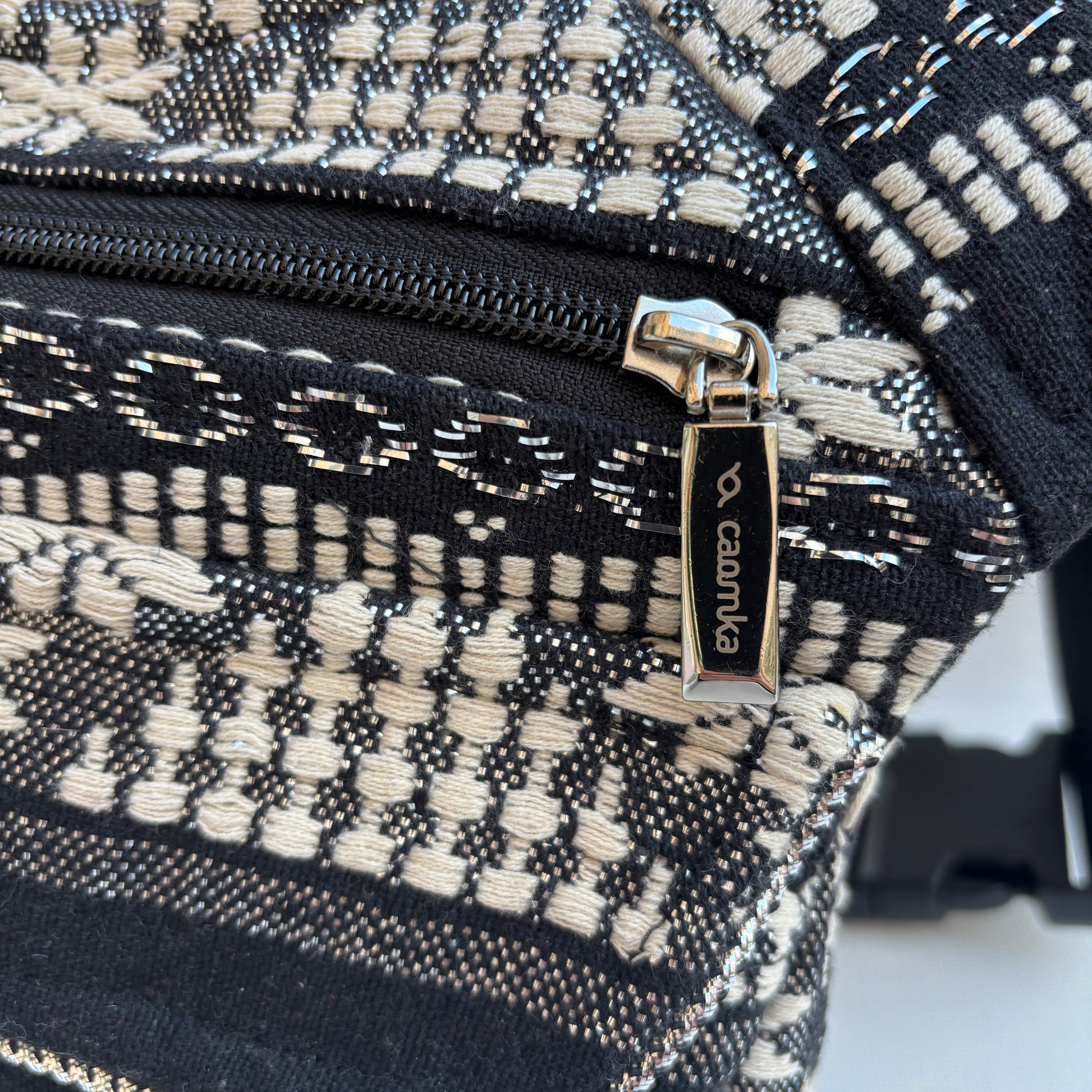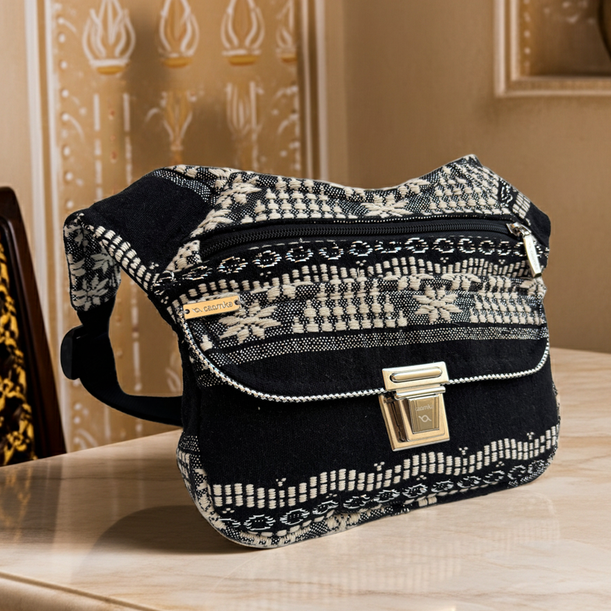 La Special Etnical India 18464 es una riñonera con carácter, confeccionada en un tejido étnico de inspiración india en contraste negro y beige que crea un potente juego gráfico de formas geométricas y flores textiles.