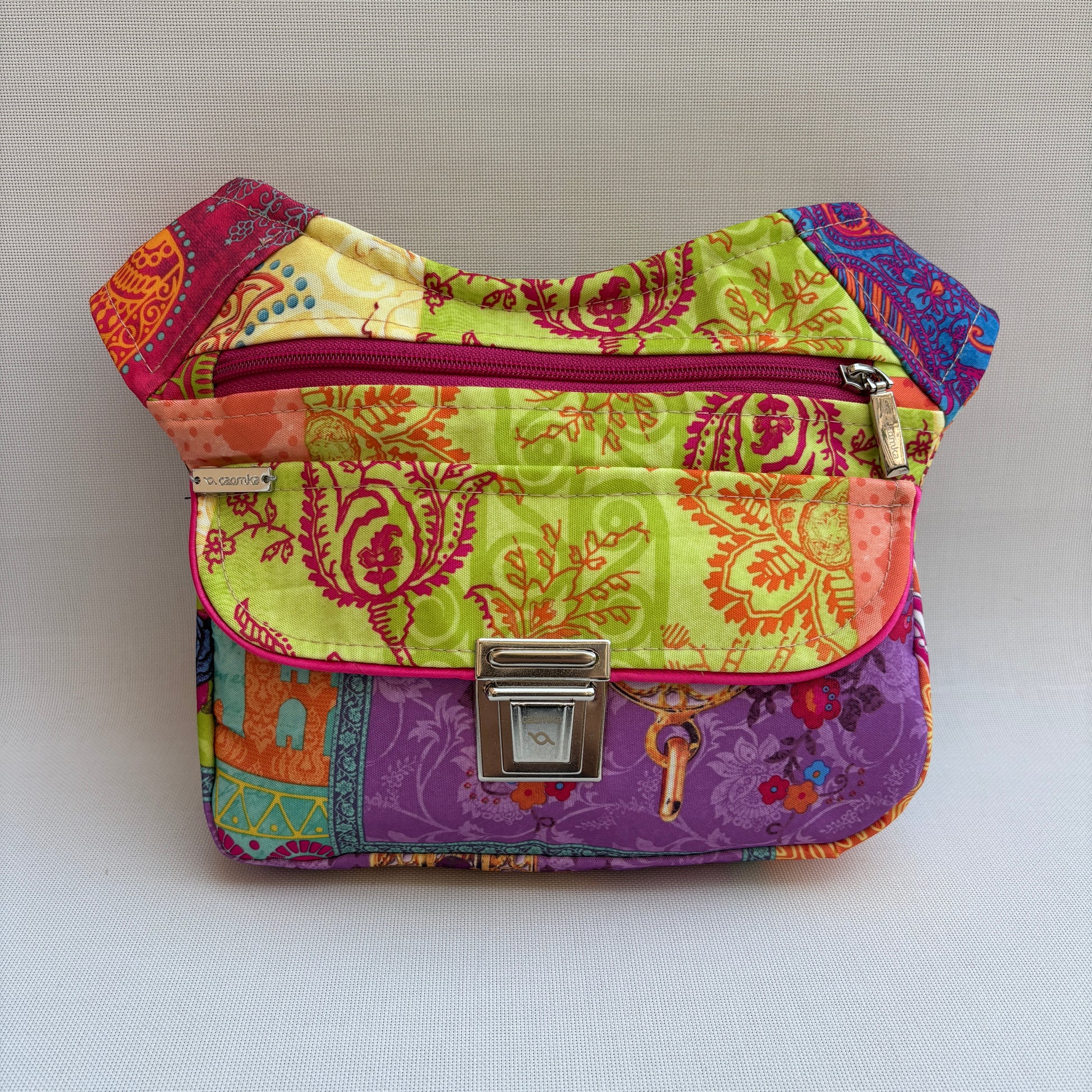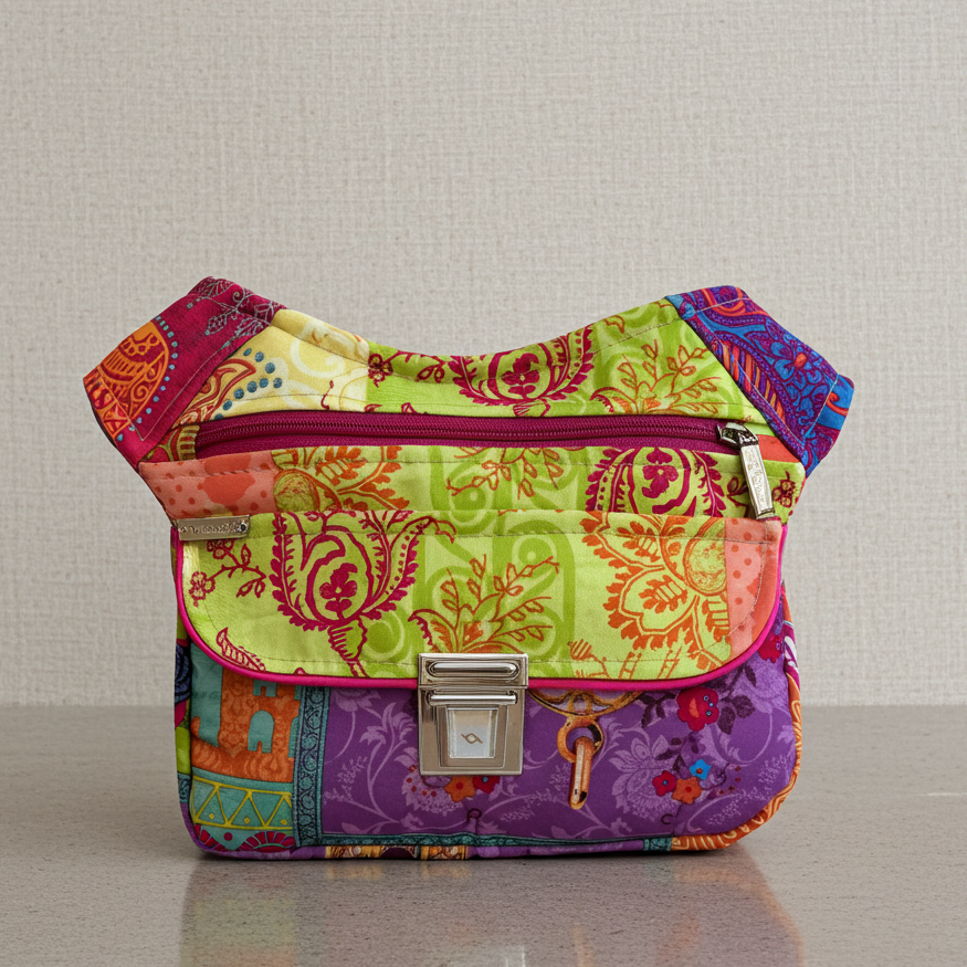 La solapa superior destaca con un estampado verde lima con motivos paisley en tonos fucsia y naranja, creando un contraste vibrante con el resto de los paneles del diseño.