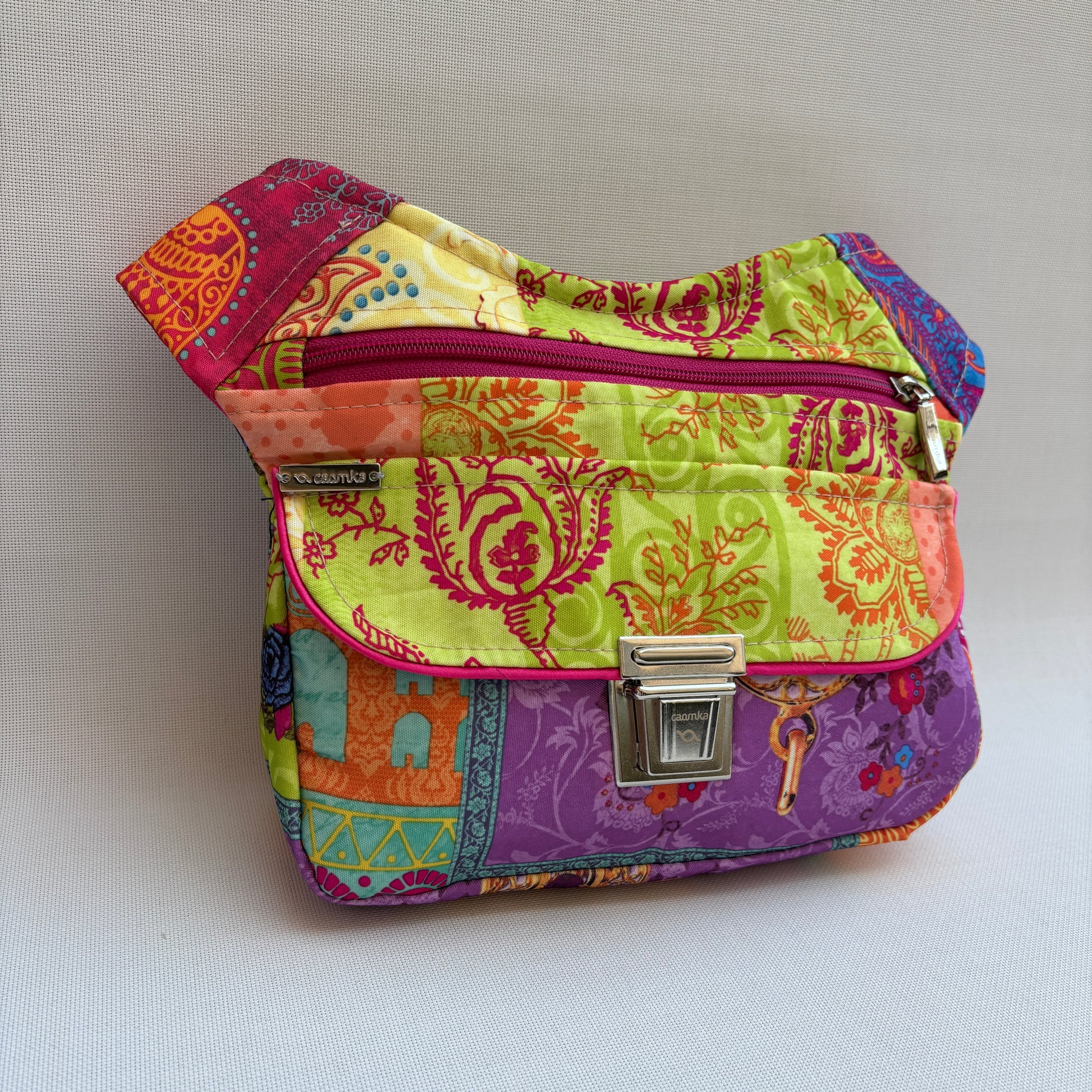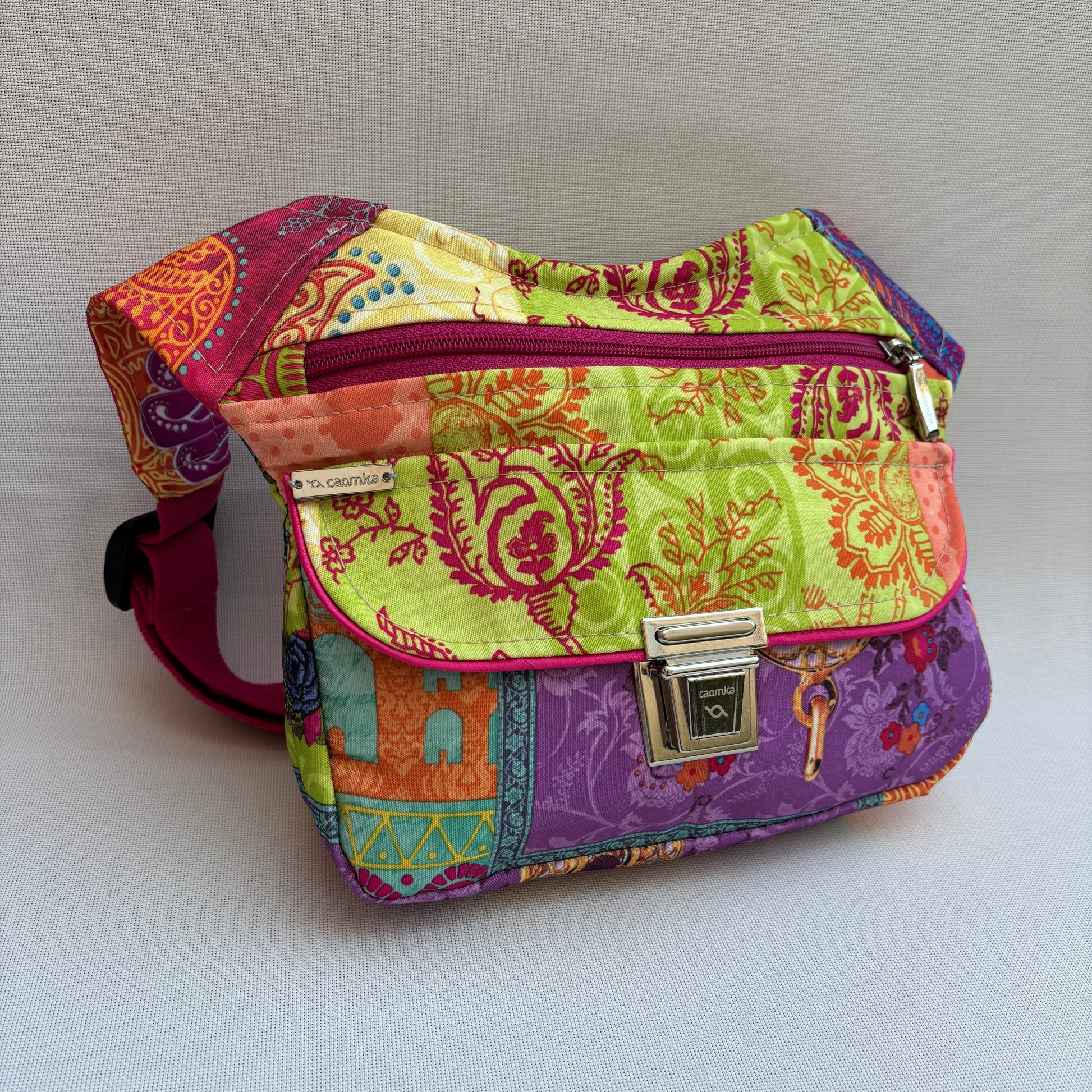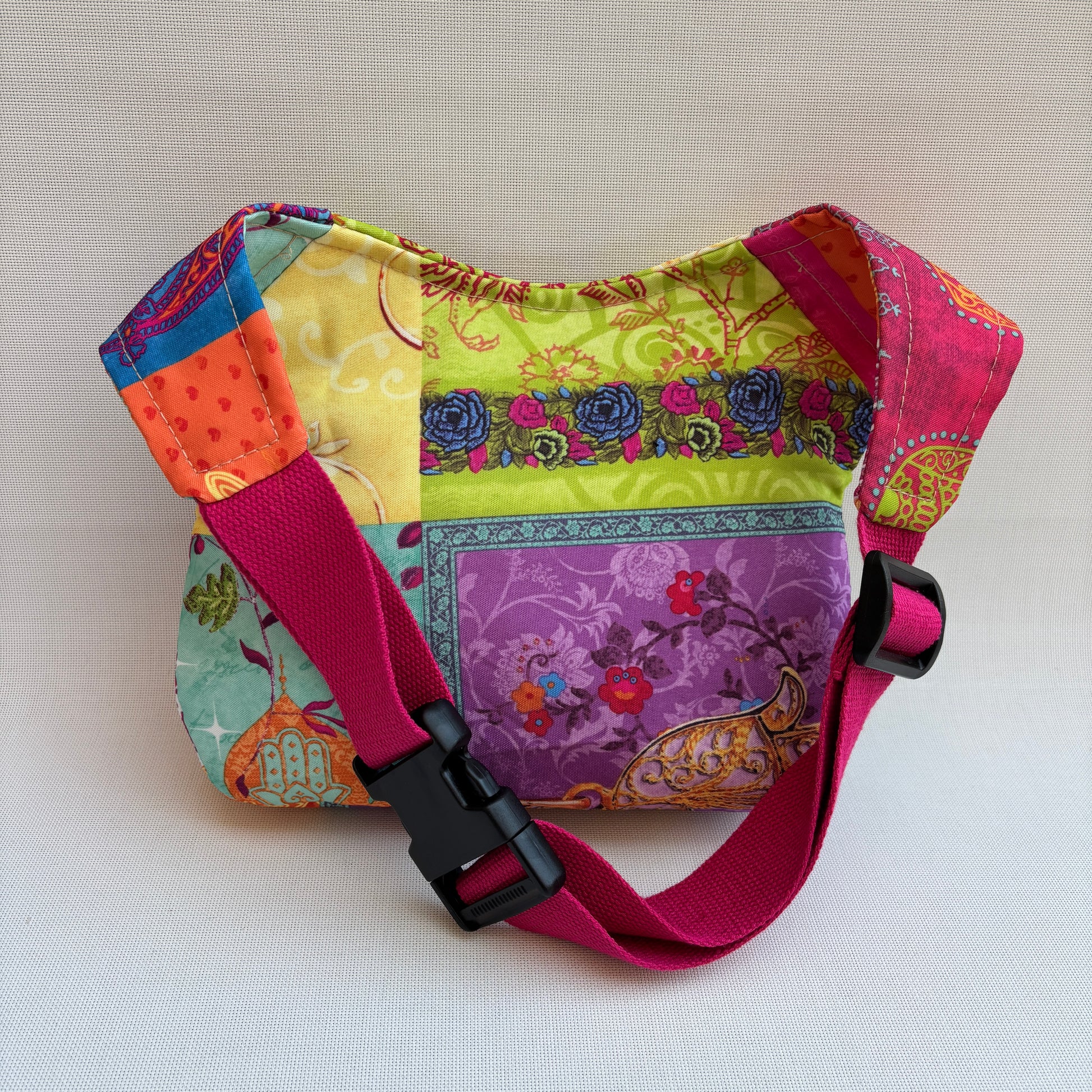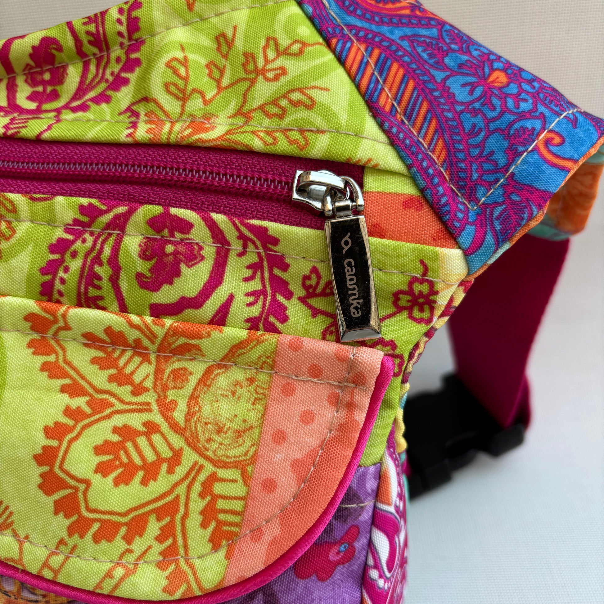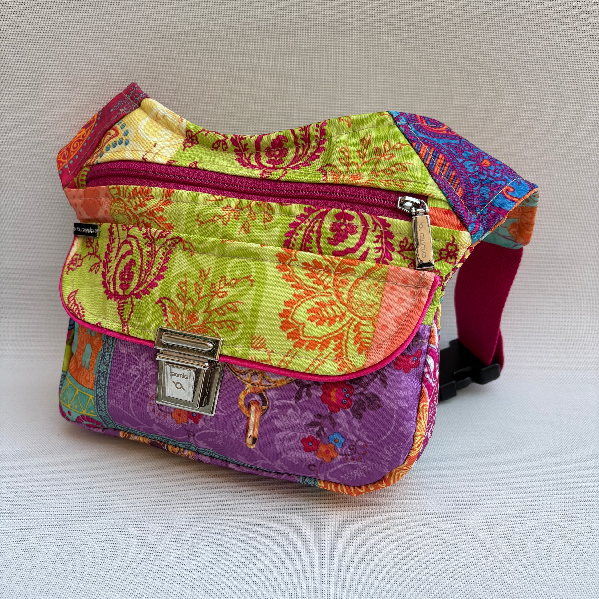 El cuerpo de la riñonera está confeccionado en tejido impermeable multicolor con una mezcla de patrones decorativos que recuerdan a textiles bohemios y orientales.