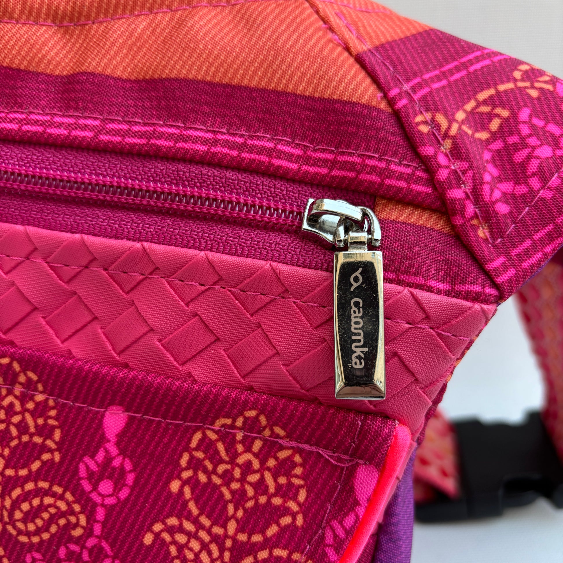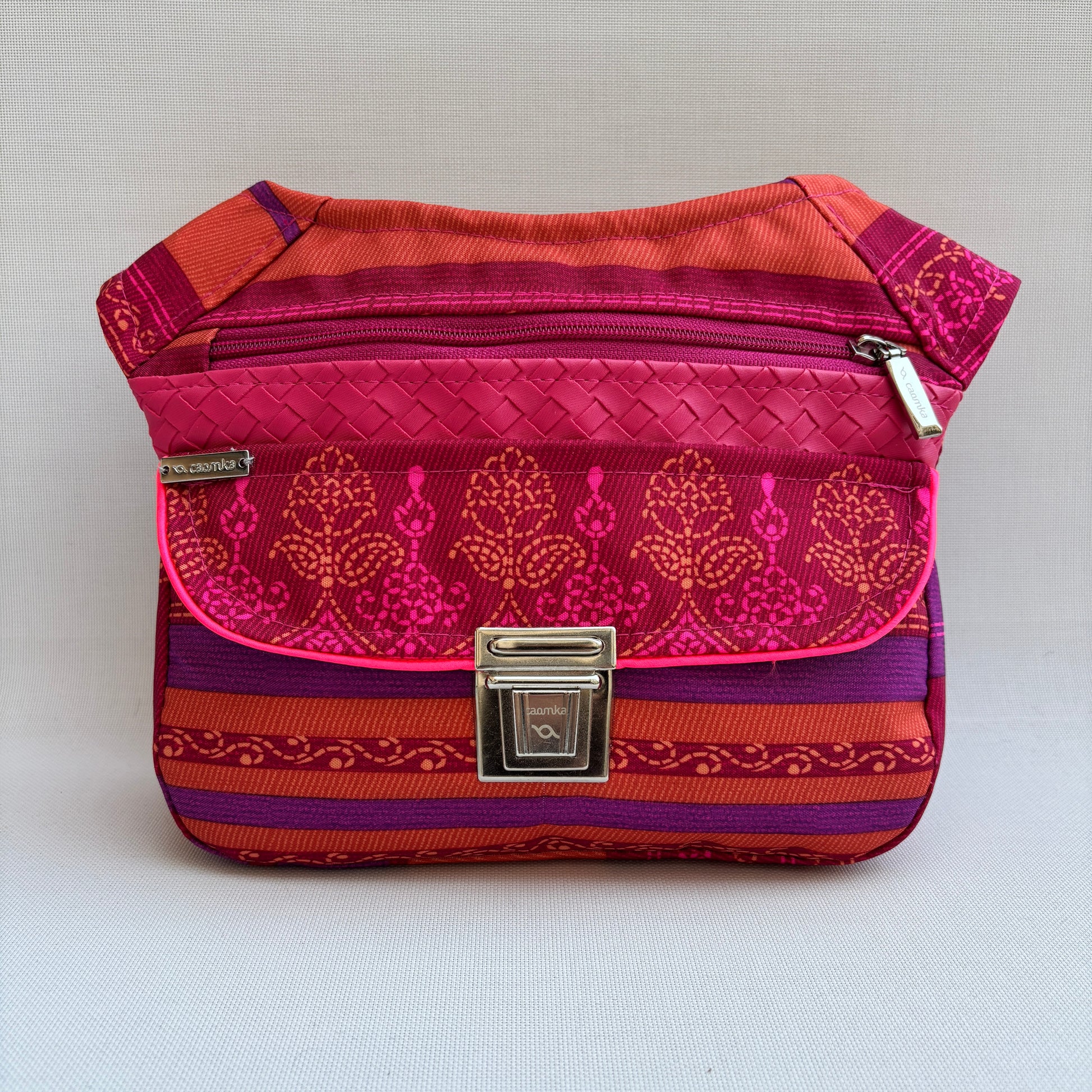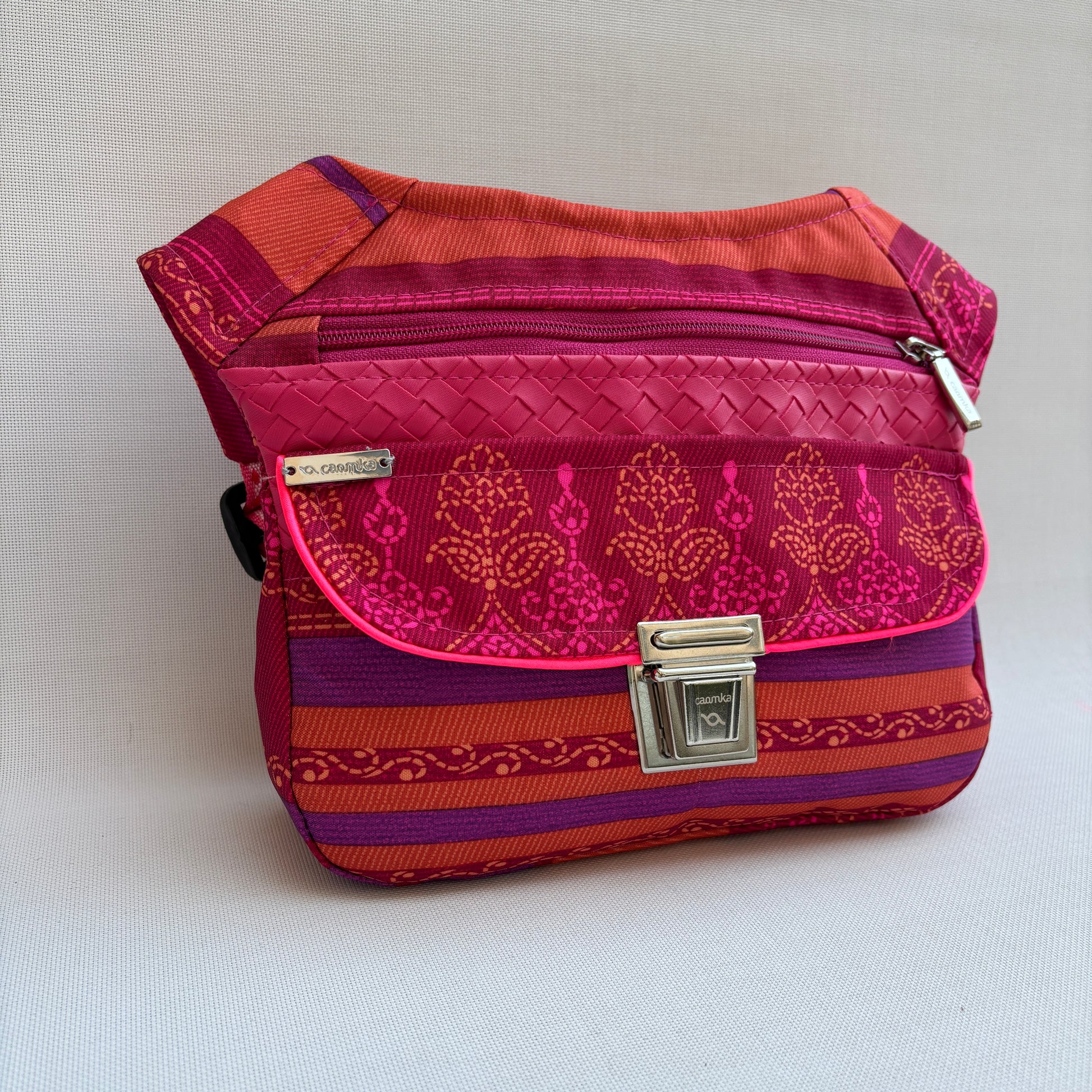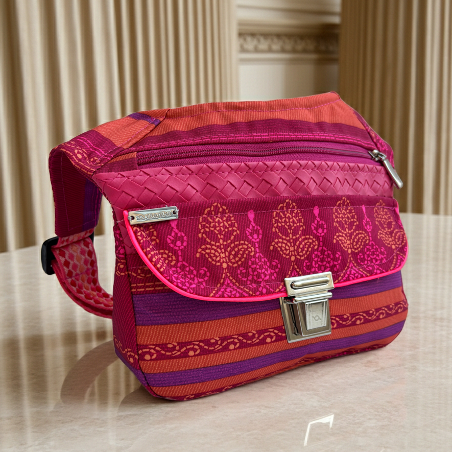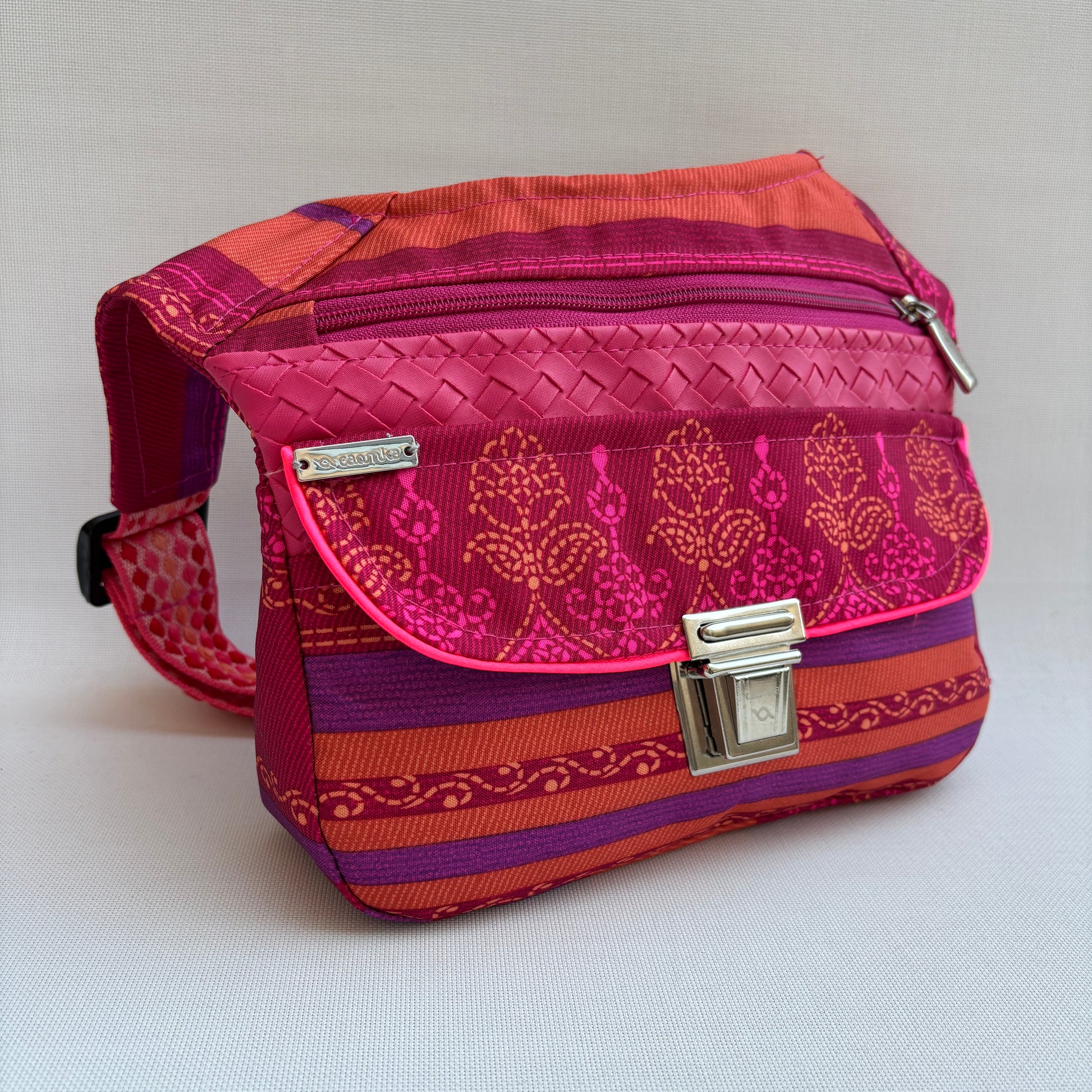 La Special Fantasy Top 18387 es una riñonera vibrante y expresiva que juega con franjas en tonos fucsia, magenta y naranja, combinadas con un estampado ornamental lleno de ritmo y personalidad.