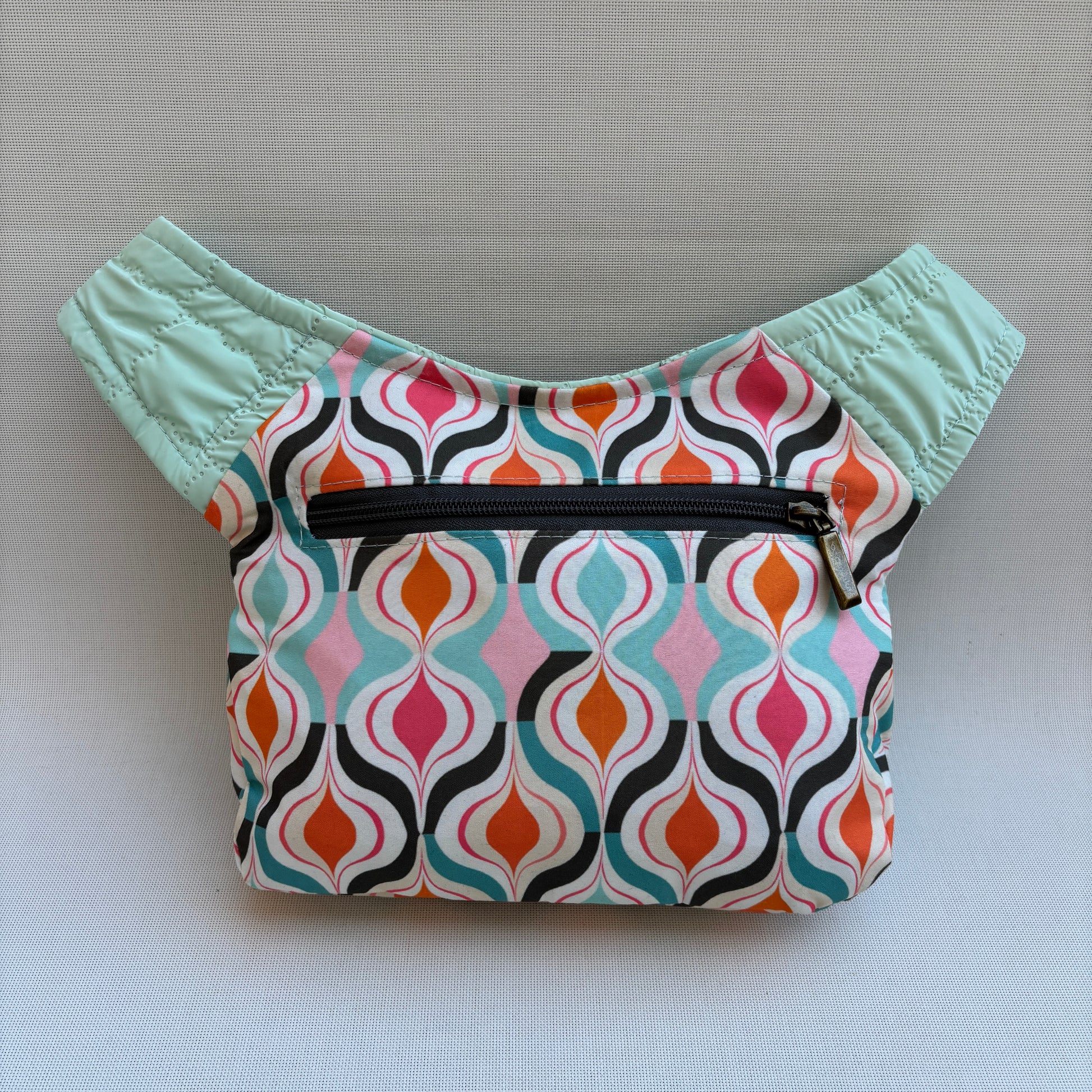 Color: Verde menta con estampado geométrico multicolor en tonos naranja, rosa, turquesa y negro