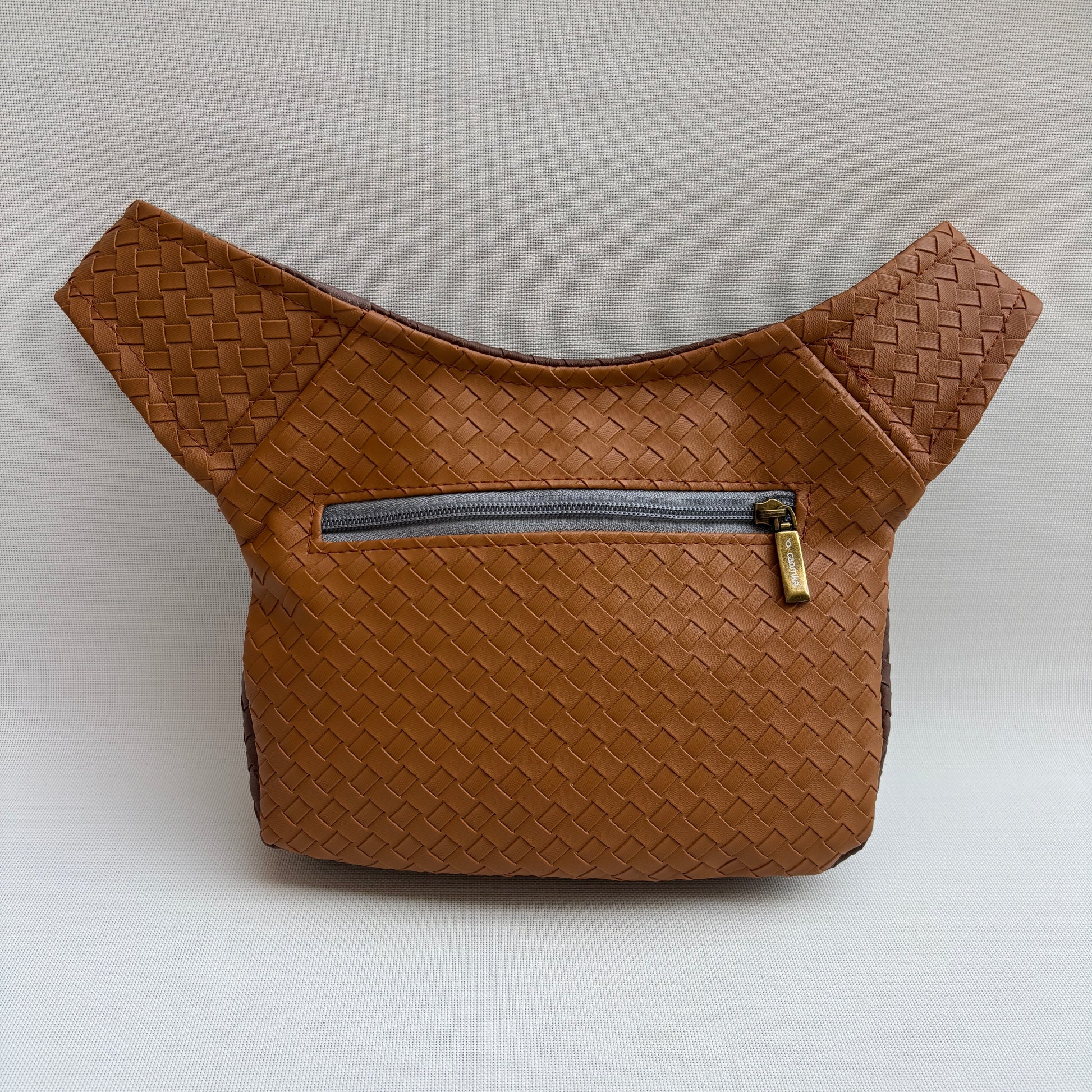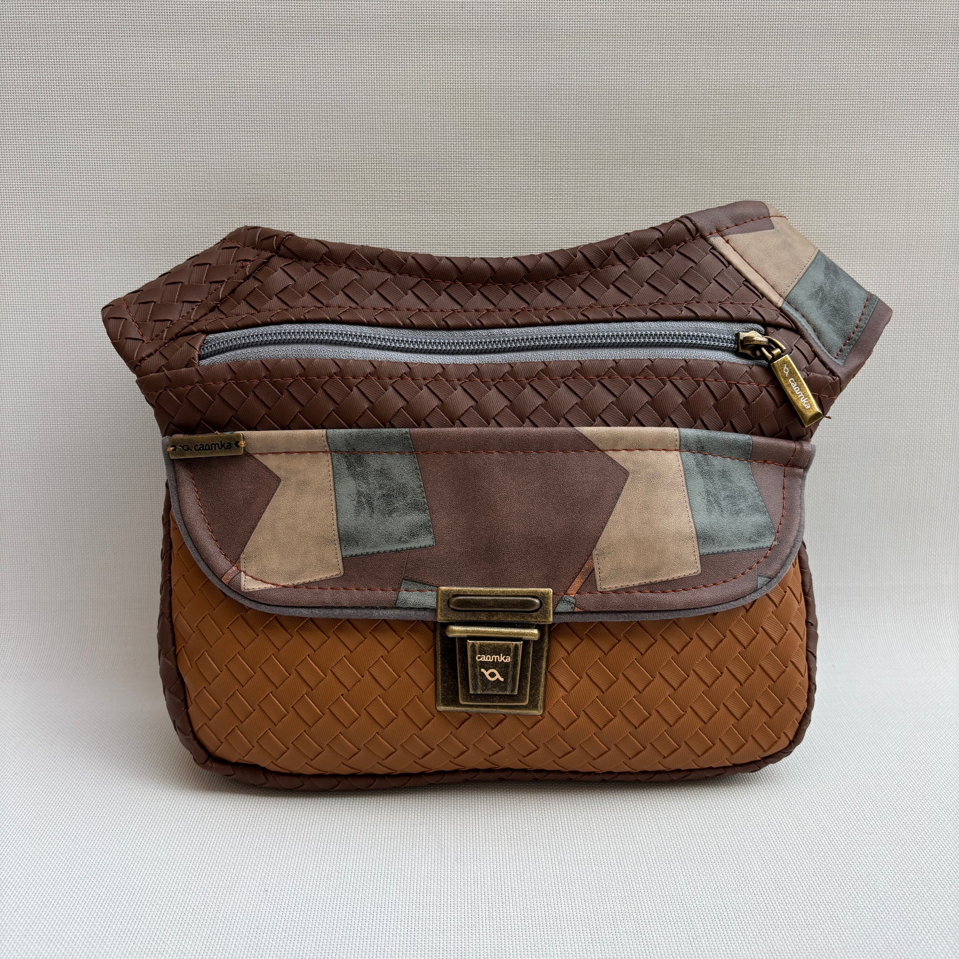 El cuerpo en polipiel trenzada tono caramelo y marrón chocolate recuerda al cuero trenzado clásico, mientras que la solapa con piezas geométricas en tonos topo, beige y gris le da un toque contemporáneo y creativo.