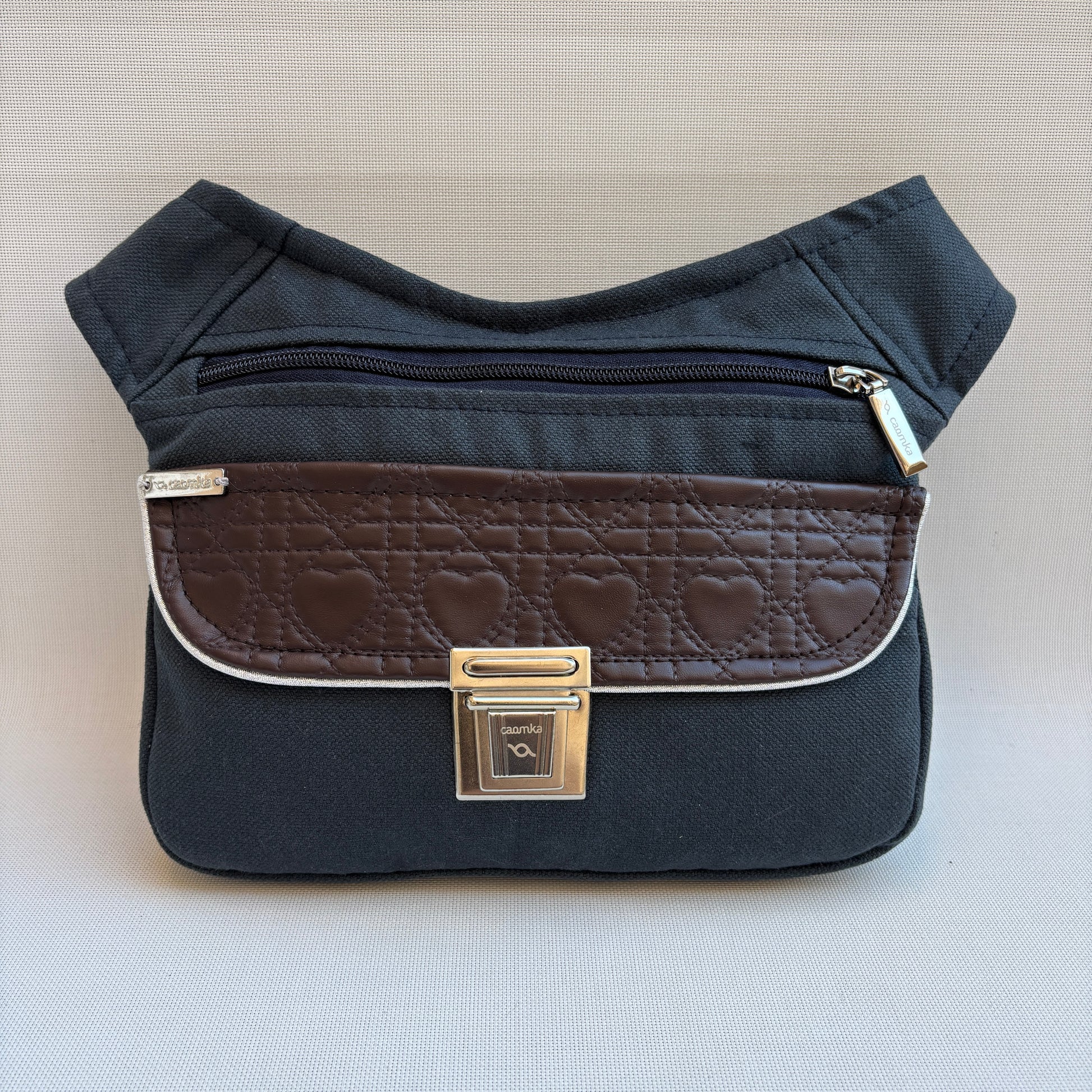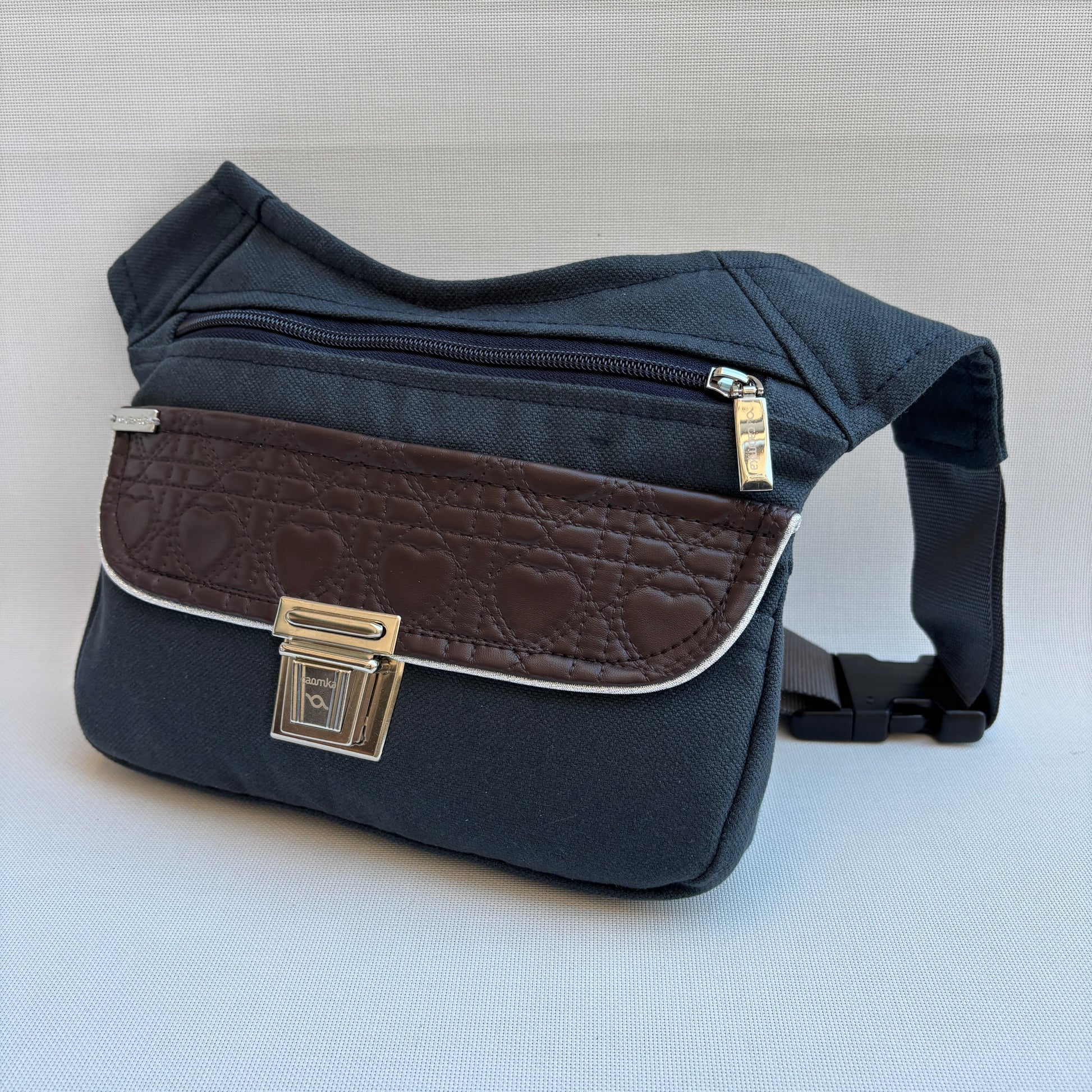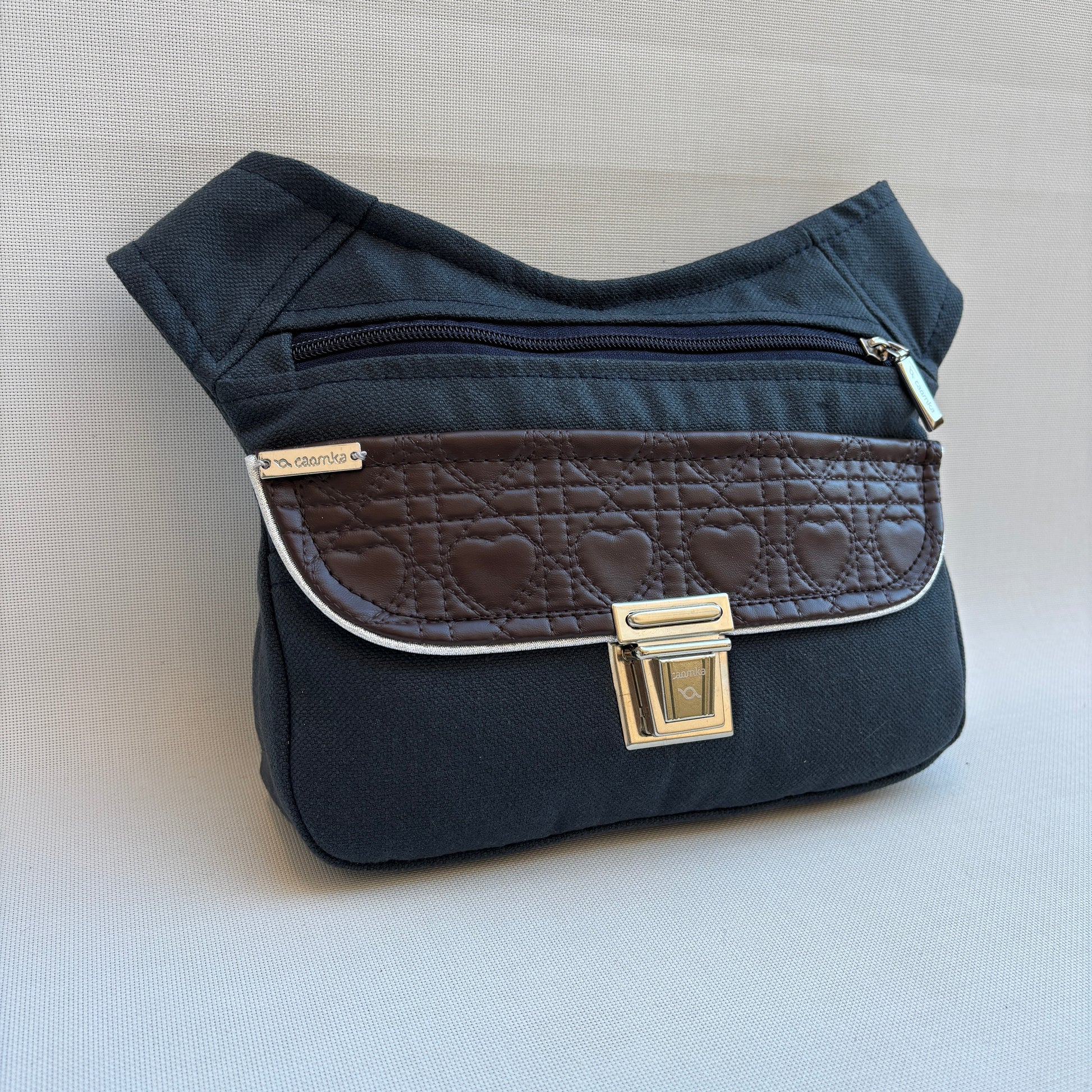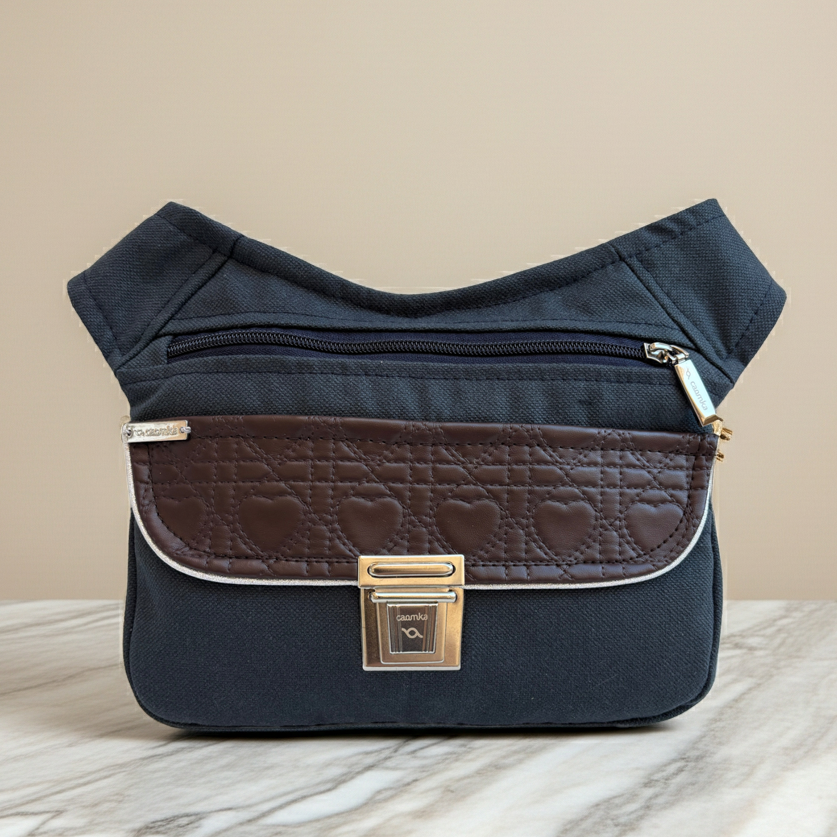 Su base en tejido azul marino aporta sobriedad y versatilidad, mientras que la solapa en polipiel marrón con grabado de corazones introduce un guiño romántico discreto, sin perder fuerza ni personalidad.