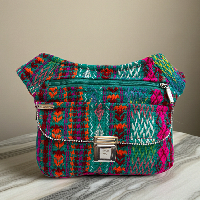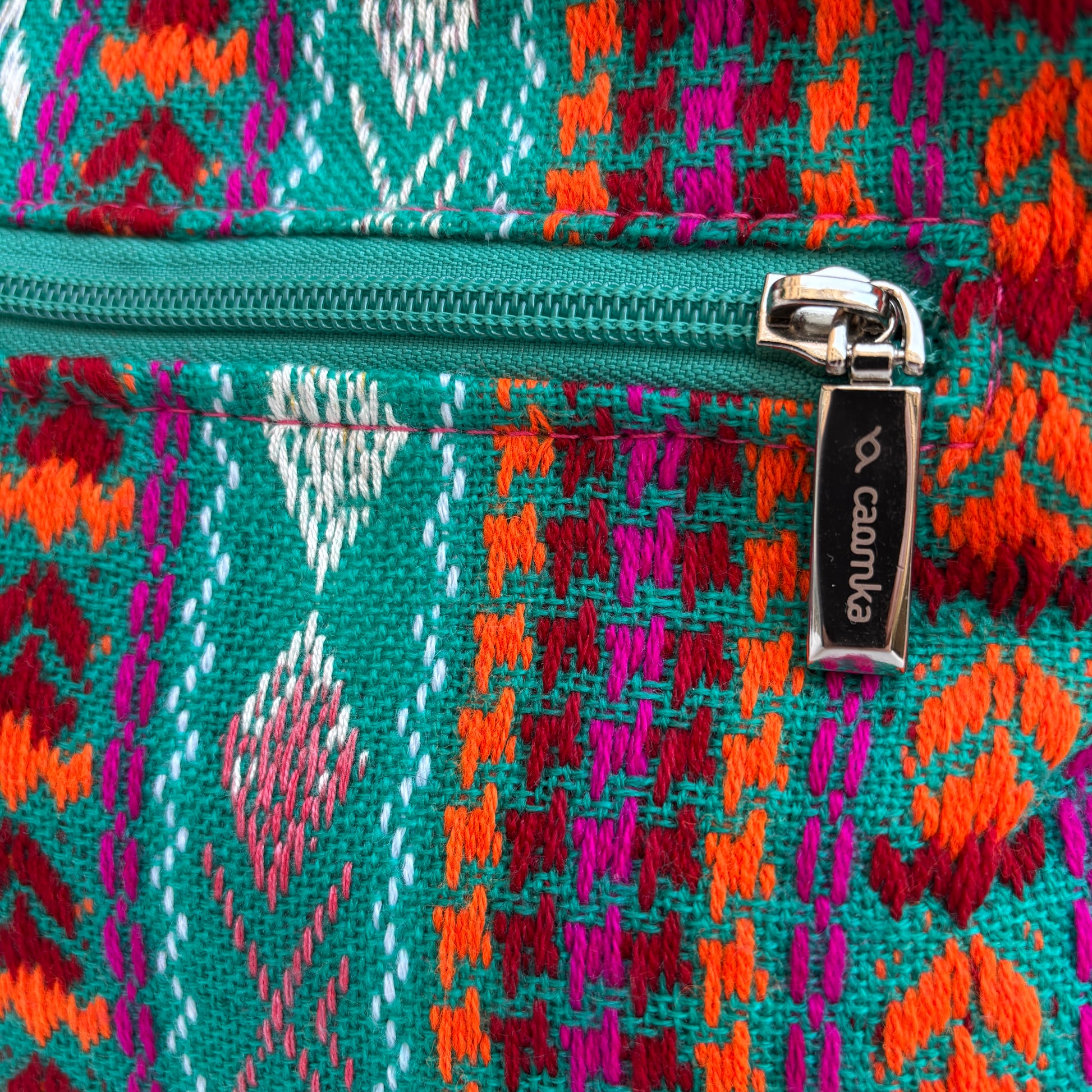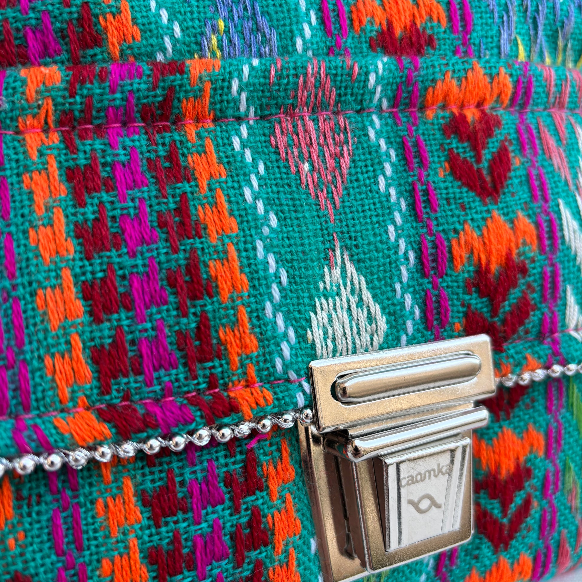 Color: Tejido étnico multicolor en tonos verde turquesa, fucsia, naranja y detalles en crudo