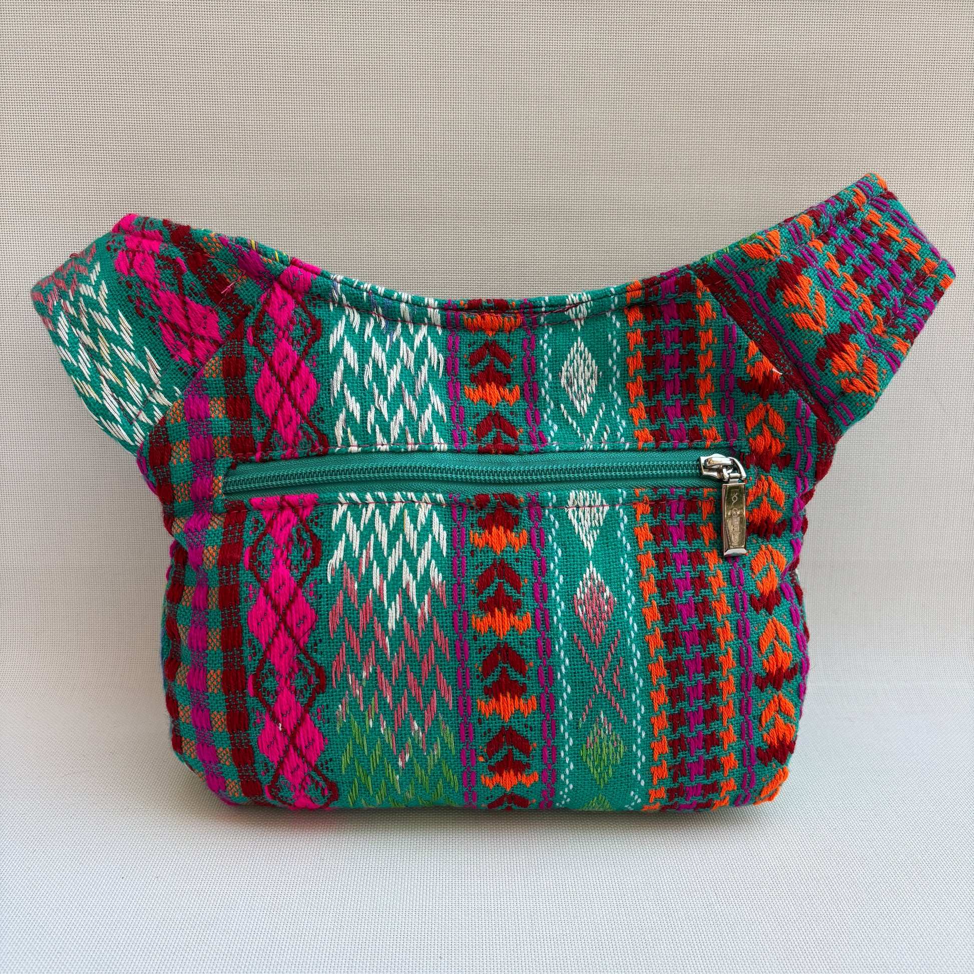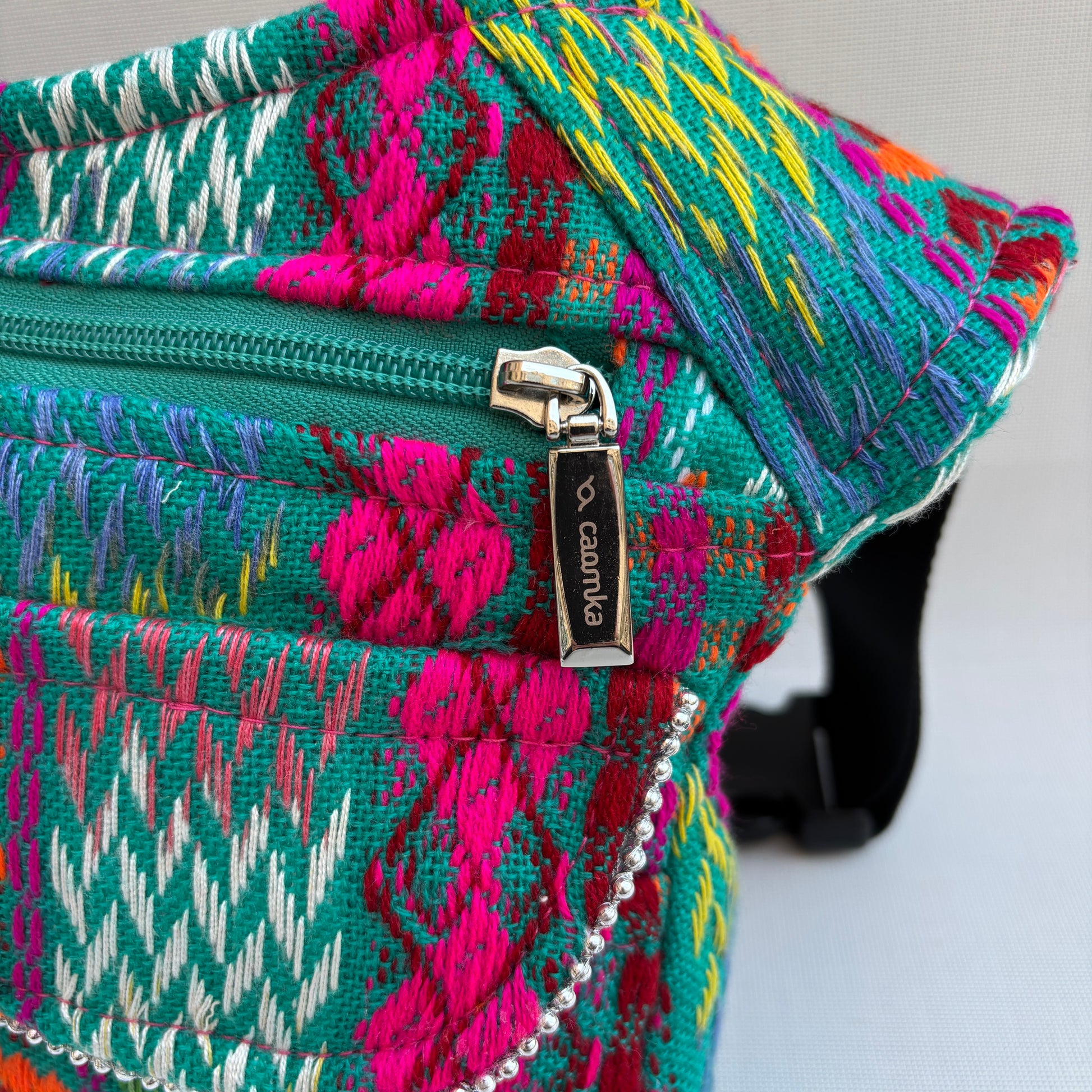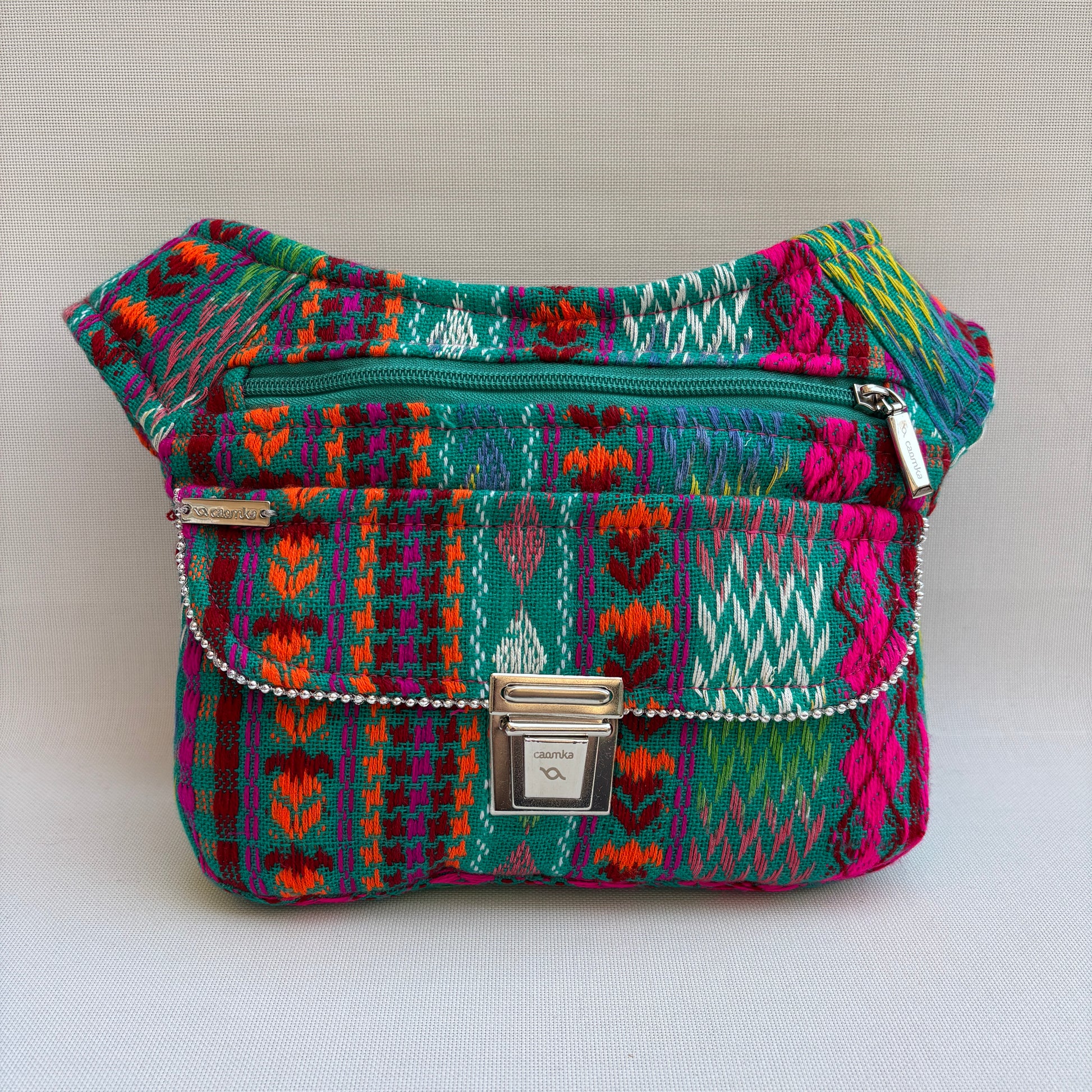 Color: Tejido étnico multicolor en tonos verde turquesa, fucsia, naranja y detalles en crudo