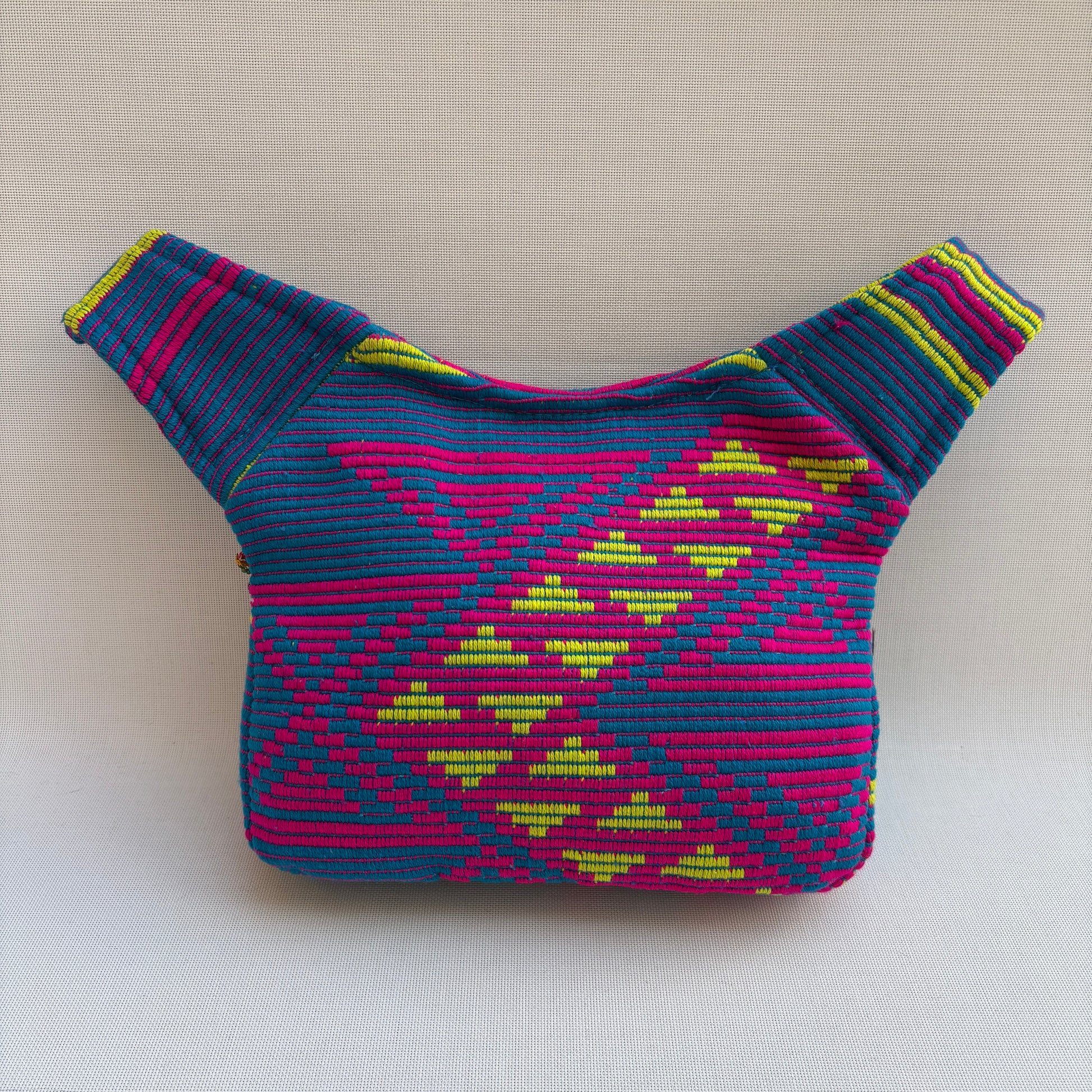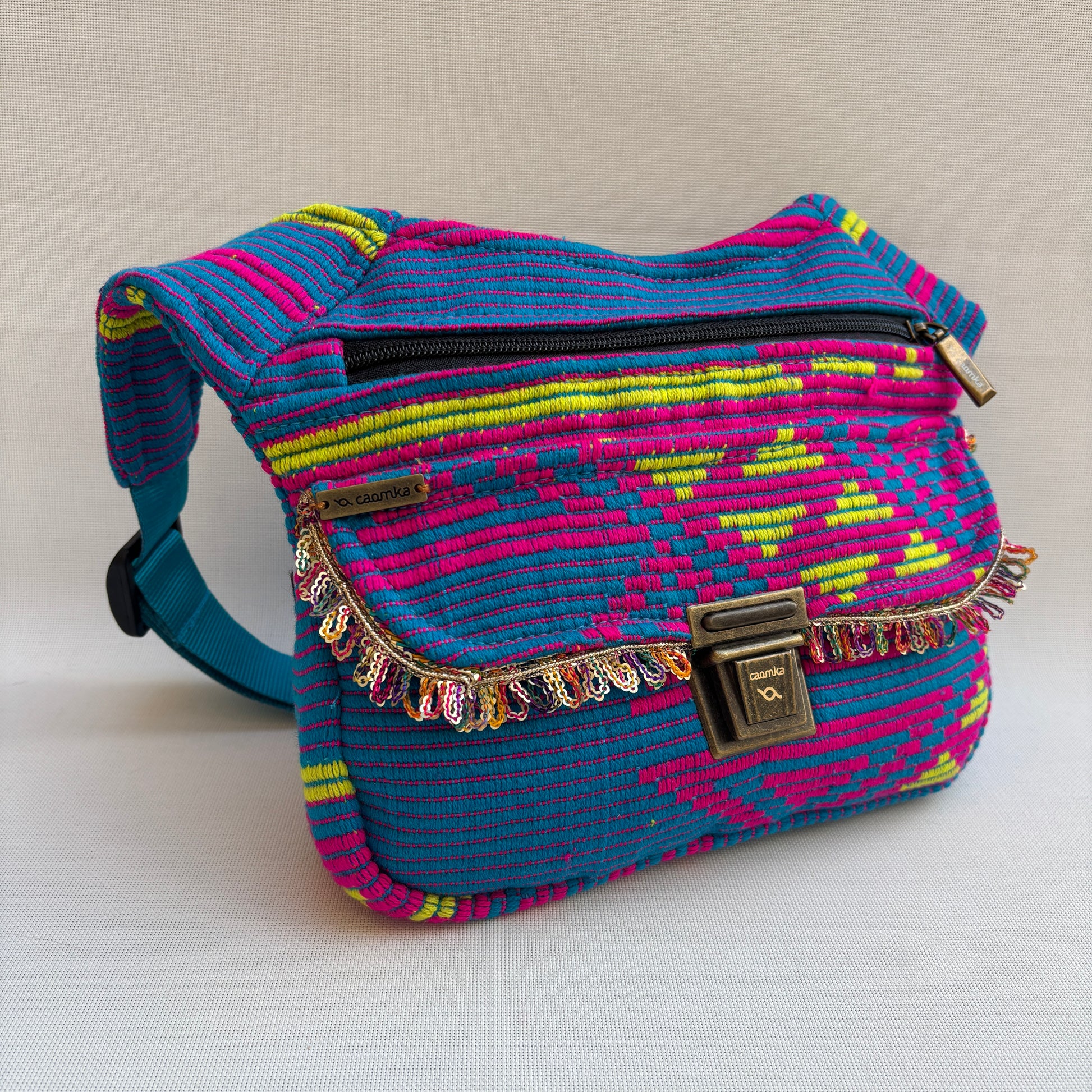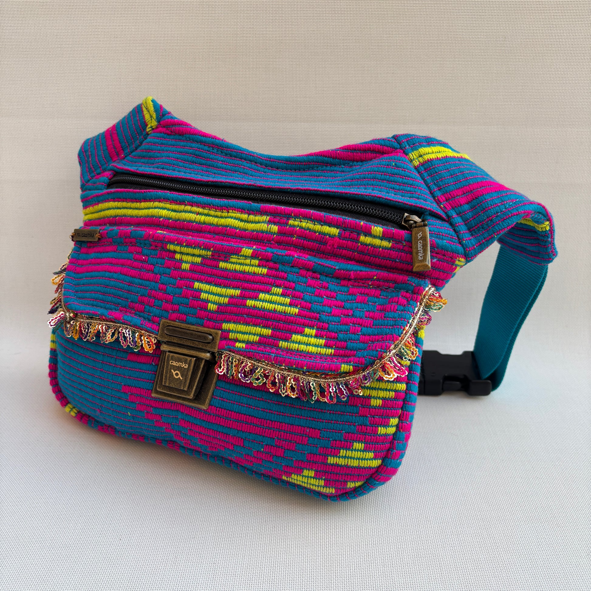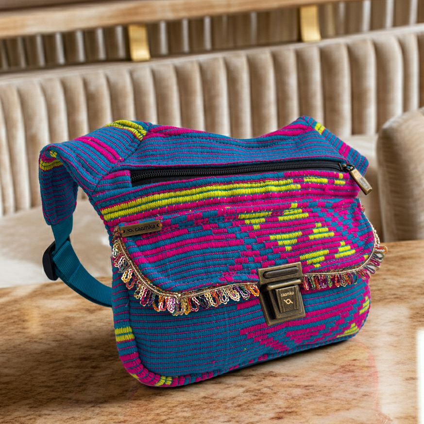 La Special India Extrem 18422 es una riñonera potente y expresiva, confeccionada con un tejido artesanal de inspiración india que combina franjas y patrones en tonos turquesa, fucsia y amarillo.