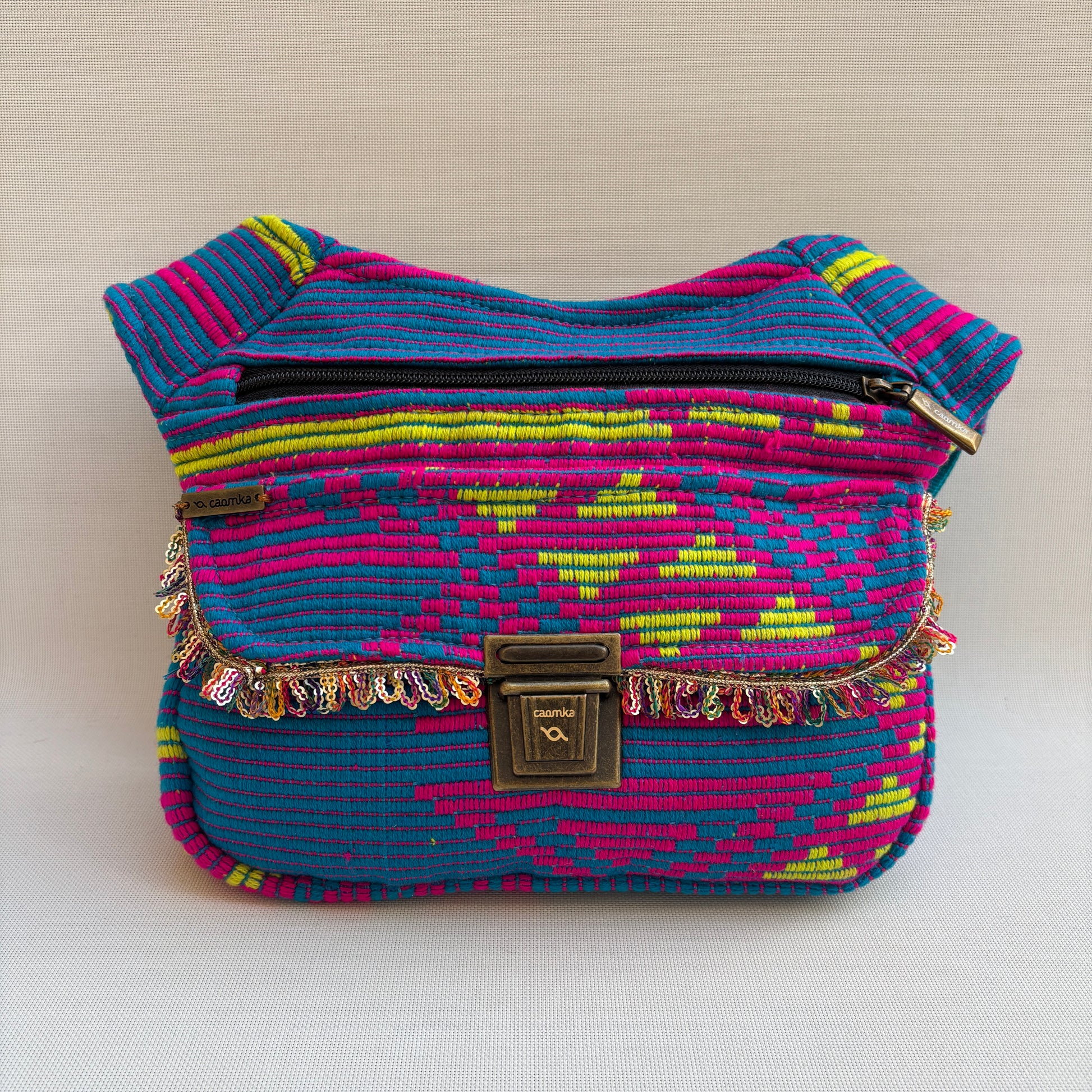 Solapa frontal integrada en el mismo tejido, decorada con flecos multicolor que aportan movimiento y personalidad.